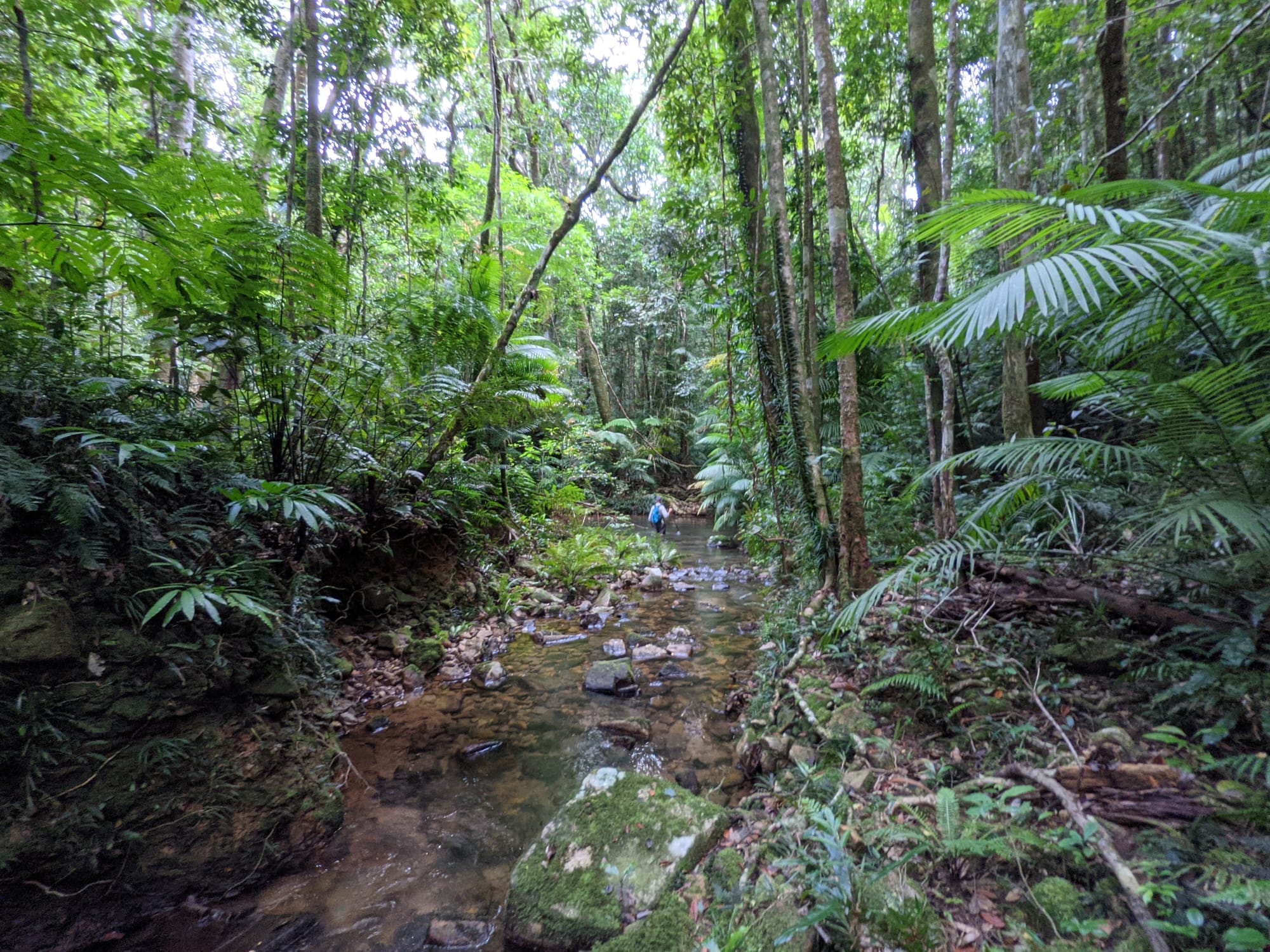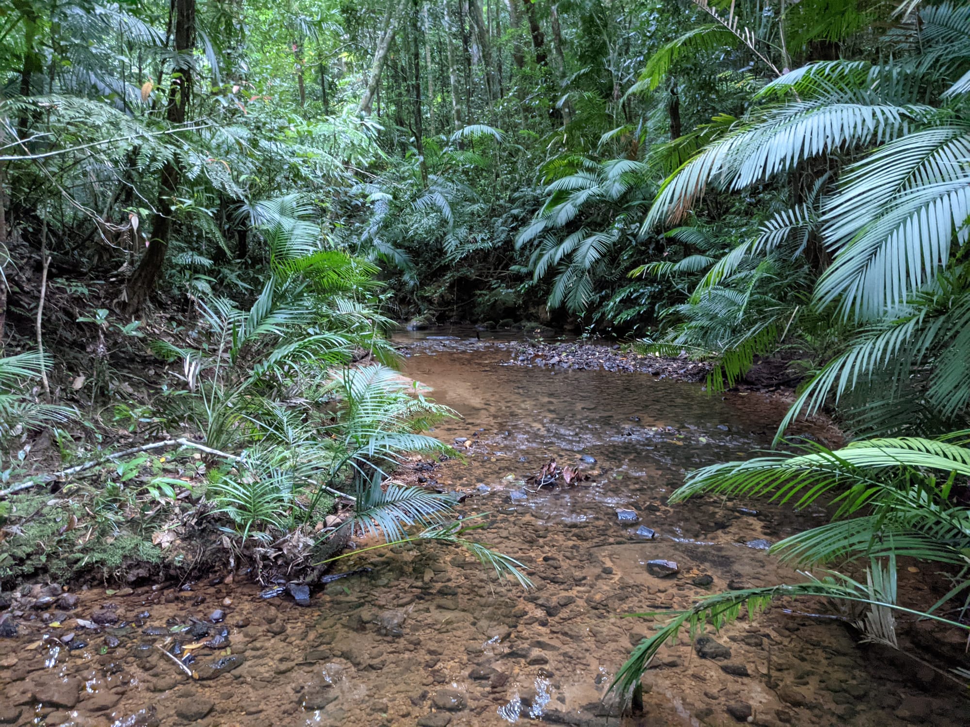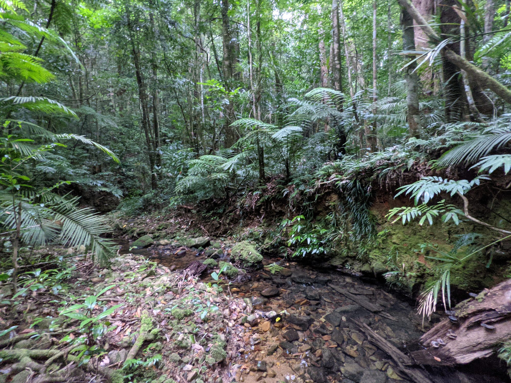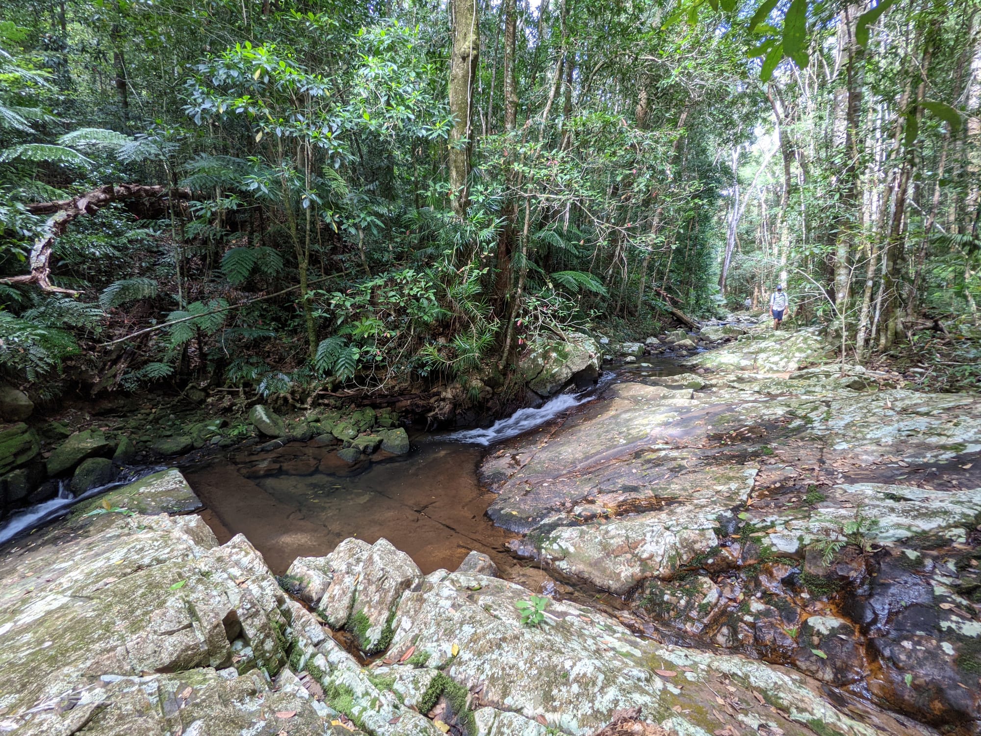 The upper section of Echo Creek is pure rainforest. Ferns crowd the banks. Moss blankets rocks. The creek bed is a mix of sand, small stones, and granite slabs. The water was clear and flowing gently - not roaring, not stagnant, just steady.