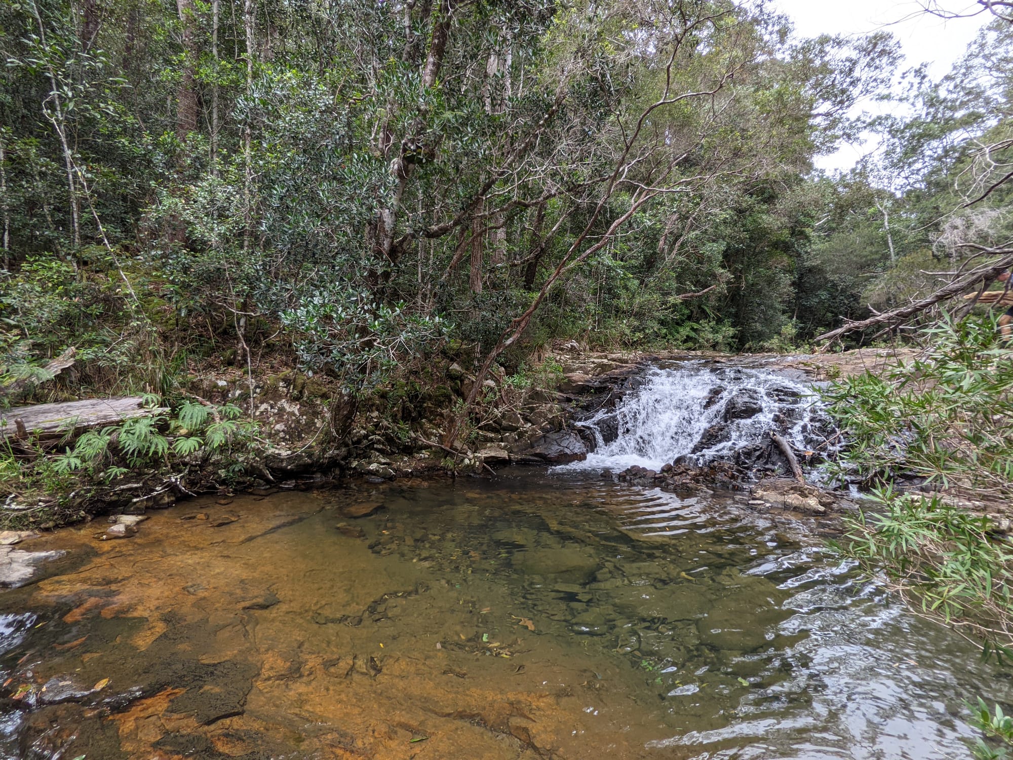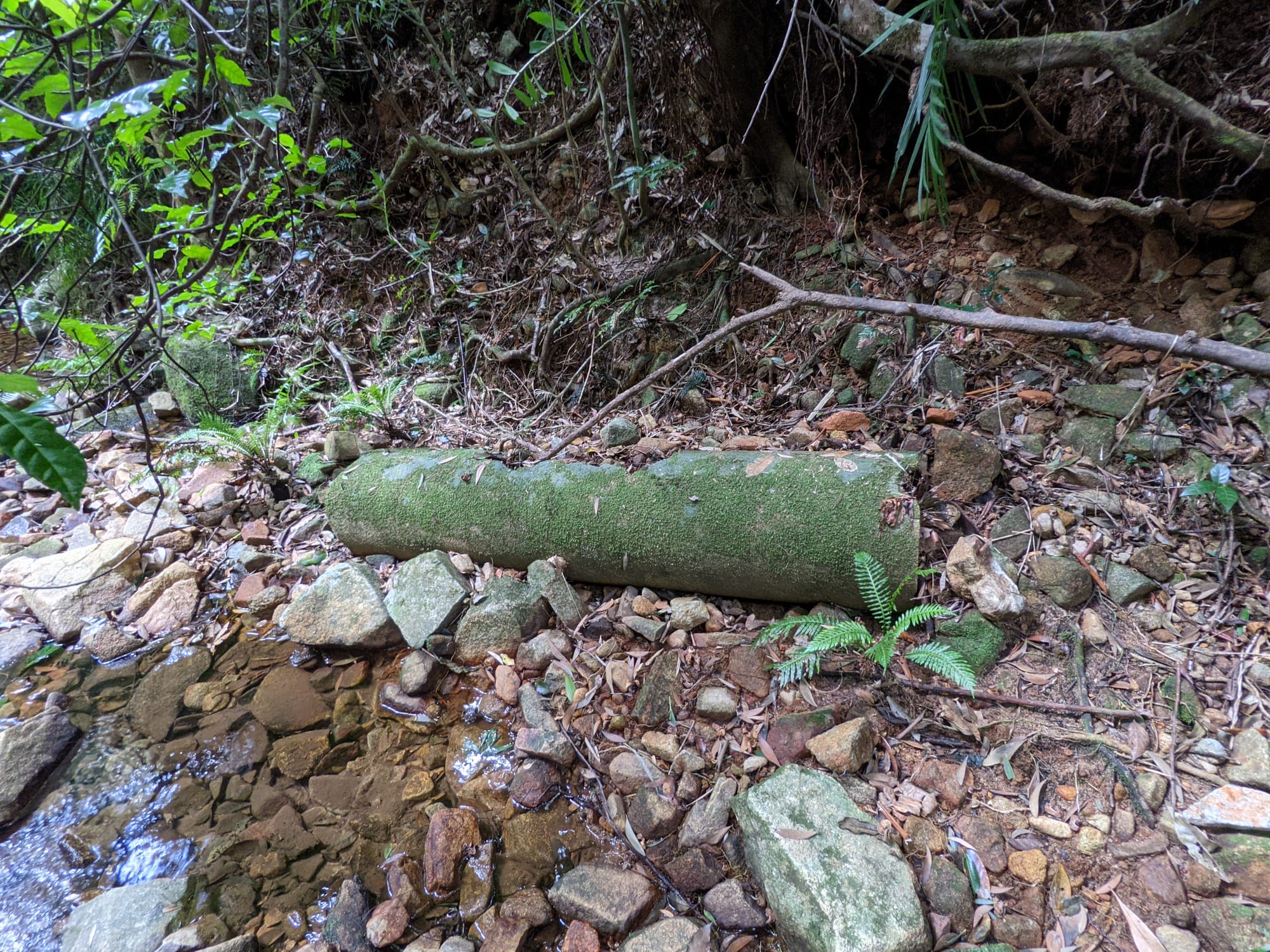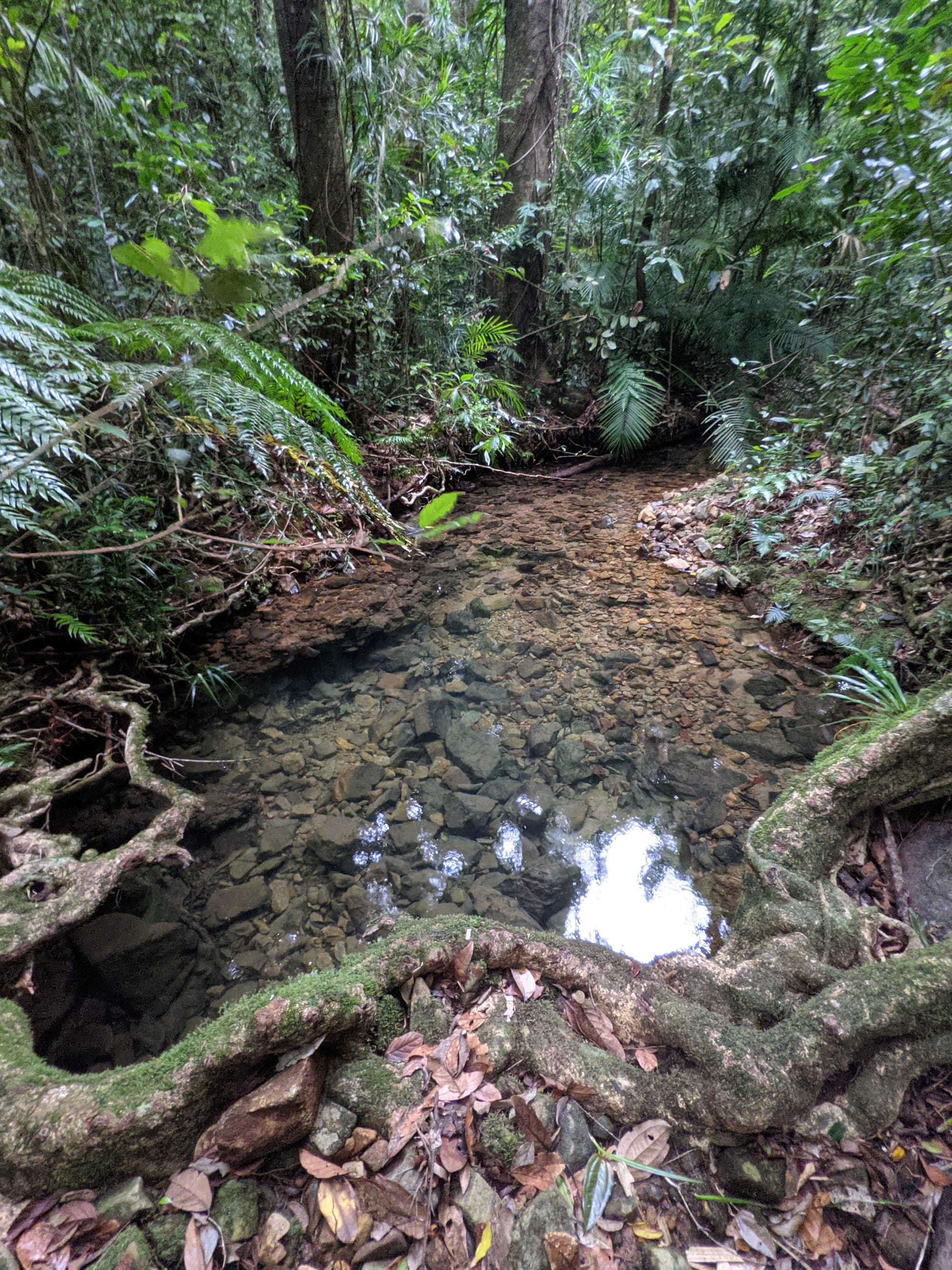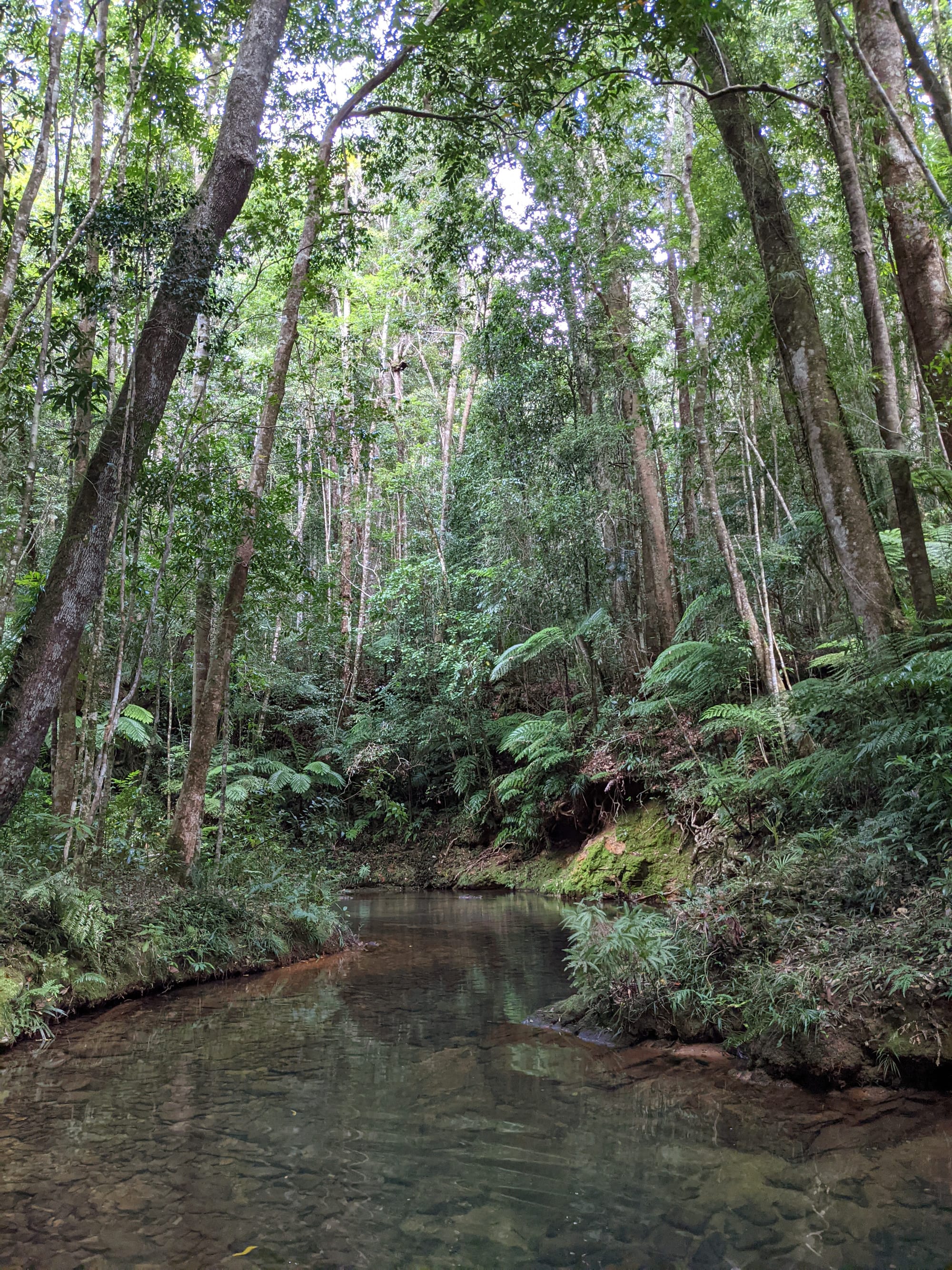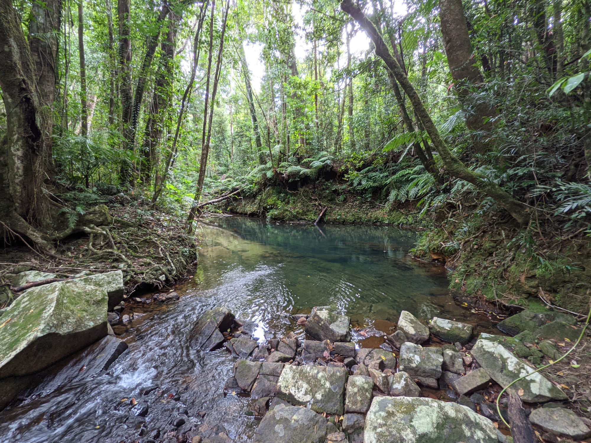 The upper section of Echo Creek is pure rainforest. Ferns crowd the banks. Moss blankets rocks. The creek bed is a mix of sand, small stones, and granite slabs. The water was clear and flowing gently - not roaring, not stagnant, just steady.
