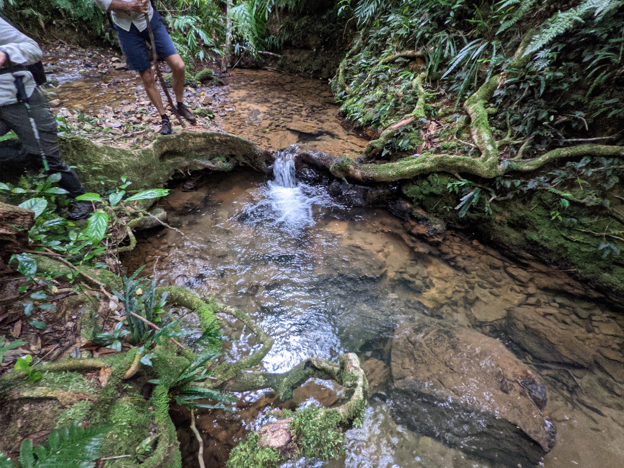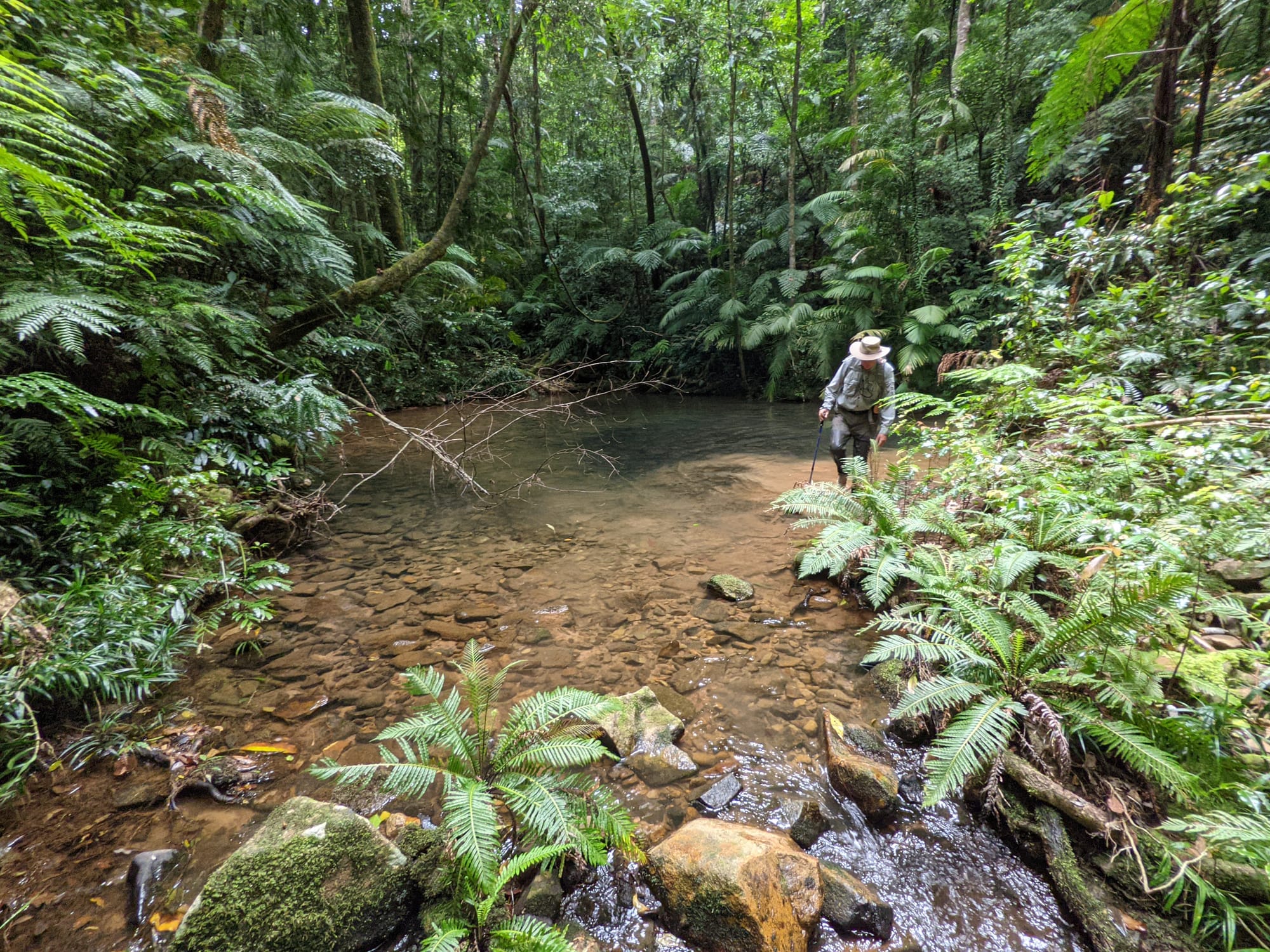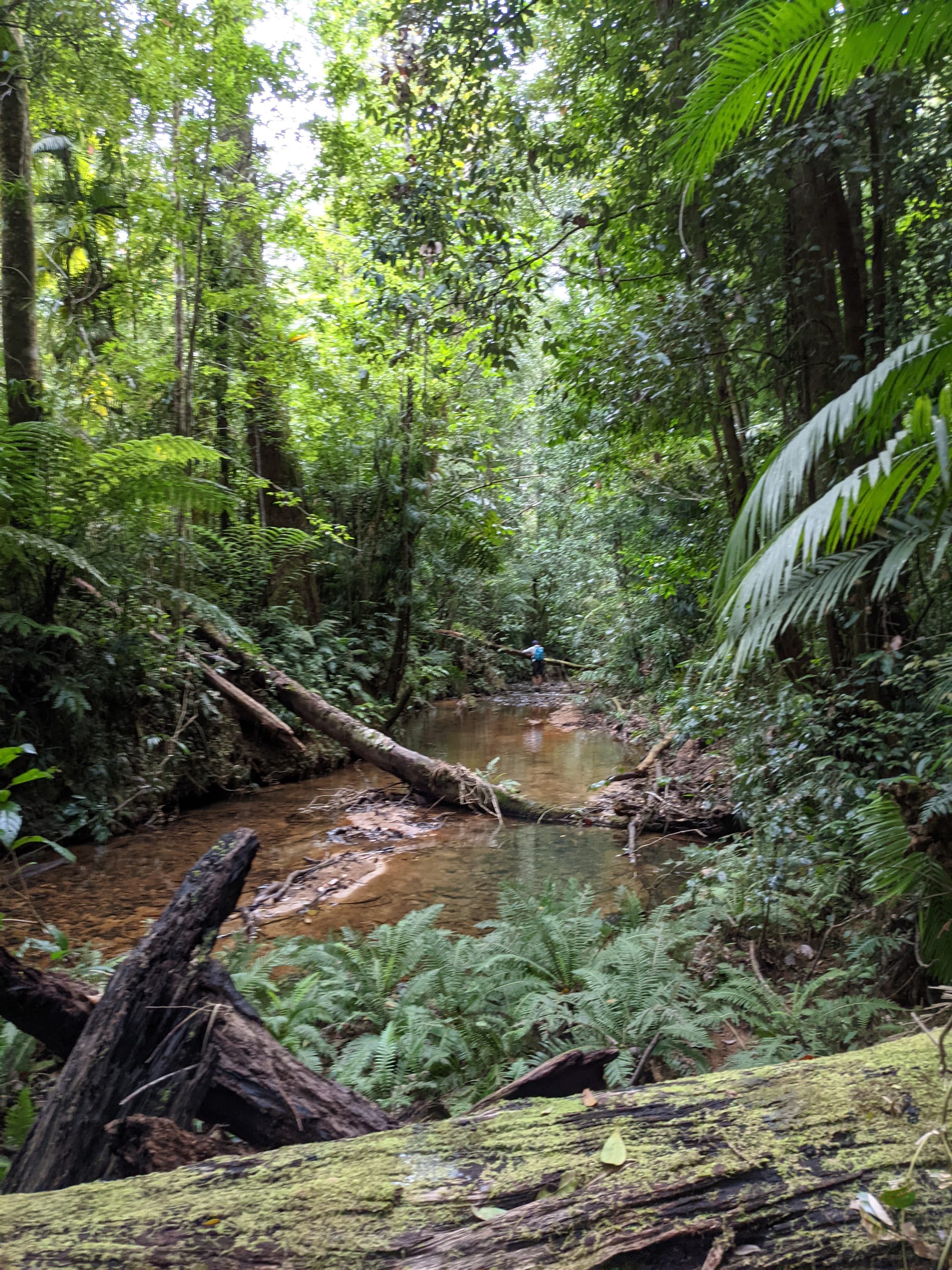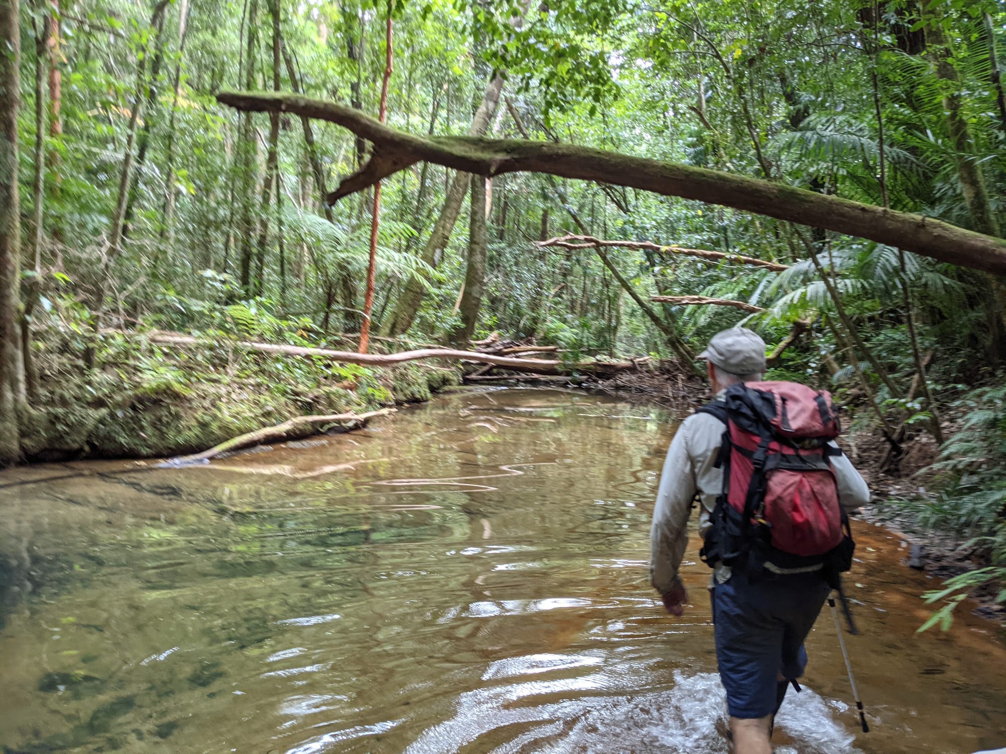 The vegetation here is dense, and the stream is windy. We pushed through wait-a-while in sections and found ourselves weaving between tree trunks where the banks narrowed. It felt enclosed and alive - the kind of environment where every surface is green.