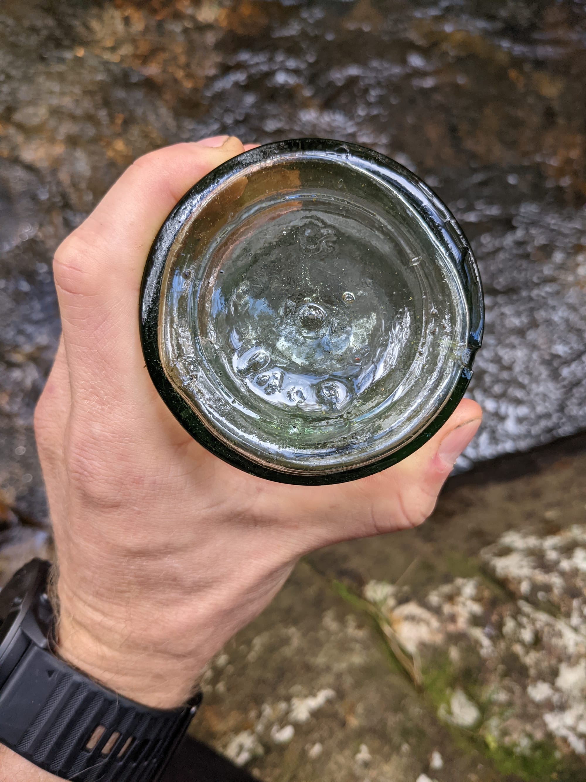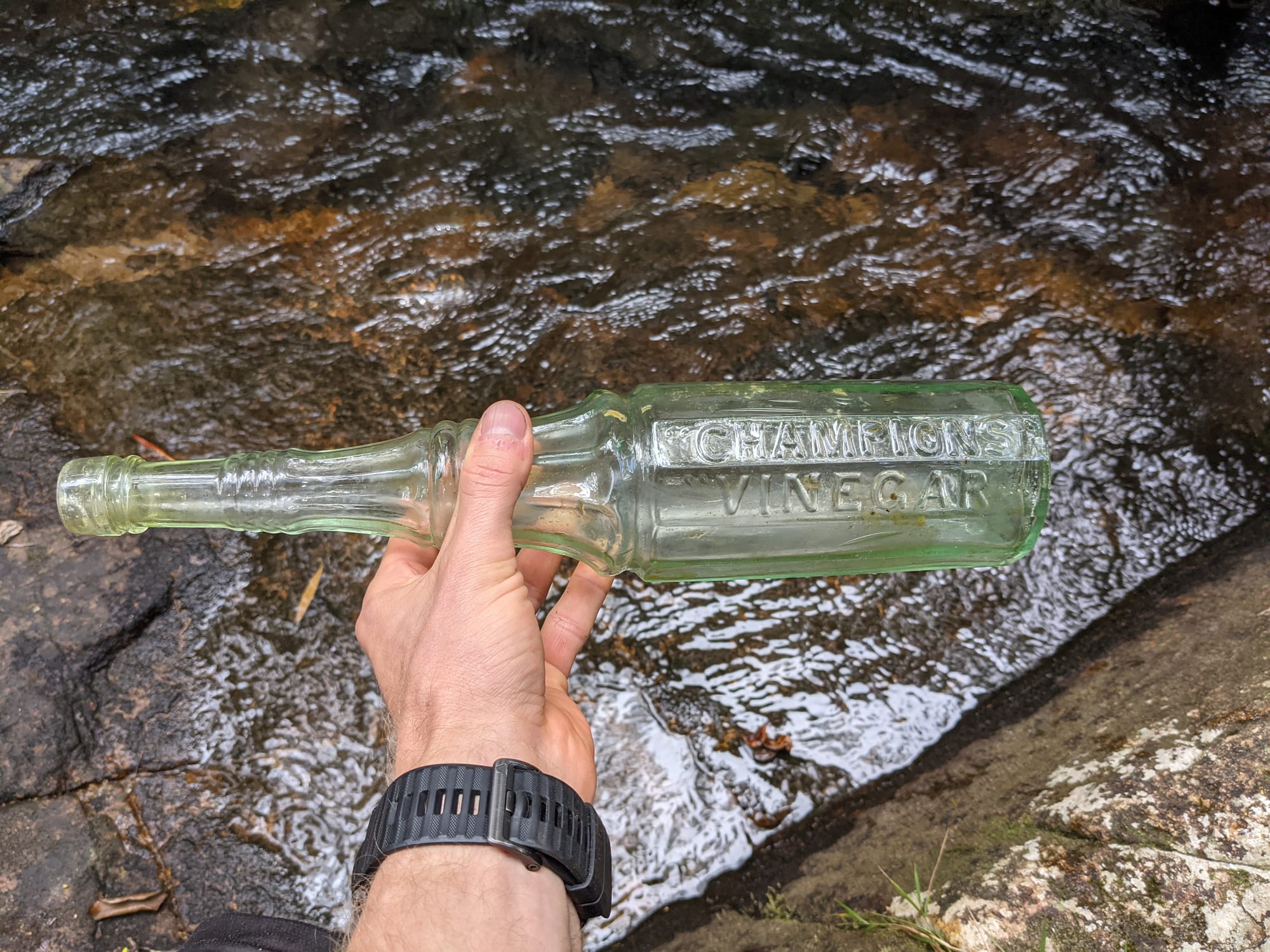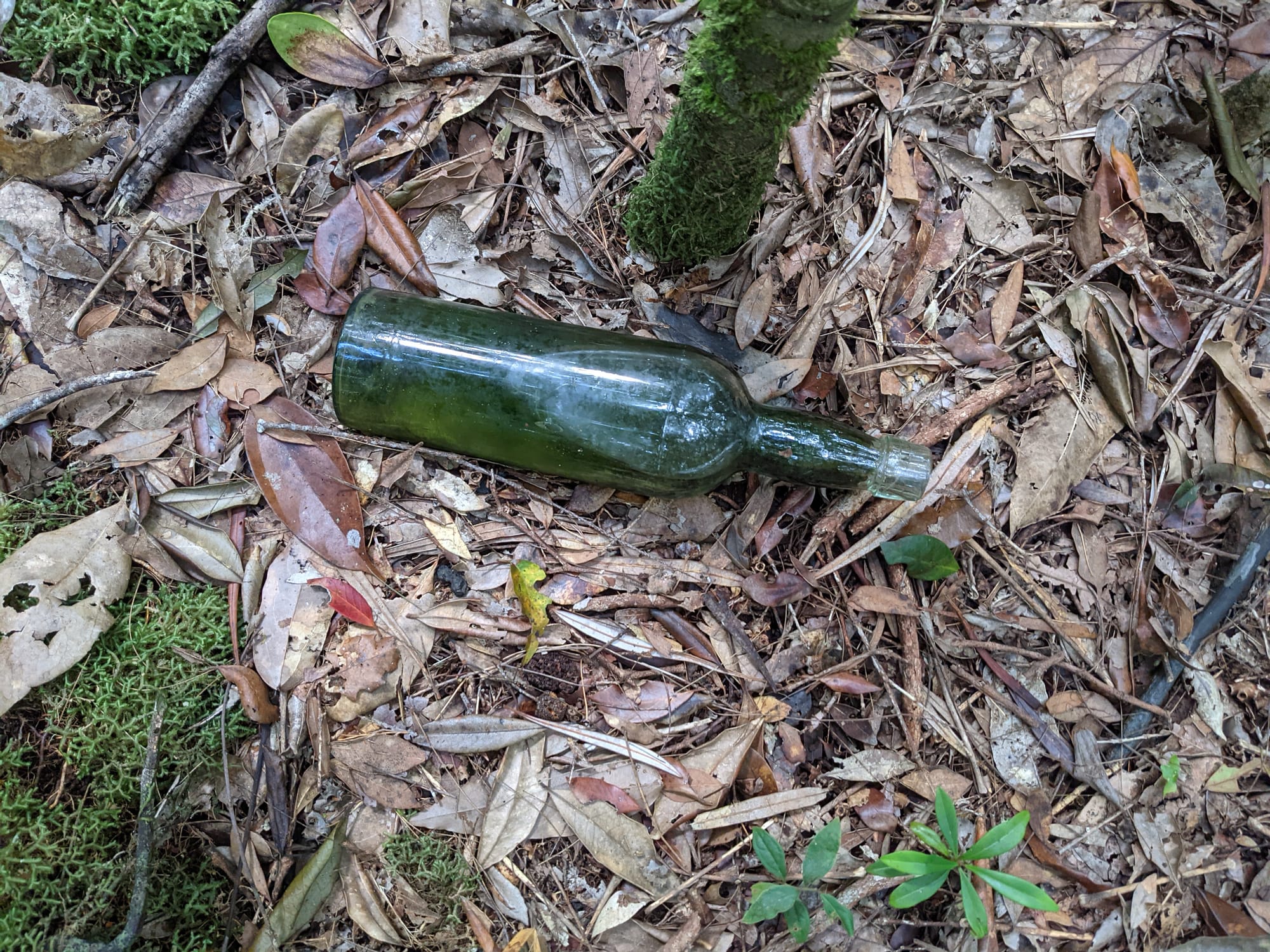 Next to the creek, just before exiting, we came across scattered glass bottles in the leaf litter. Brown and green glass, partially buried, quietly waiting. Among them was a Champion vinegar bottle - the type historically used with bicarb soda to make bread in logging camps. A small, ordinary object that connects you directly to the people who once worked these forests.