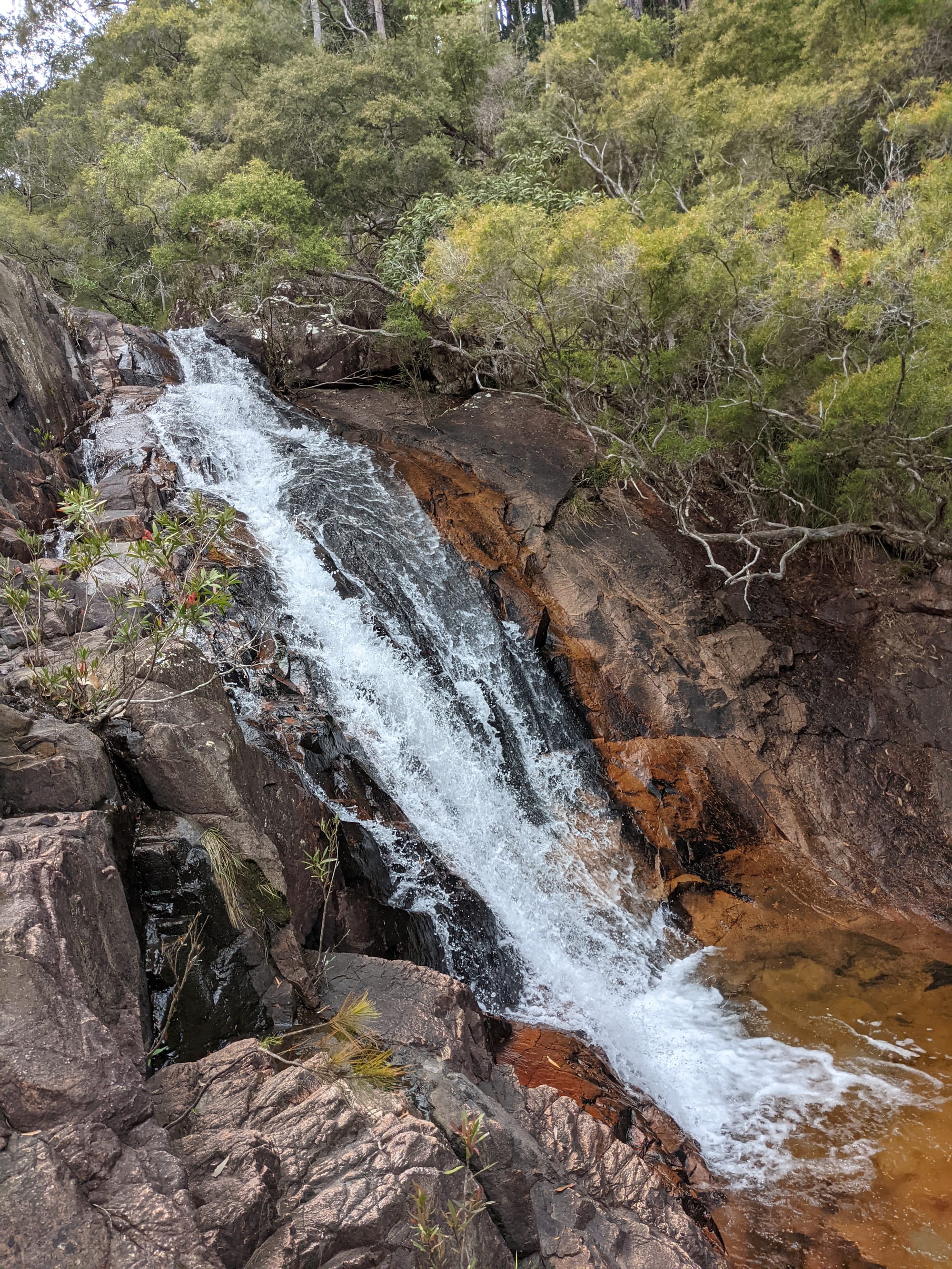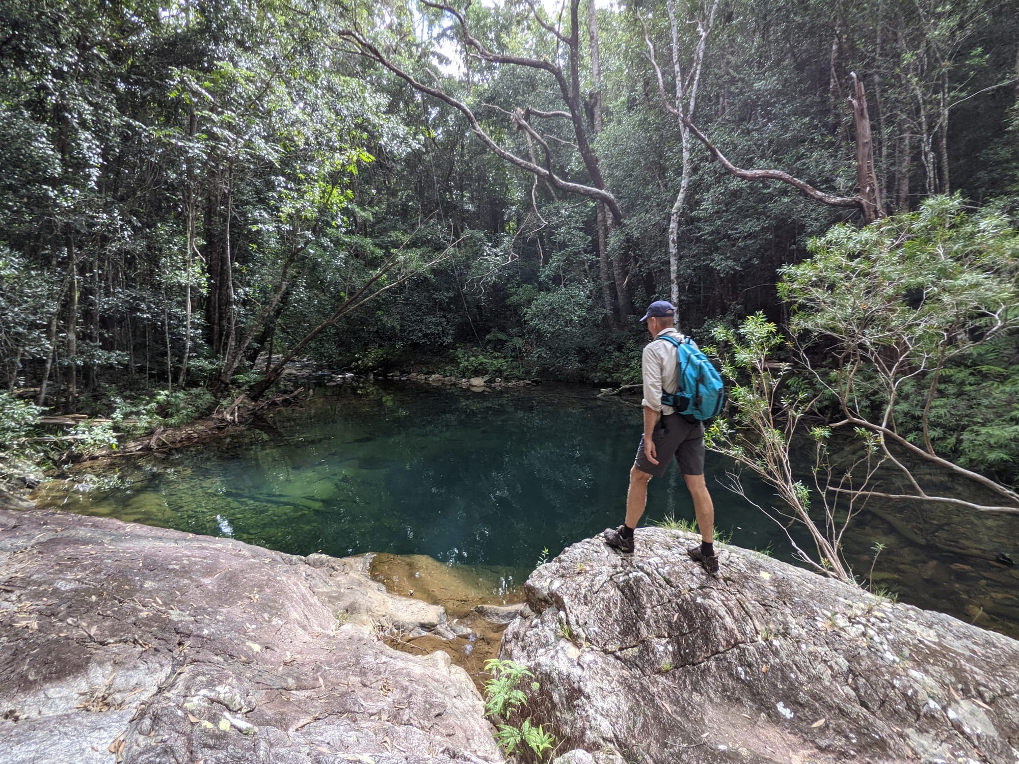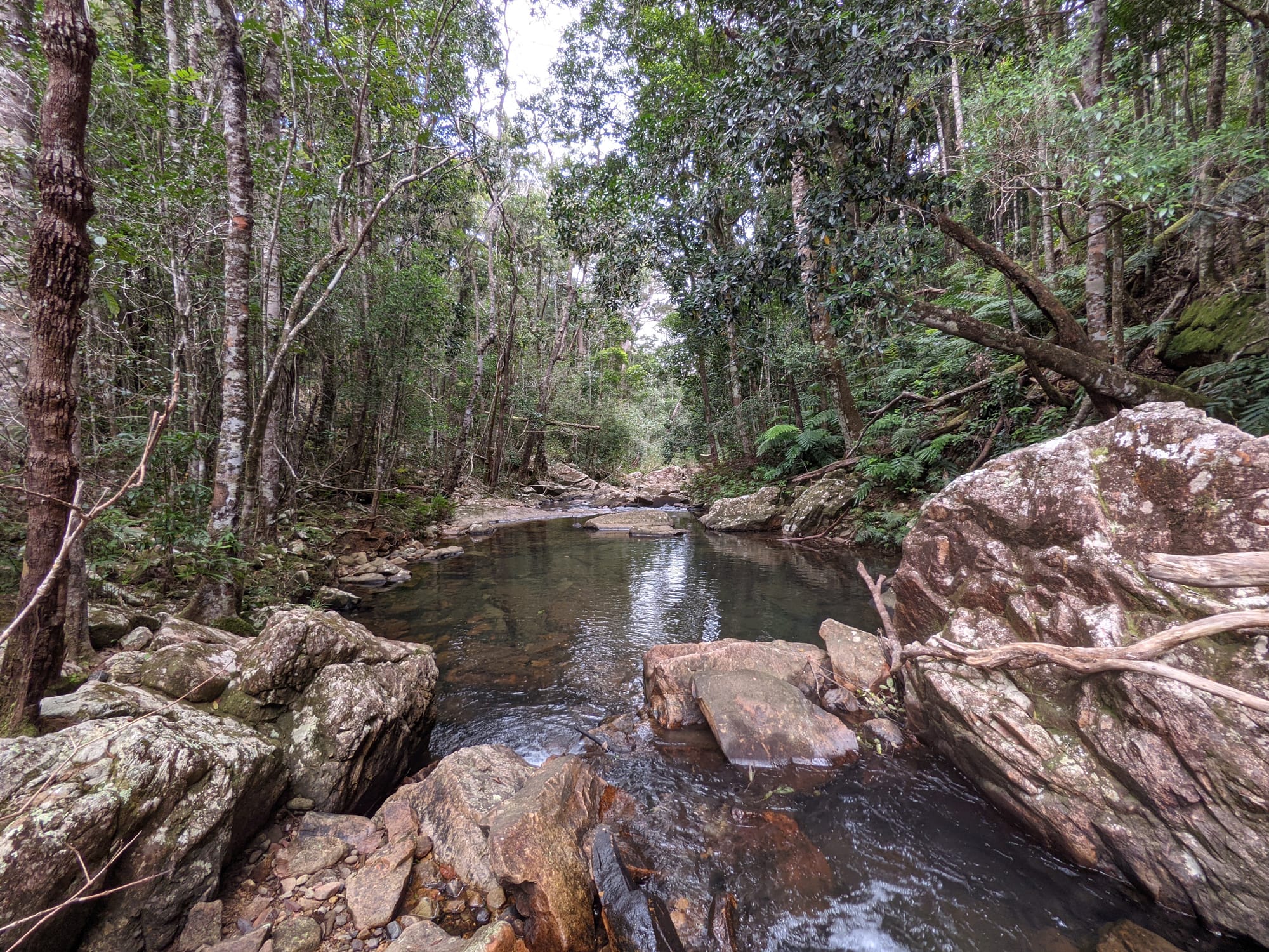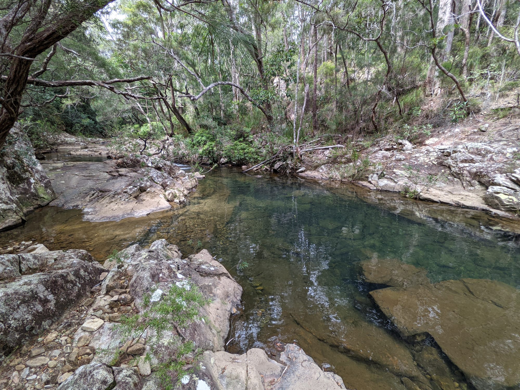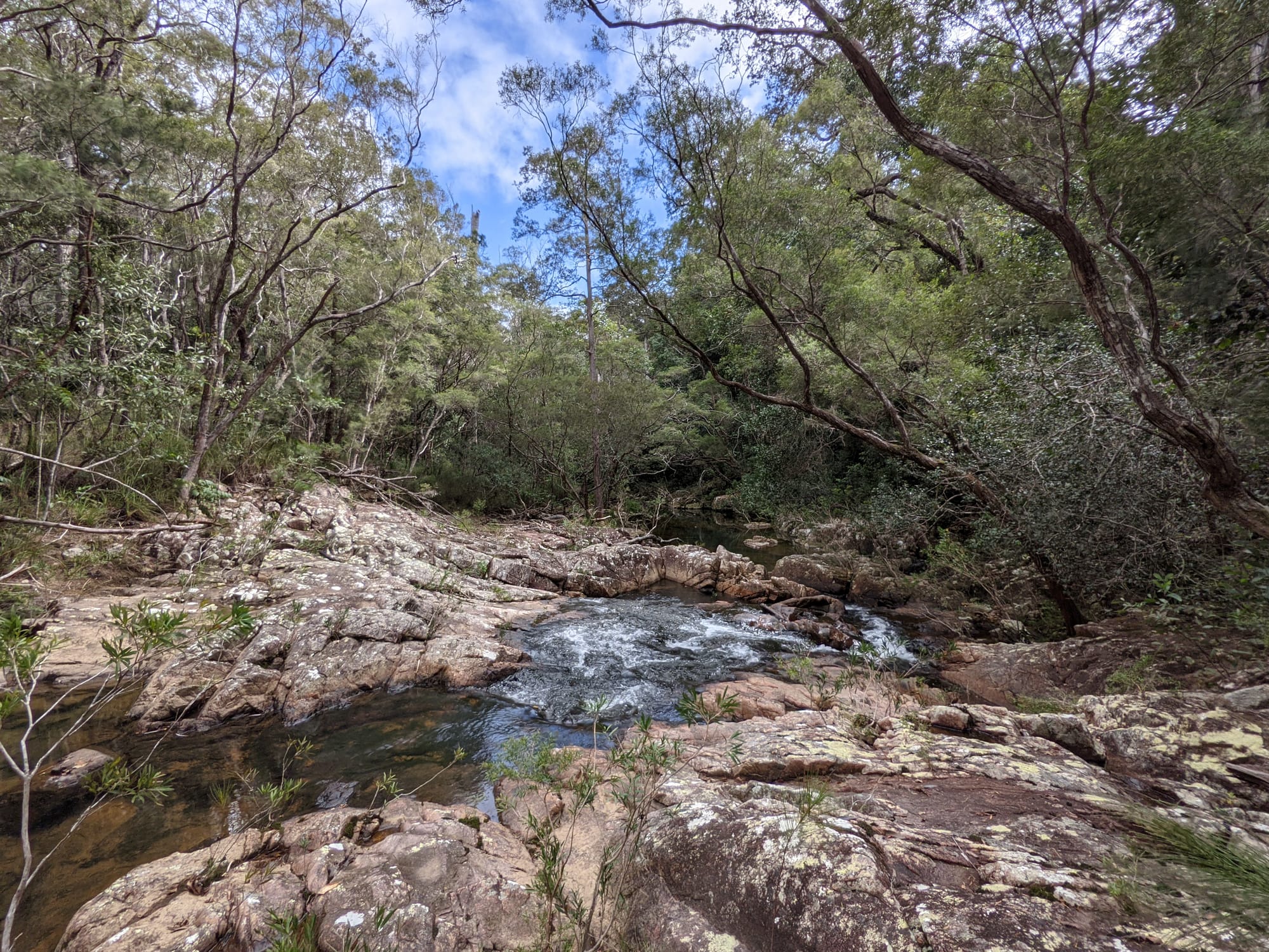 As we continued downstream, the character shifted noticeably. The dense rainforest gave way to more open, scrubby bushland. Granite slabs became more prominent. The creek widened and flattened in places, with sandy patches and shallow pools.