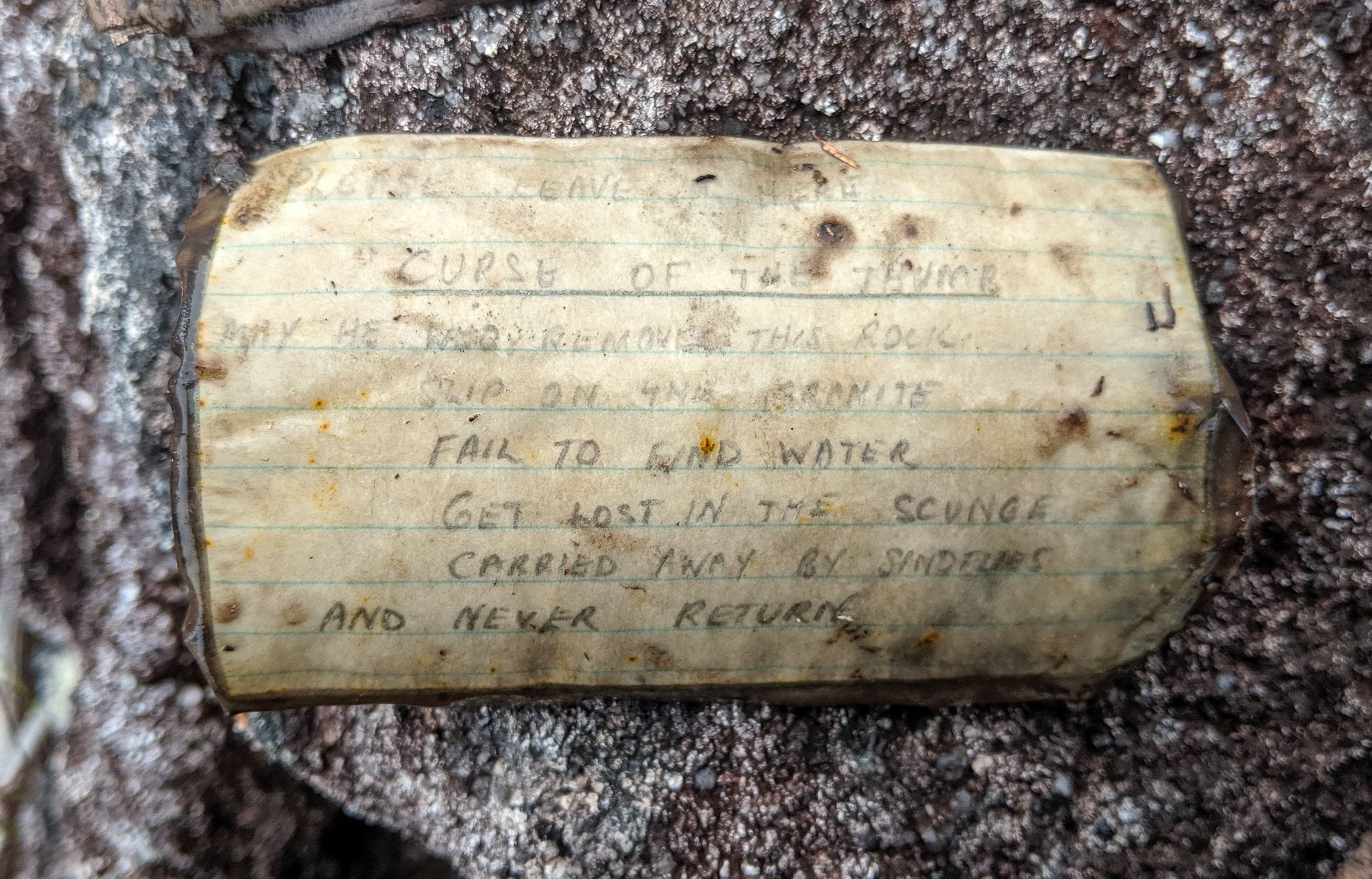 "May he who remove this rock slip on the granite, fail to find water, get lost in the scunge, carried away by sandflies, and never return."