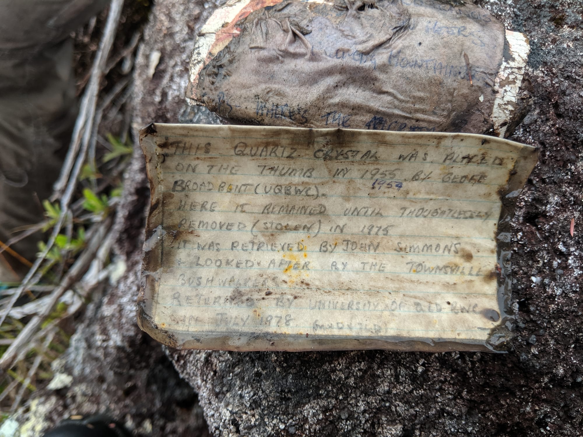 Recognising its significance, the Townsville Bushwalking Club took custody of the crystal. In July 1978, members of the UQBWC returned it to the summit, restoring the original symbol of that 1953 climb. A humorous but pointed note, now known as the “Curse of The Thumb,” was also left behind:
