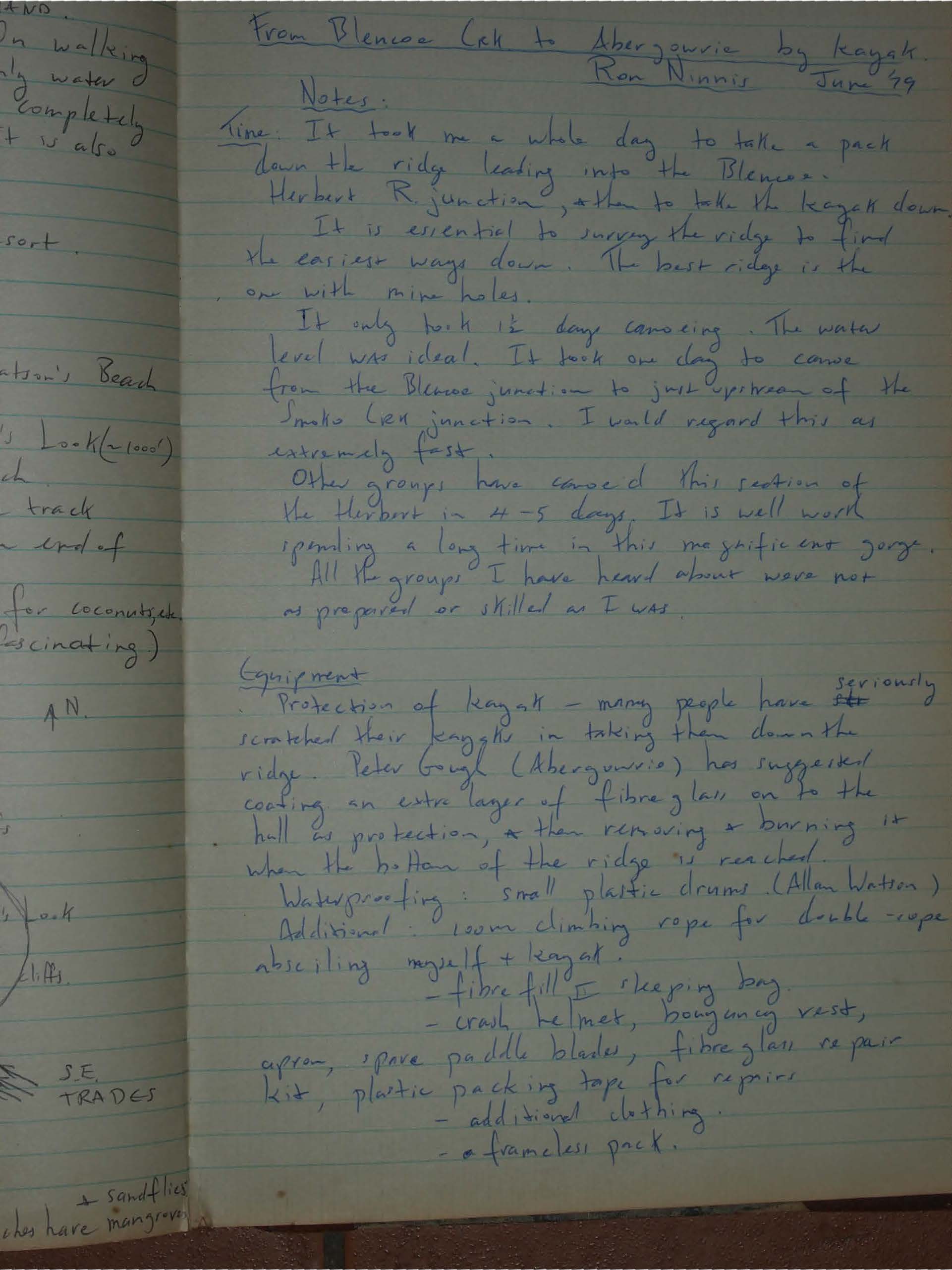 Protection of kayak - many people have seriously scratched their kayaks in taking them down the ridge. Peter Gough (Abergowrie) has suggested coating an extra layer of fibreglass on to the hull as protection, & then removing & burning it when the bottom of the ridge is reached.