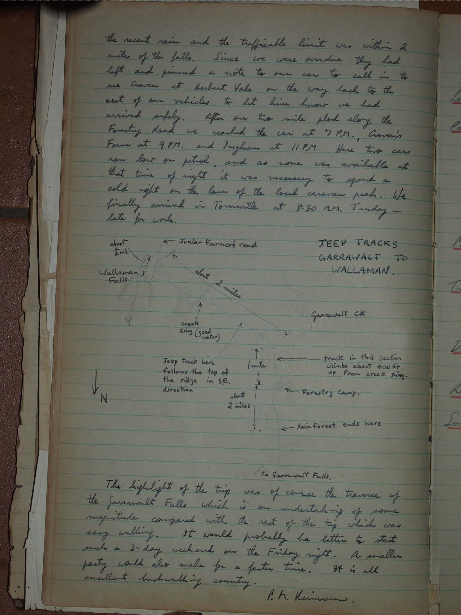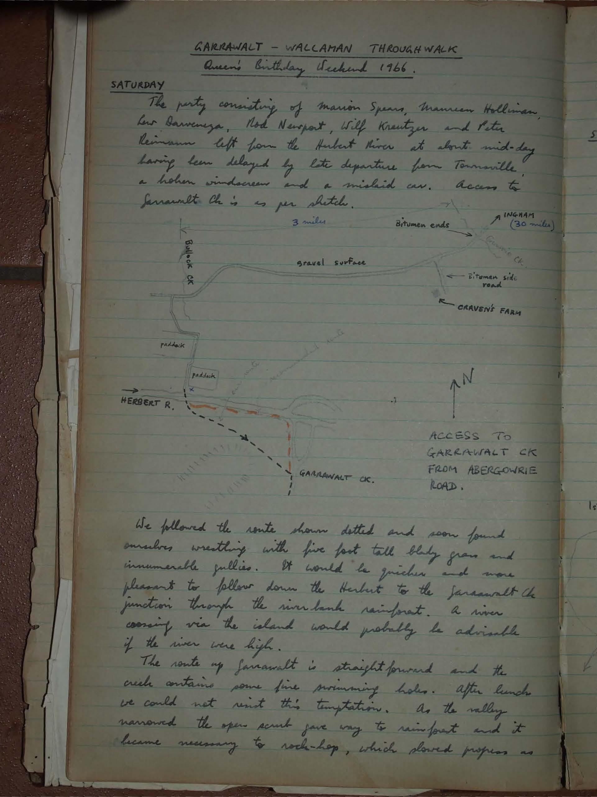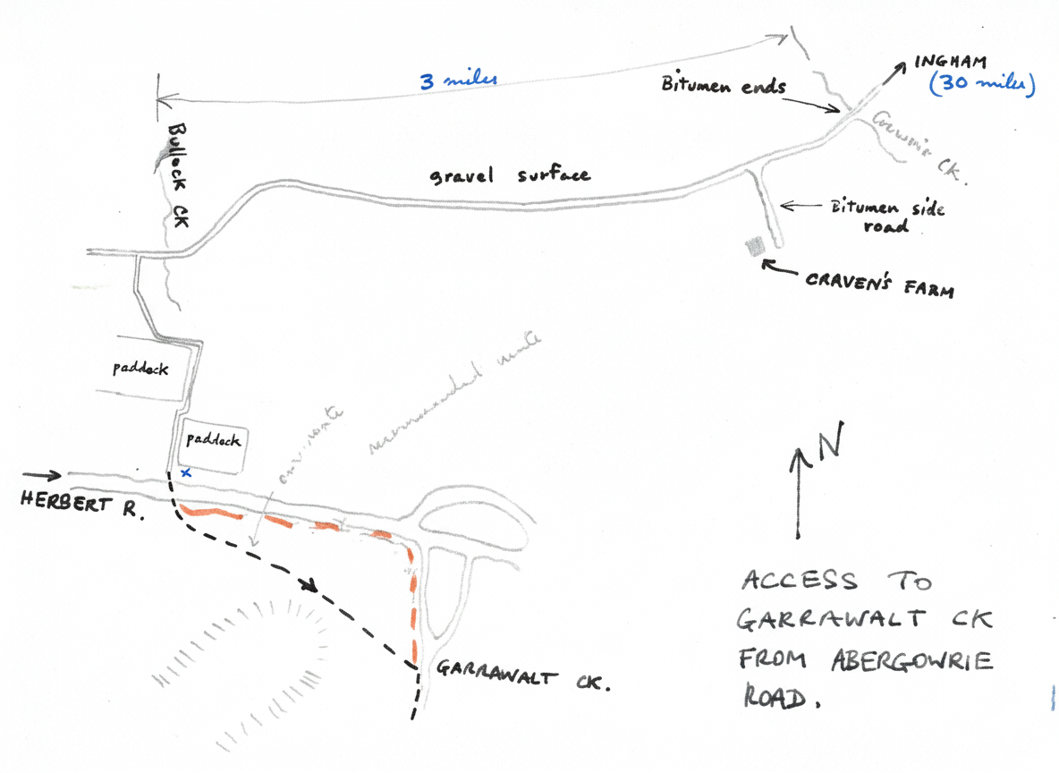The party consisting of marion Spiers, maureen Holliman, Len D'arveniza, Rod Newport, Wilf Kreutzer and Peter Reimann left from the Herbert River at about mid-day having been delayed by late departure from Townsville, a broken windscreen and a mislaid car. Access to Garrawalt Ck is as per sketch.
