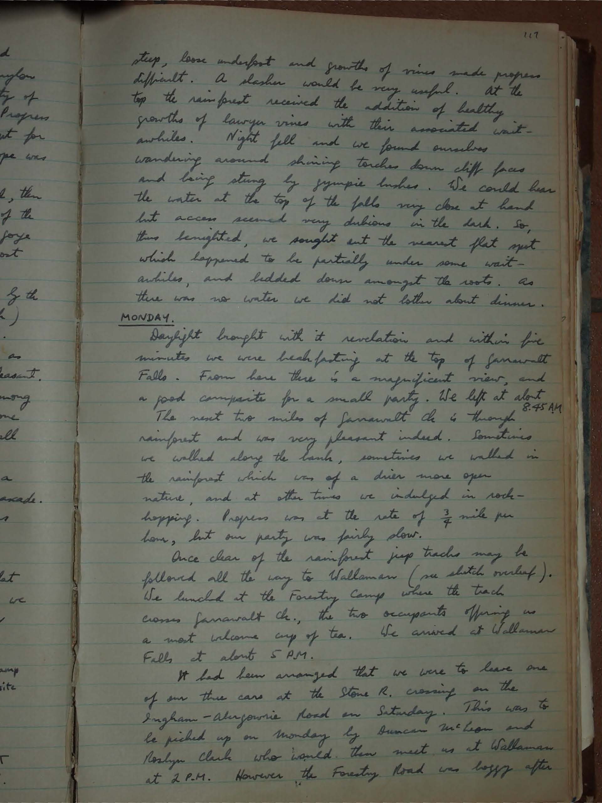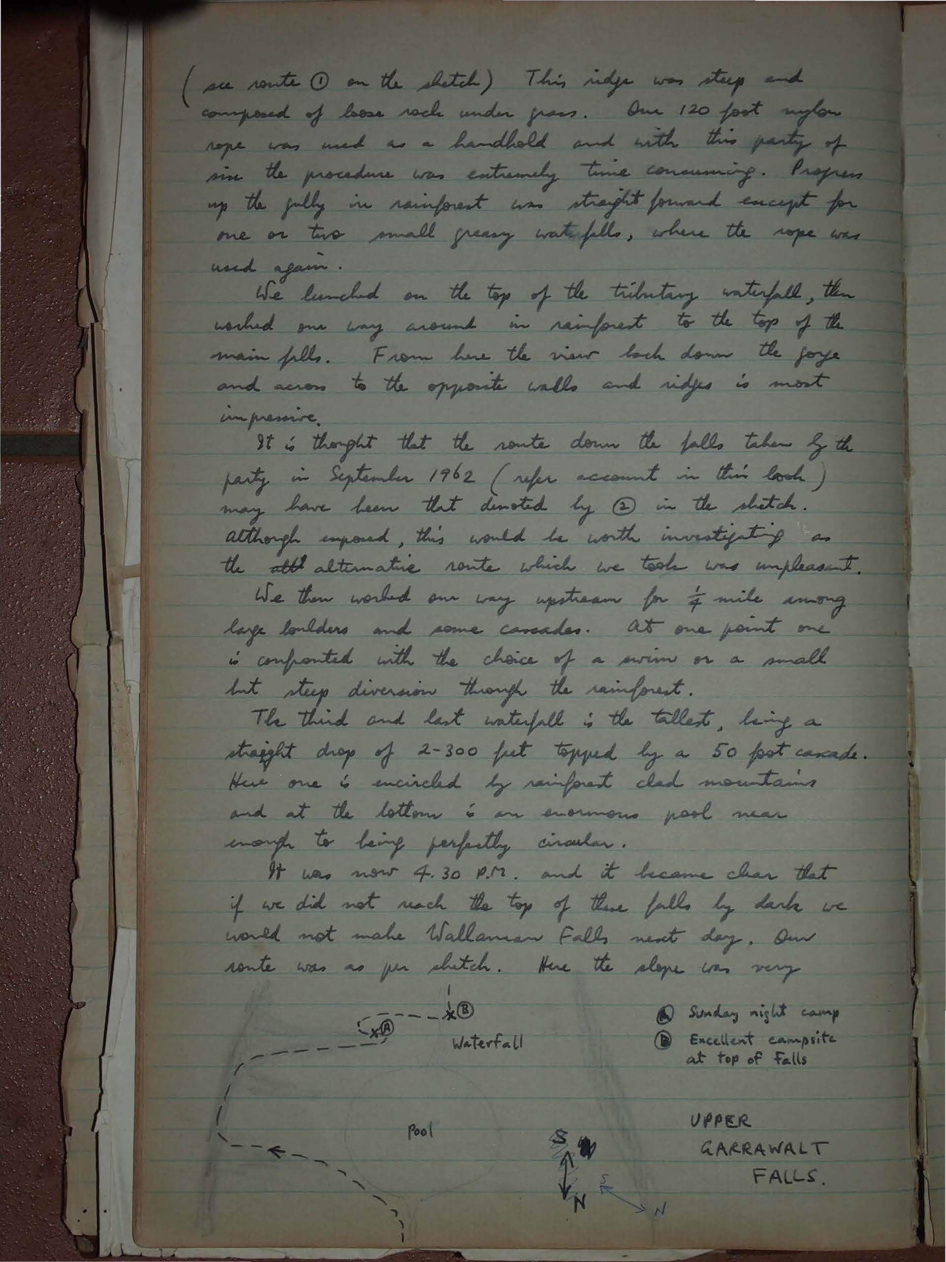 It was now 4.30 P.M. and it became clear that if we did not reach the top of these falls by dark we would not make Wallaman Falls next day. Our route was as per sketch.