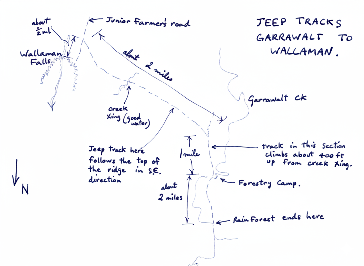 Once clear of the rainforest jeep tracks may be followed all the way to Wallaman (see sketch overleaf). We lunched at the Forestry Camp where the track crosses Garrawalt Ck., the two occupants offering us a most welcome cup of tea. We arrived at Wallaman Falls at about 5 P.M.