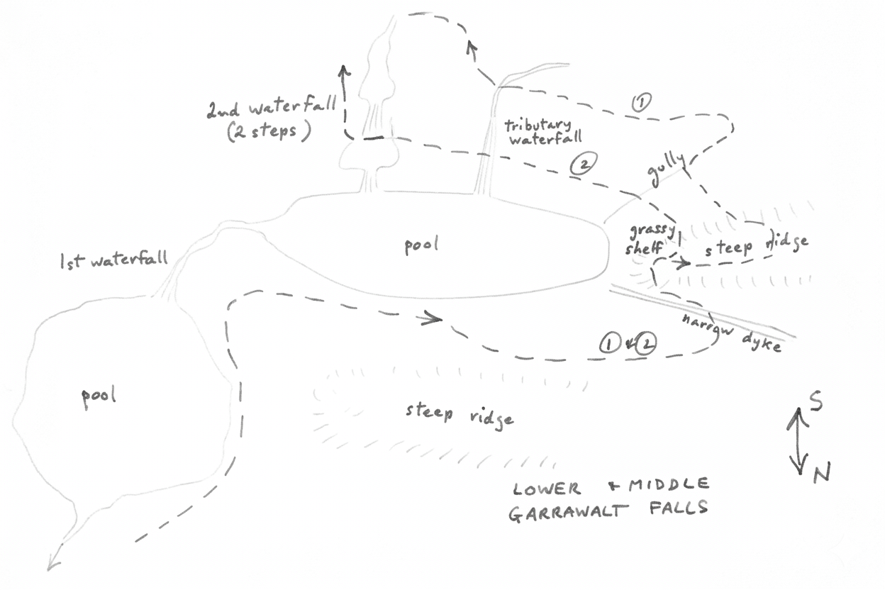 It is thought that the route down the falls taken by the party in September 1962 (refer account in this book) may have been that denoted by ② in the sketch. Although exposed, this would be worth investigating as the other alternative route which we took was unpleasant.