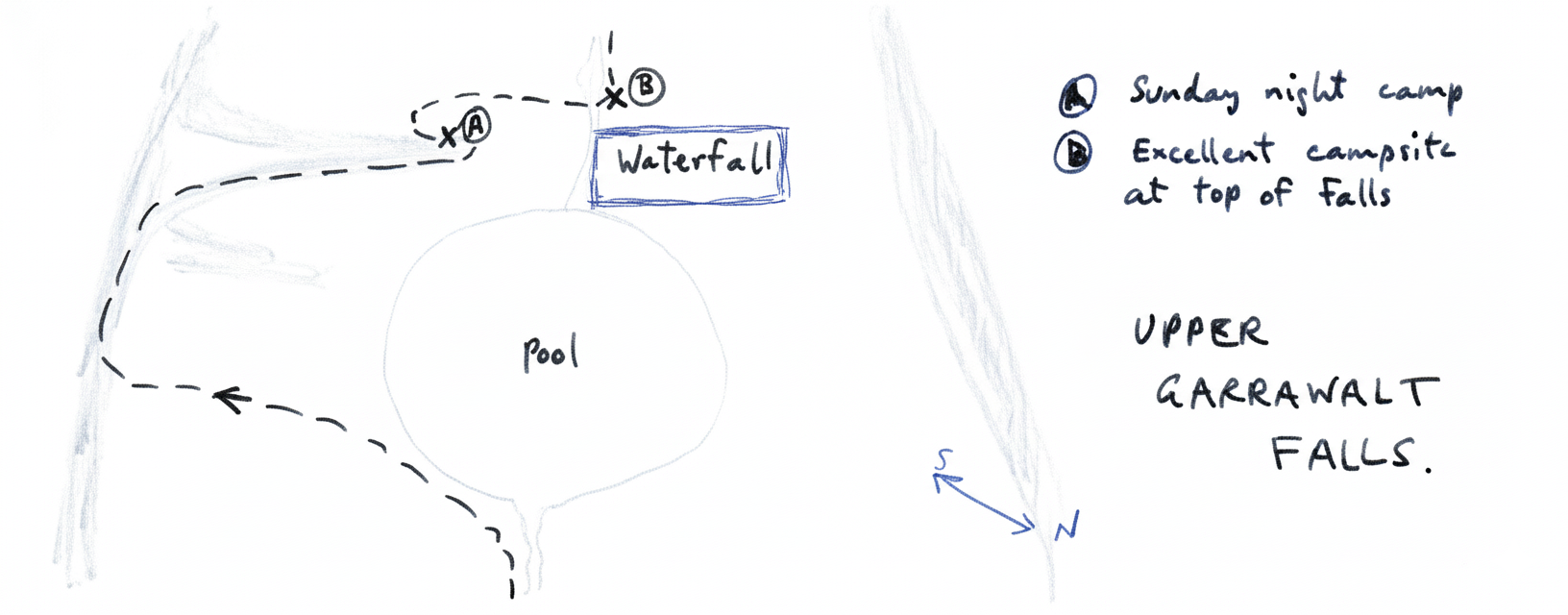 The highlight of the trip was of course the traverse of the Garrawalt Falls which is an undertaking of some magnitude compared with the rest of the trip which was easy walking. It would probably be better to start such a 3-day weekend on the Friday night. A smaller party would also make for a faster time. It is all excellent bushwalking country.