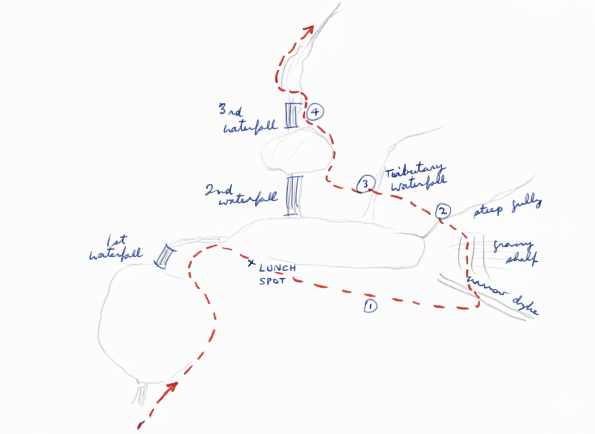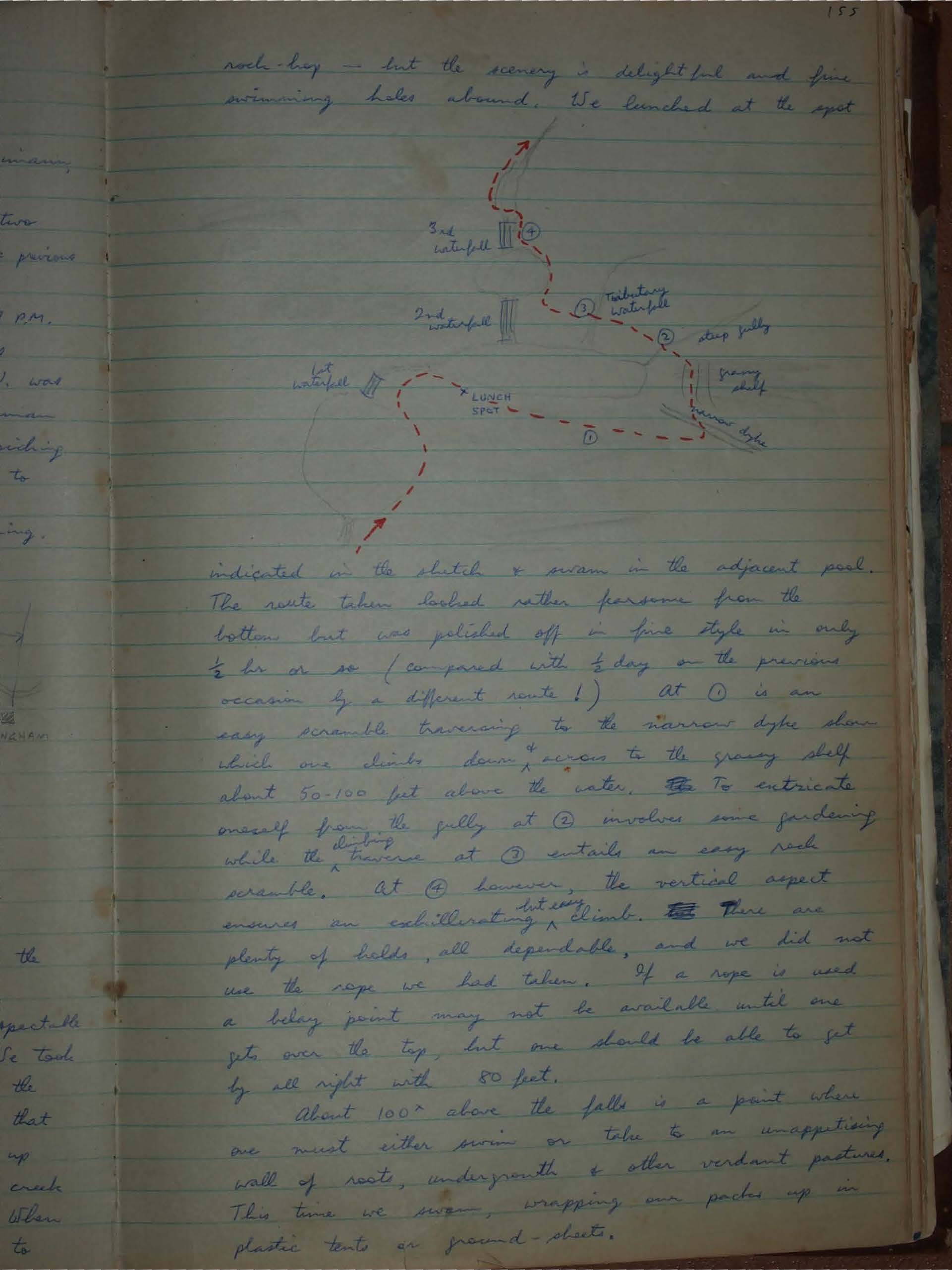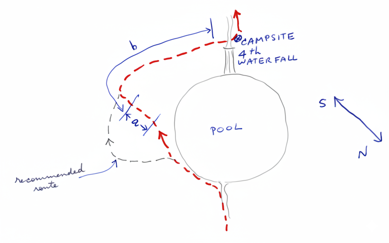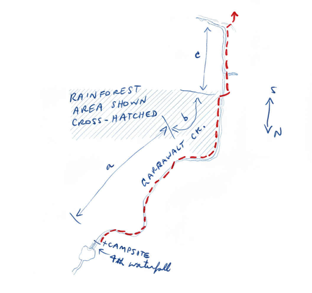 The last waterfall duly arrived & we took the route indicated. It looked quite harmless from the bottom, but we soon found ourselves doing desperate feats of gymnastics clutching at roots on the side of vertical cliffs, clawing at vegetation which came out and being mercilessly stung by the gympie bushes (refer section "a"). However this unprecedented misery did cut short the ensuing battle with the lawyer vines & attendant "wait-a-whiles" to be found in profusion in section "b" above, & in retrospect I would say section "a" is rather dangerous and that the recommended route shown in pencil above (which is also fairly ghastly) should be taken. We arrived at the campsite at about 5-ish.