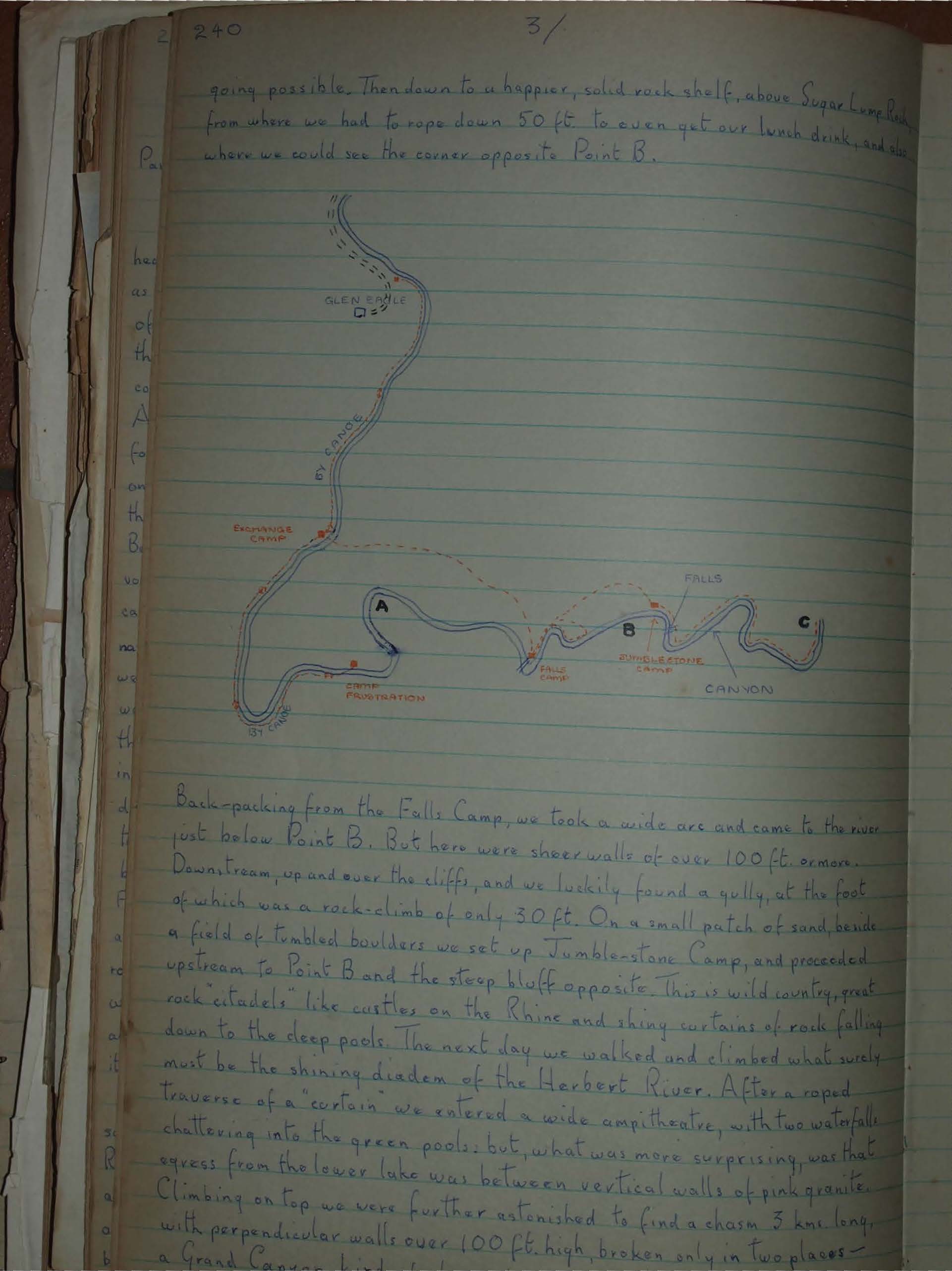 Back-packing from the Falls Camp, we took a wide arc and came to the river just below Point B. But here were sheer walls of over 100 ft. or more. Downstream, up and over the cliffs, and we luckily found a gully, at the foot of which was a rock-climb of only 30 ft. On a small patch of sand, beside a field of tumbled boulders we set up Tumblestone Camp, and proceeded upstream to Point B and the steep bluff opposite. This is wild country, great rock citadels like castles on the Rhine and shiny curtains of rock falling down to the deep pools. The next day we walked and climbed what surely must be the shining diadem of the Herbert River. After a roped traverse of a "curtain" we entered a wide amphitheatre, with two waterfalls chattering into the green pools; but, what was more surprising, was that egress from the lower lake was between vertical walls of pink granite. Climbing on top we were further astonished to find a chasm 3 km. long, with perpendicular walls over 100 ft. high, broken only in two places — a Grand Canyon kind ... TEXT CUT OFF ... Herbert placidly wends its way. We soon came to a curtain impasse.