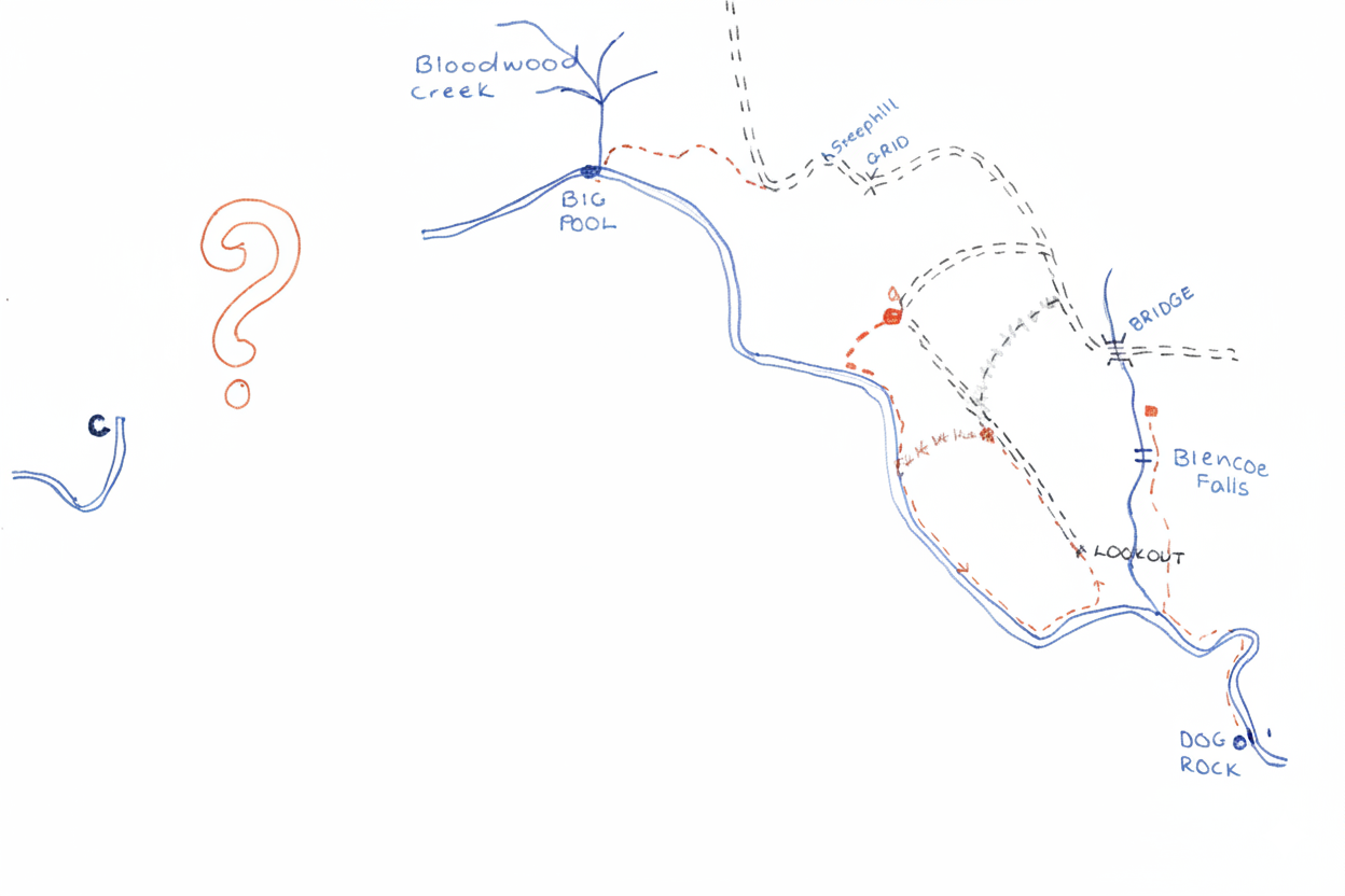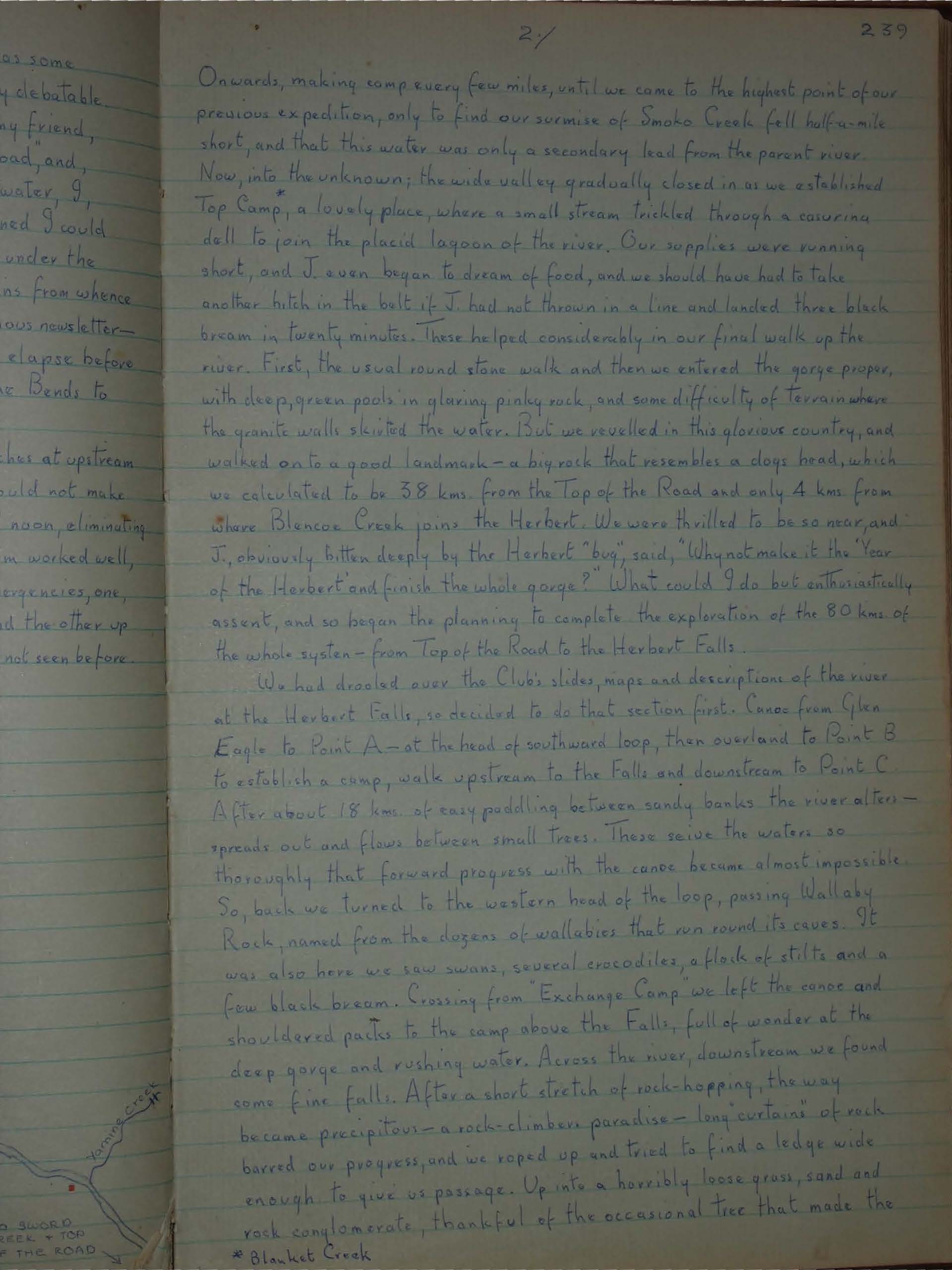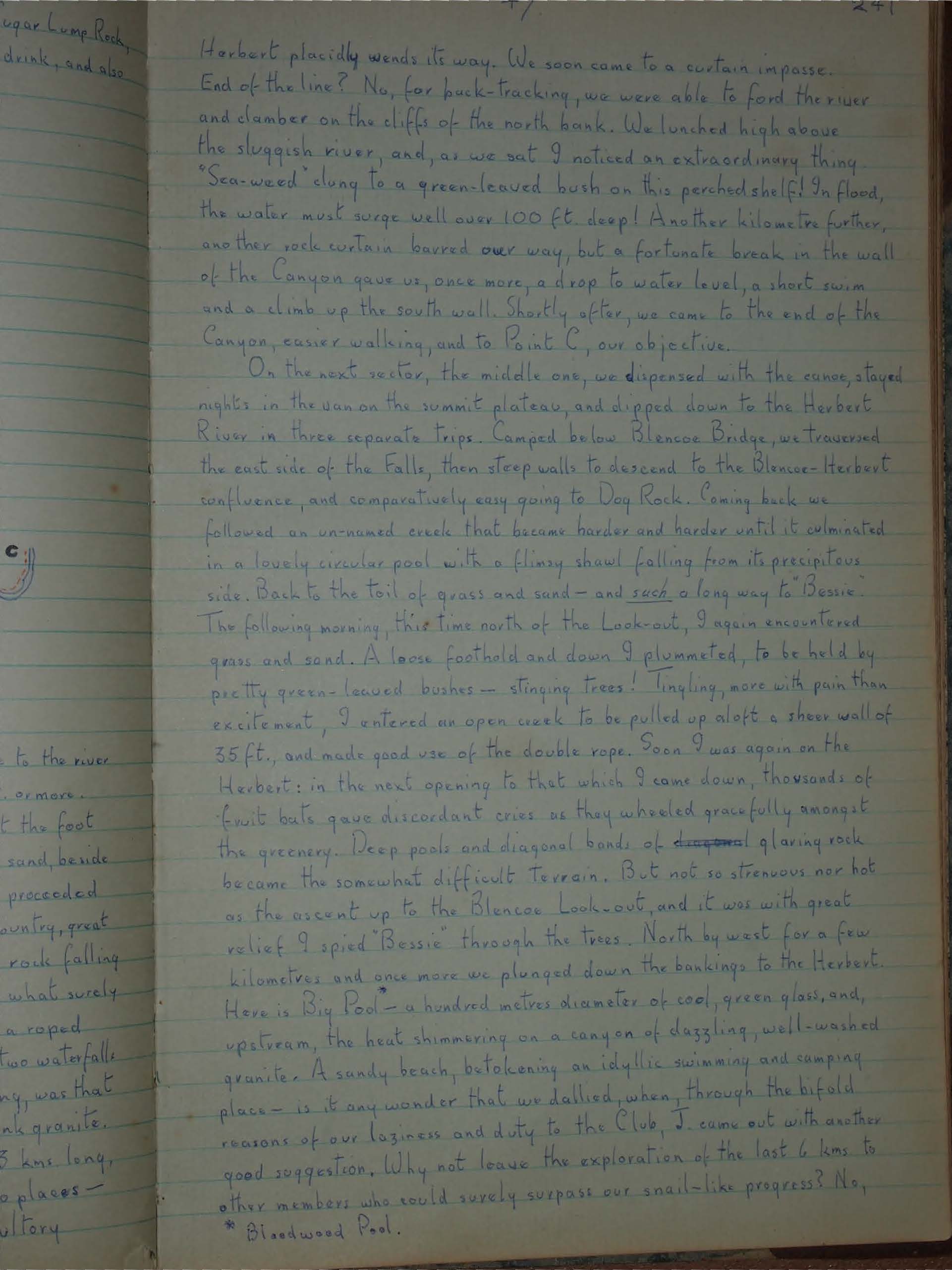 On the next sector, the middle one, we dispensed with the canoe, stayed nights in the van on the summit plateau, and dipped down to the Herbert River in three separate trips. Camped below Blencoe Bridge, we traversed the east side of the Falls, then steep walls to descend to the Blencoe-Herbert confluence, and comparatively easy going to Dog Rock. Coming back we followed an un-named creek that became harder and harder until it culminated in a lovely circular pool with a flimsy shawl falling from its precipitous side. Back to the toil of grass and sand - and such a long way to Bessie.