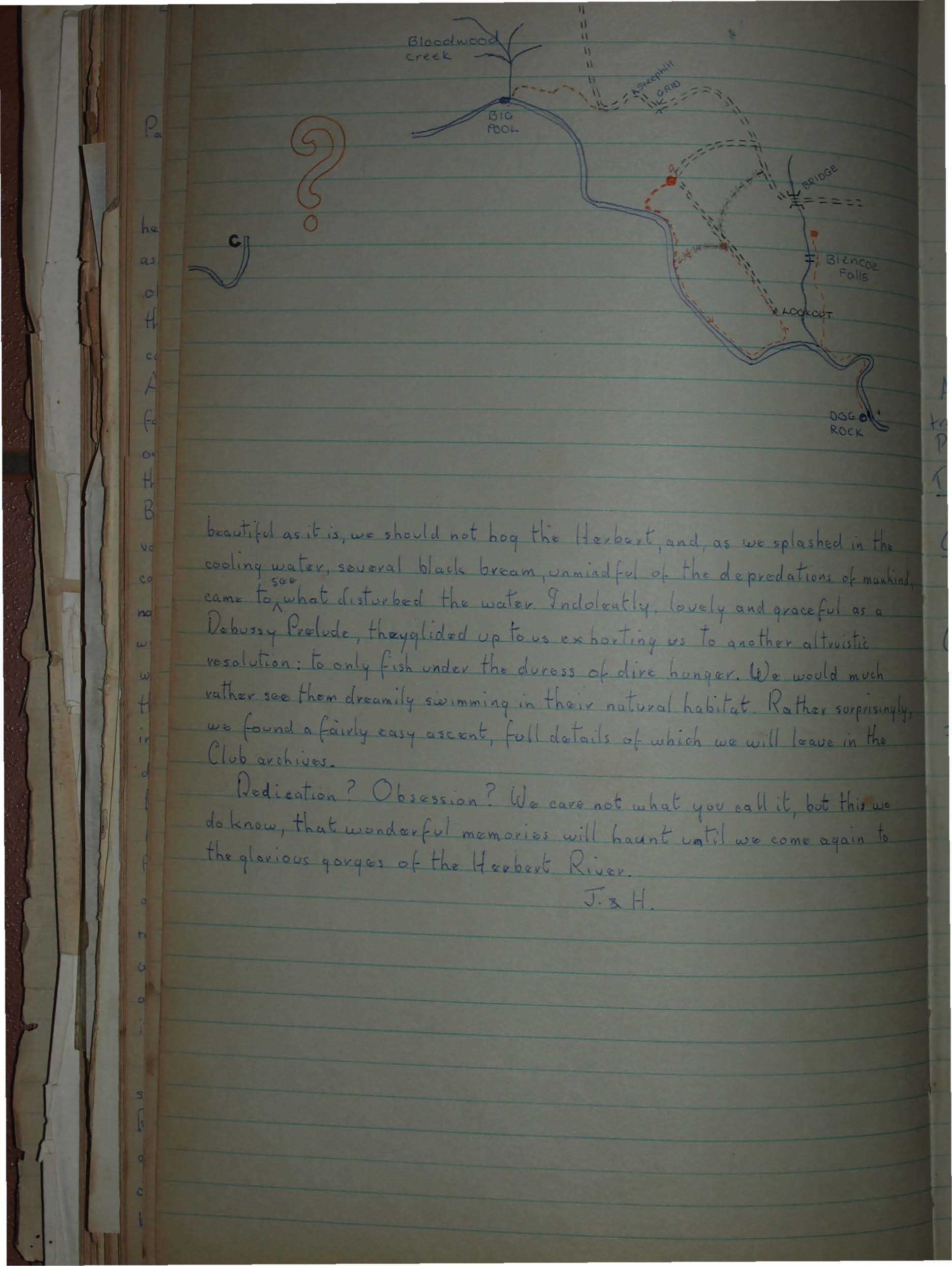 Now, into the unknown; the wide valley gradually closed in as we established Top Camp, a lovely place, where a small stream trickled through a casuarina dell to join the placid lagoon of the river. Our supplies were running short, and I even began to dream of food, and we should have had to take another hitch in the belt if I had not thrown in a line and landed three black bream in twenty minutes. These helped considerably in our final walk up the river. First, the usual round stone walk and then we entered the gorge proper, with deep, green pools in glaring pinky rock, and some difficulty of terrain where the granite walls skirted the water. But we revelled in this glorious country, and walked on to a good landmark – a big rock that resembles a dog's head, which we calculated to be 38 kms from the Top of the Road and only 4 kms from where Blencoe Creek joins the Herbert. We were thrilled to be so near, and J, obviously bitten deeply by the Herbert "bug," said, "Why not make it the 'Year of the Herbert' and finish the whole gorge?" What could I do but enthusiastically assent, and so began the planning to complete the exploration of the 80 kms of the whole system - from Top of the Road to the Herbert Falls.