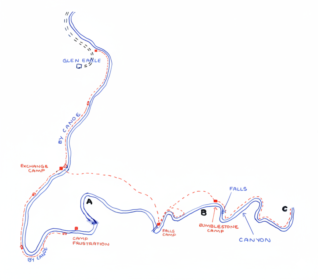 We had drooled over the Club's slides, maps and descriptions of the river at the Herbert Falls, so decided to do that section first. Canoes from Glen Eagle to Point A – at the head of the southward loop, then overland to Point B to establish a camp, walk upstream to the Falls and downstream to Point C.