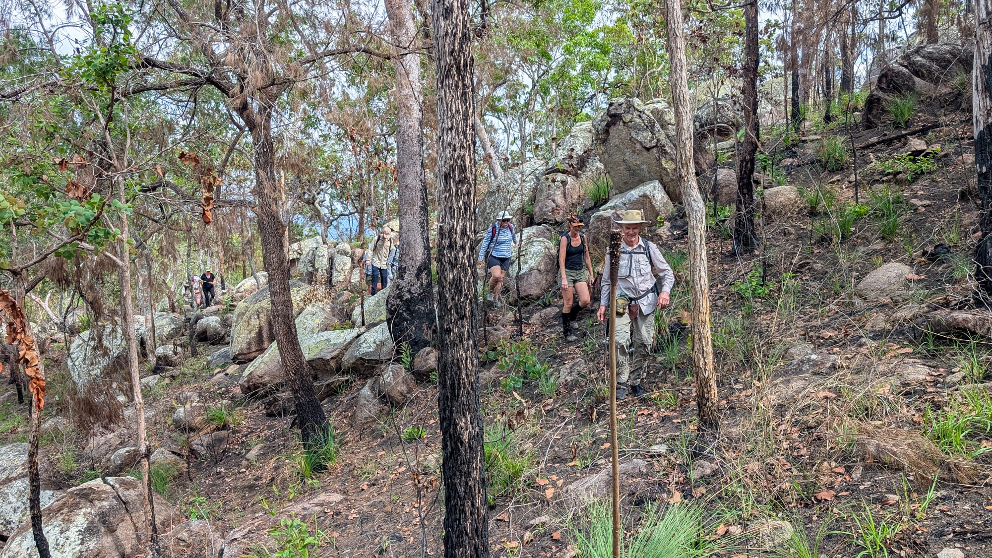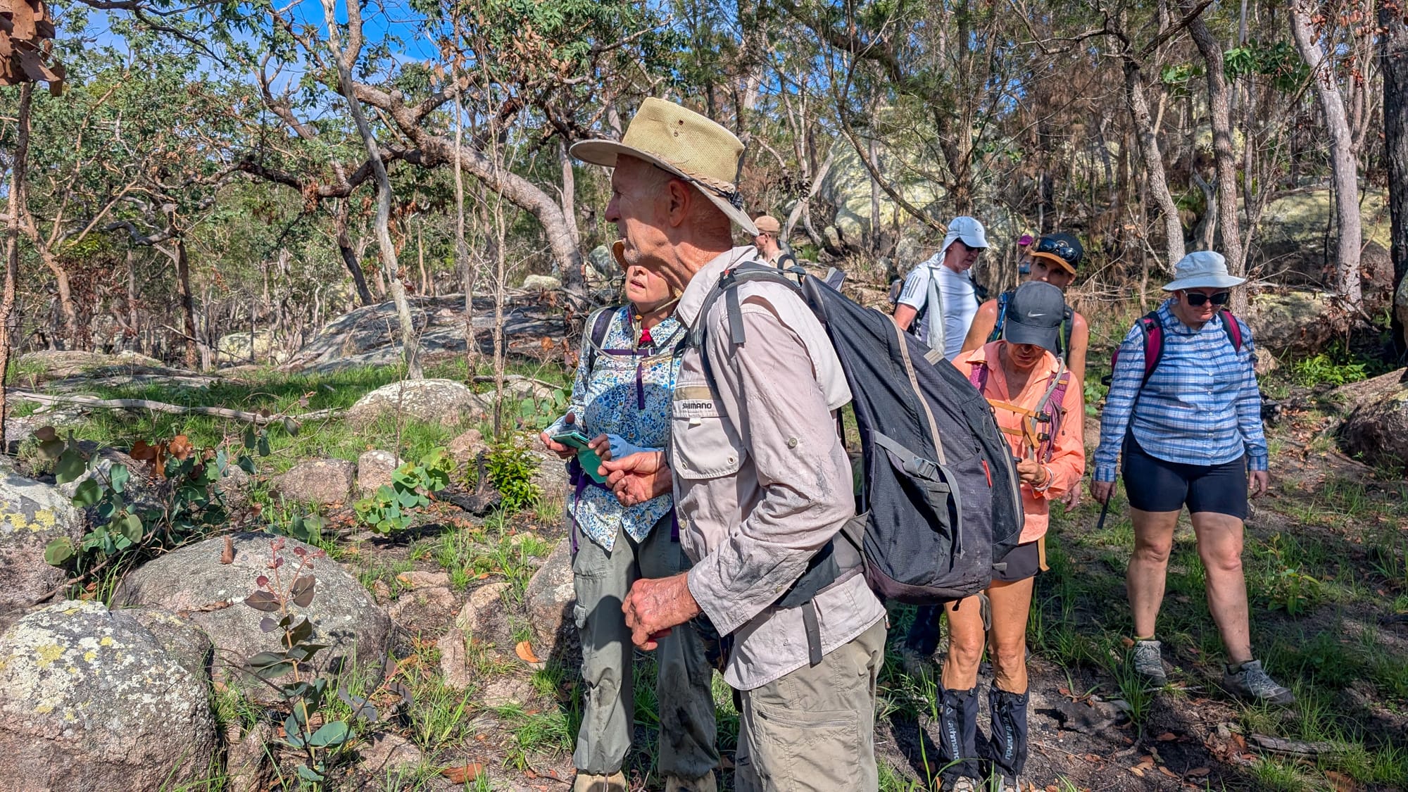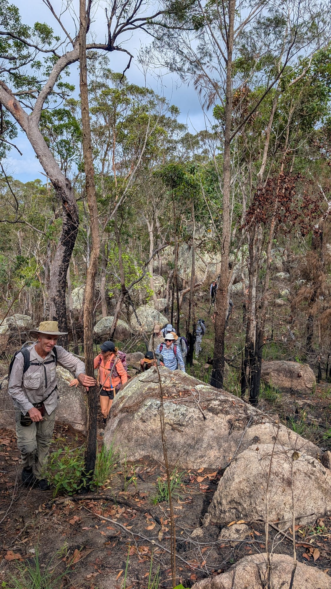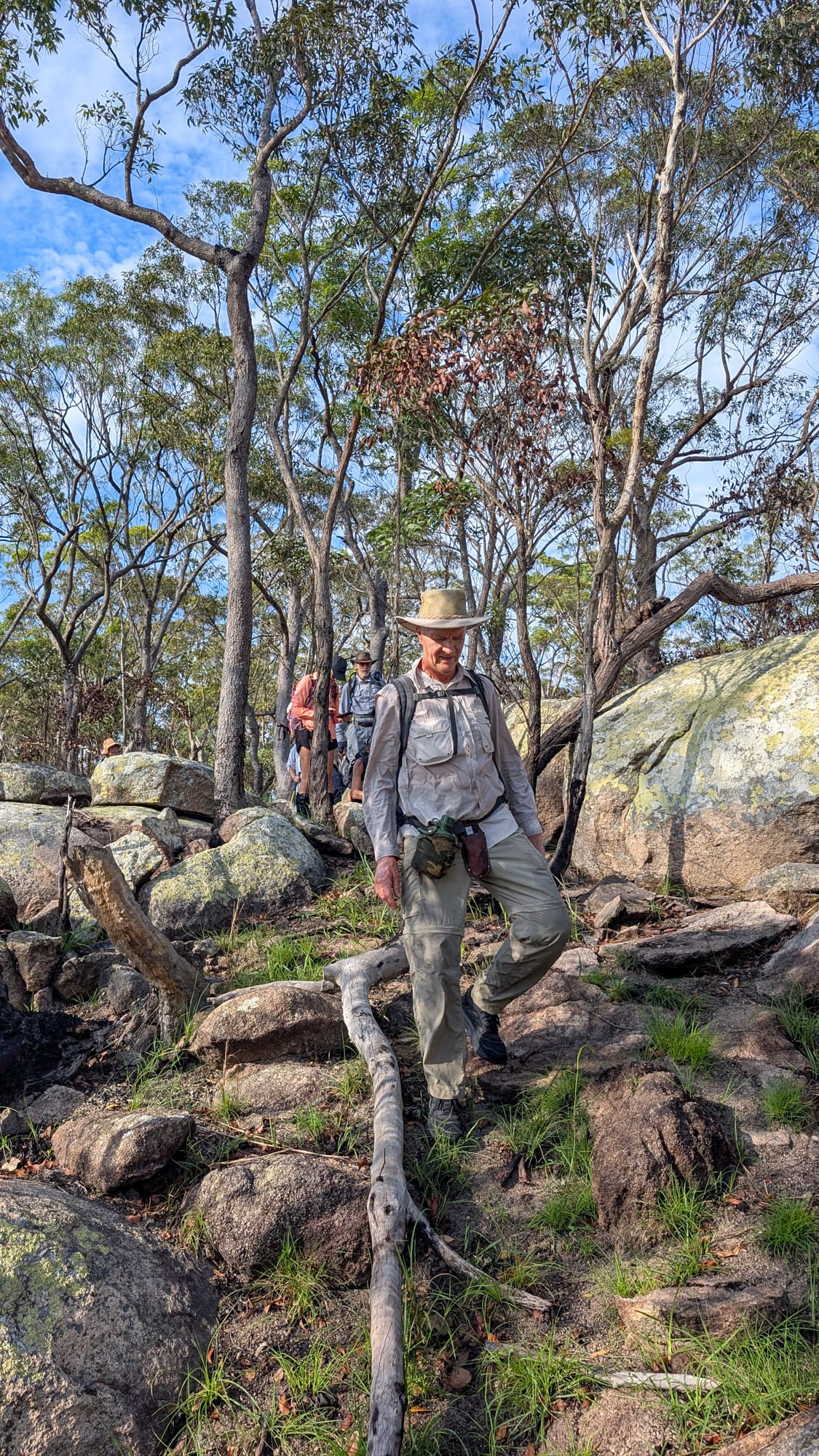 We followed the ridge east along the edge of the plateau, stopping at a lookout overlooking Hervey Range and the line of the old Page Road. The air was hazy, muting the horizon, but it added a soft atmospheric layer to the landscape. From here, we continued out to the end of the road before turning towards the Andromeda side of Harvey’s. The group enjoyed weaving through the enormous granite blocks scattered along the base of Radar Hill, including the Epitome of a Man boulder, which is always an impressive lump of stone to wander beneath.