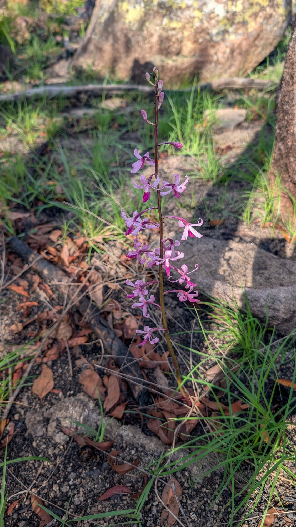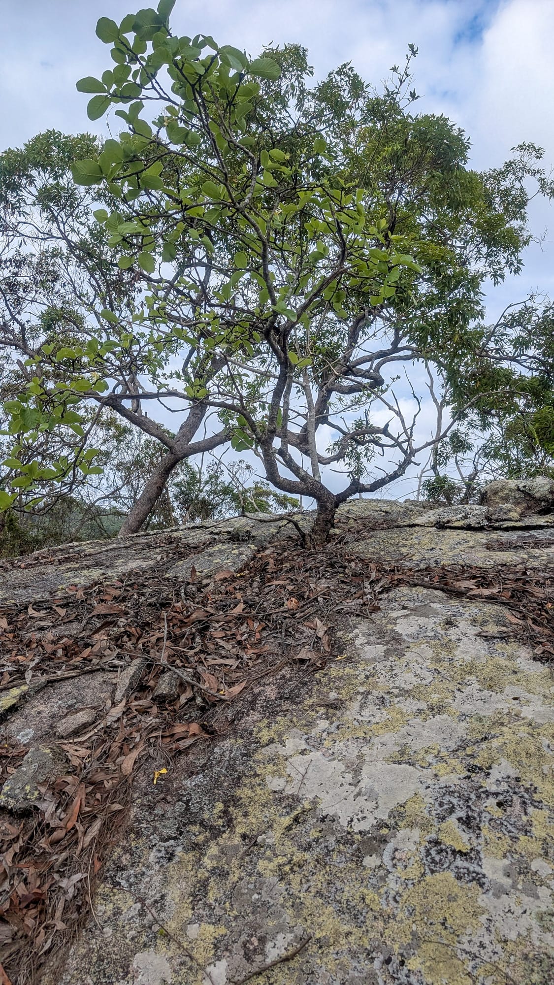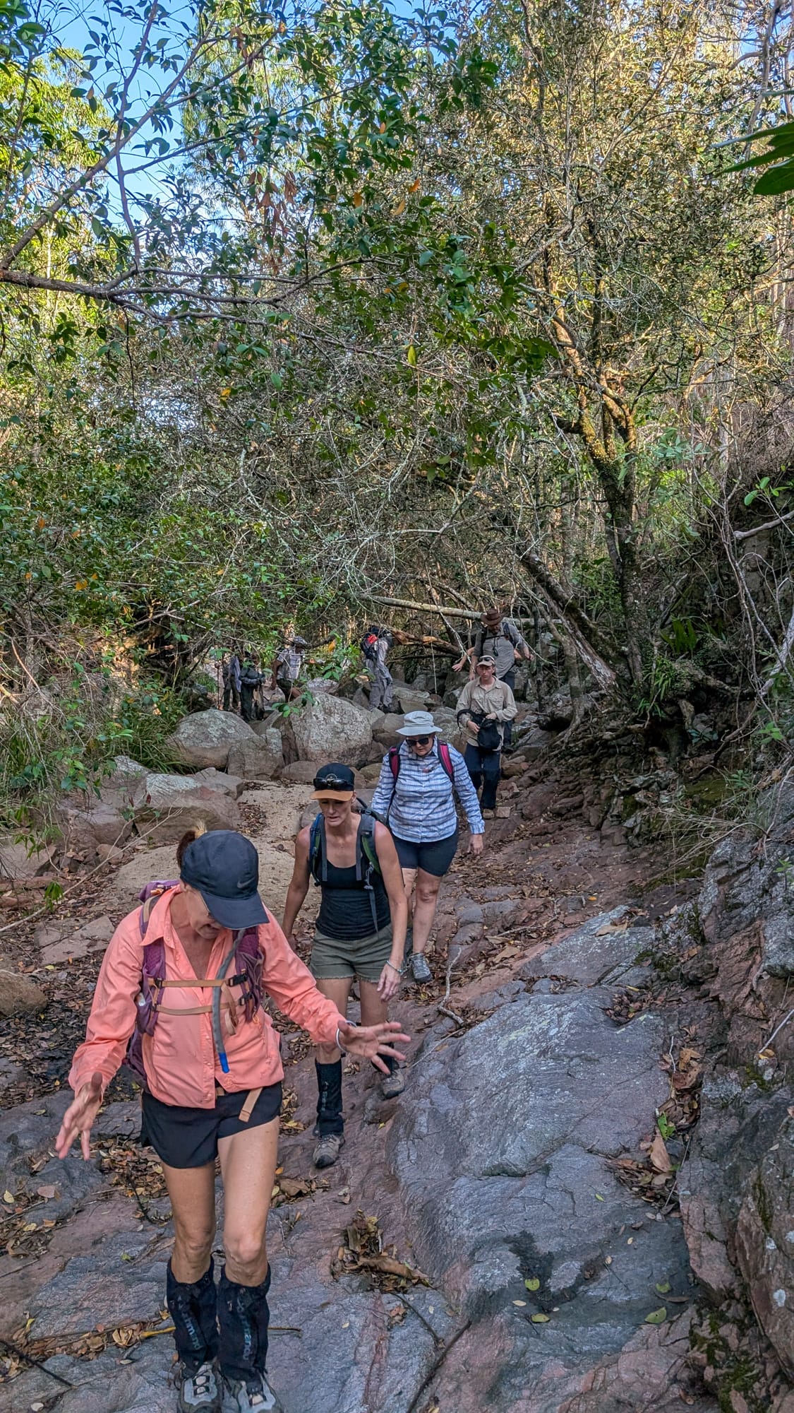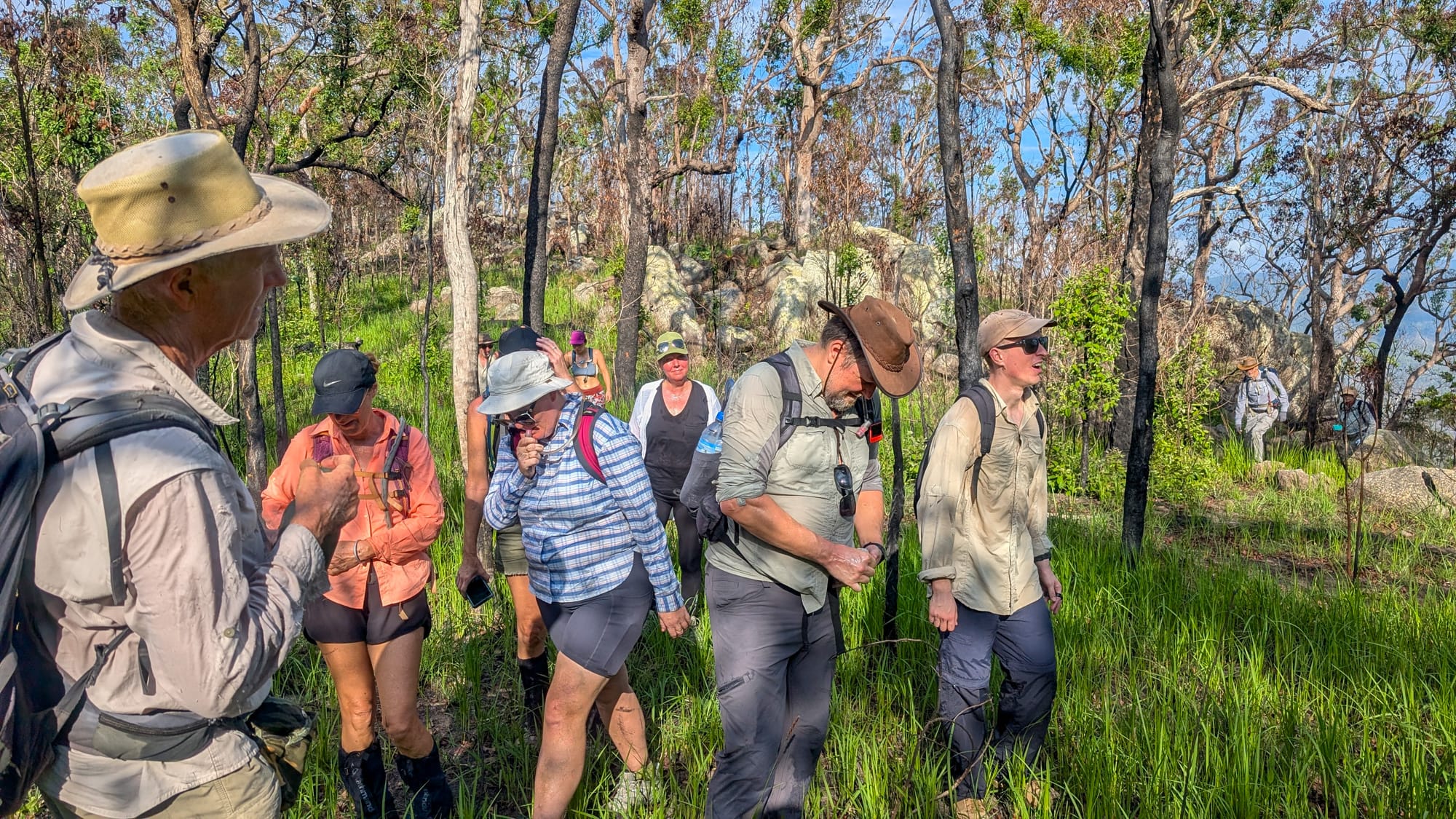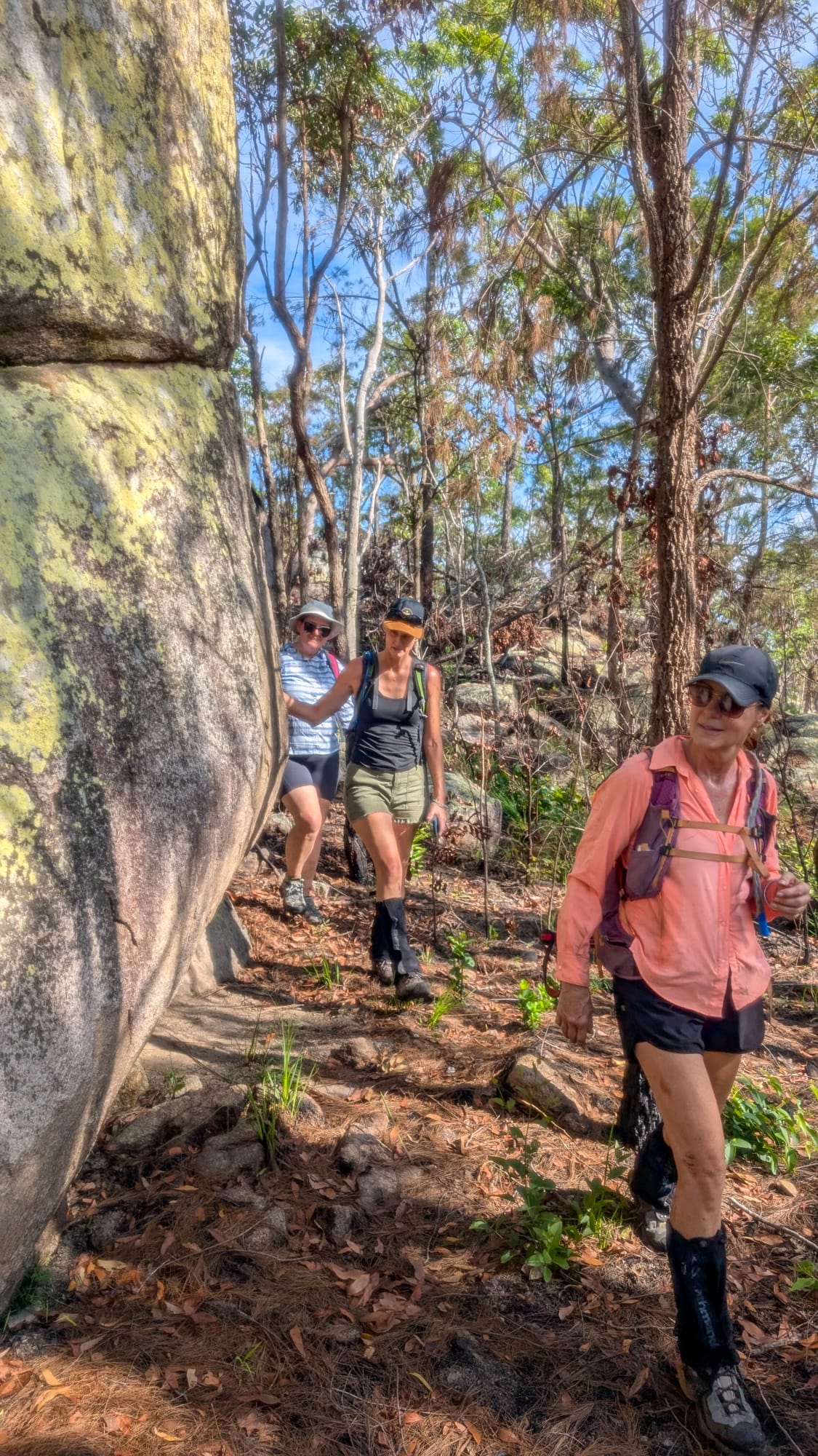 We followed the ridge east along the edge of the plateau, stopping at a lookout overlooking Hervey Range and the line of the old Page Road. The air was hazy, muting the horizon, but it added a soft atmospheric layer to the landscape. From here, we continued out to the end of the road before turning towards the Andromeda side of Harvey’s. The group enjoyed weaving through the enormous granite blocks scattered along the base of Radar Hill, including the Epitome of a Man boulder, which is always an impressive lump of stone to wander beneath.