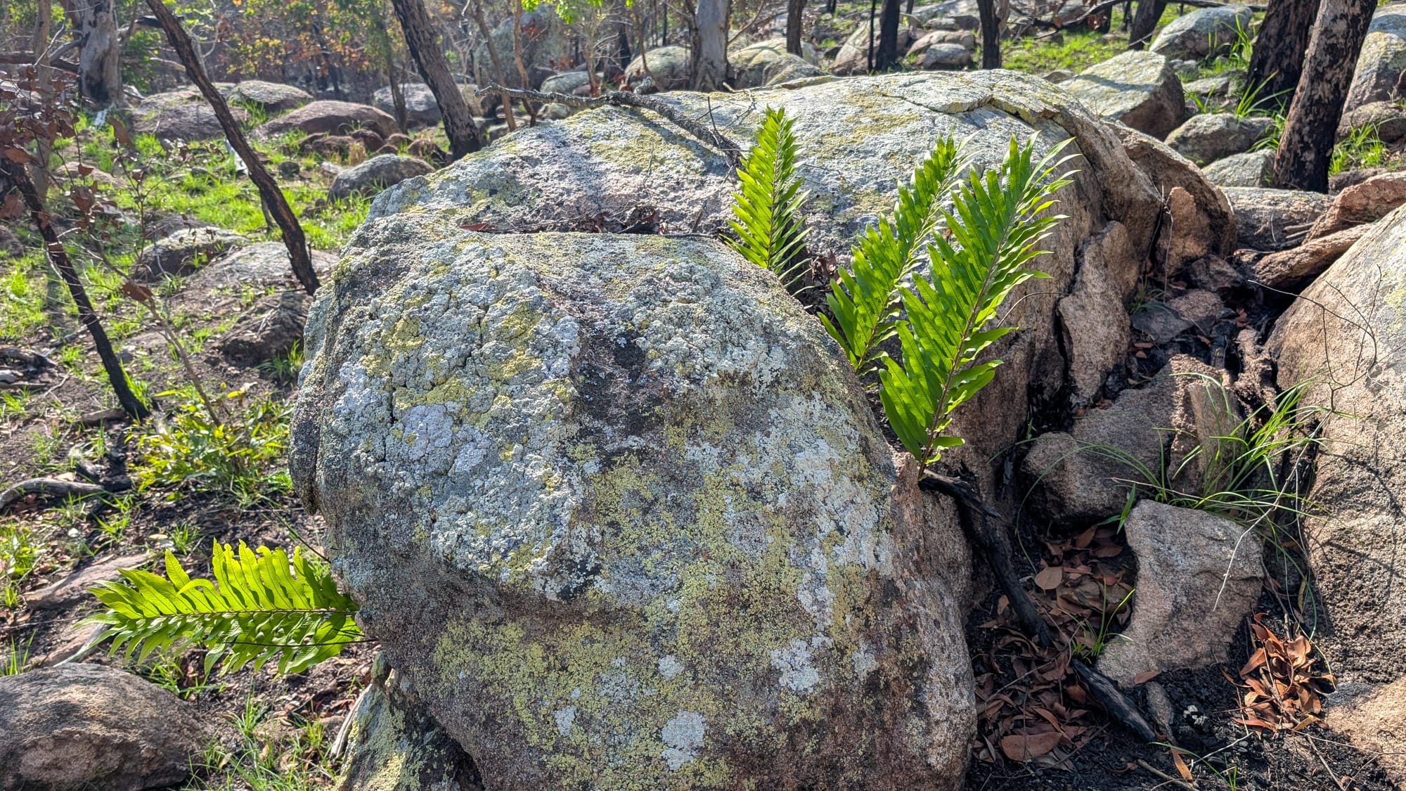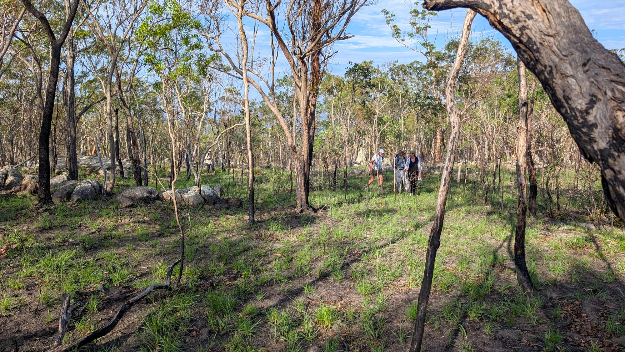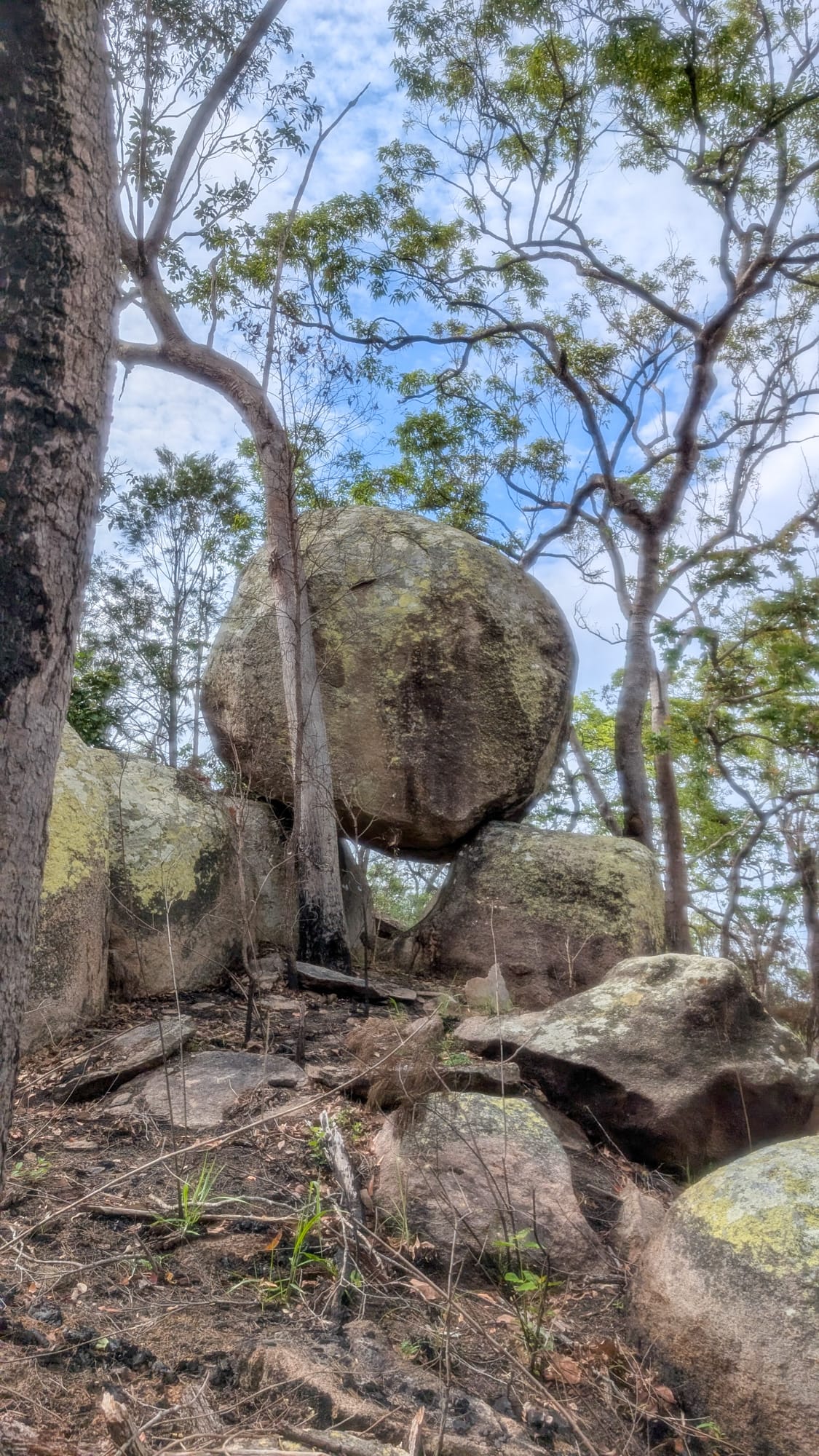 Our farthest point was The Three Brothers, a spectacular trio of colossal boulders perched on the escarpment. The views eastward were worth the effort, with Townsville visible in silhouette only if you squinted - Castle Hill just a faint smudge through the haze. A few of us scrambled onto the middle Brother for a higher vantage point, earning a well-deserved moment of panorama and breeze. We saw some white chalk from the recent boulder's session on Engineered Scare Tactics (V9).