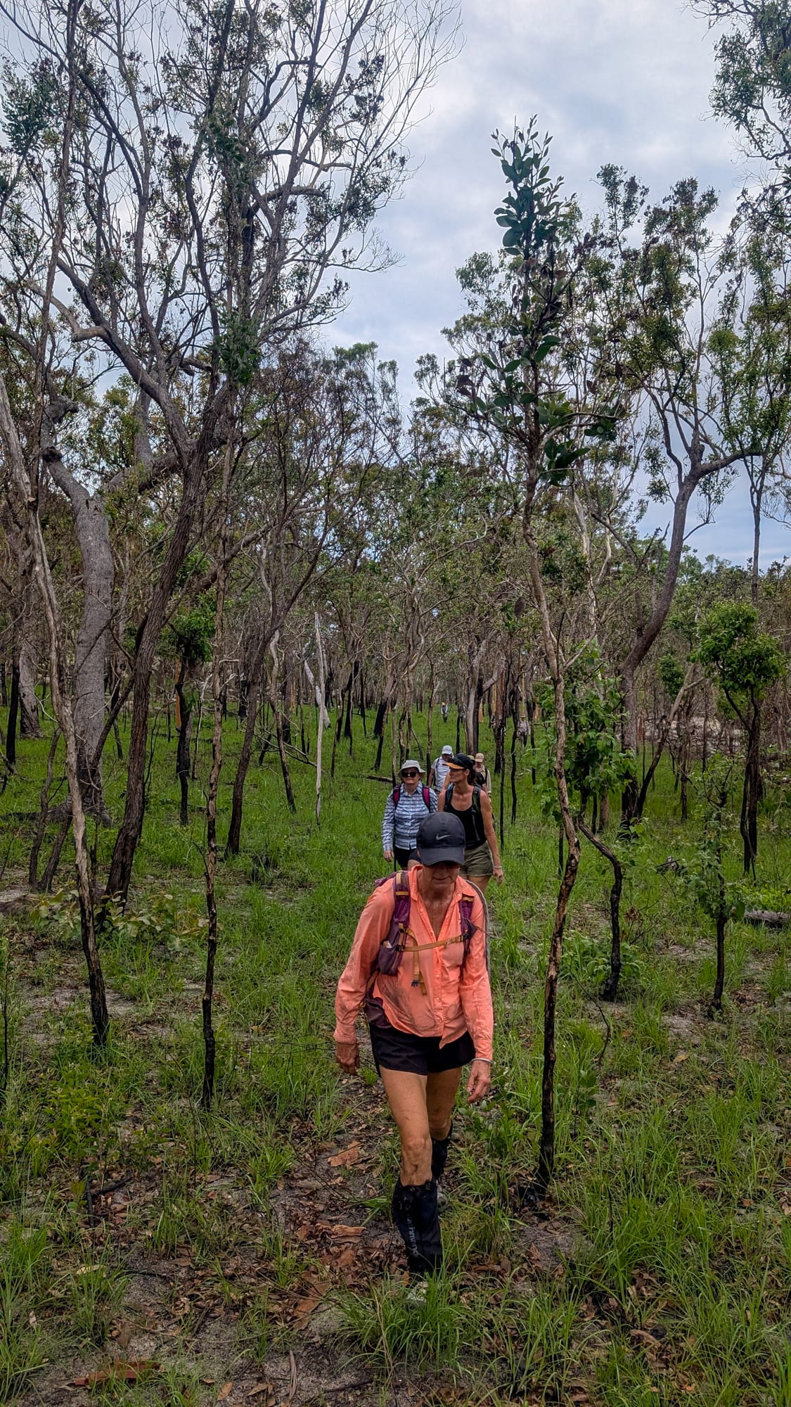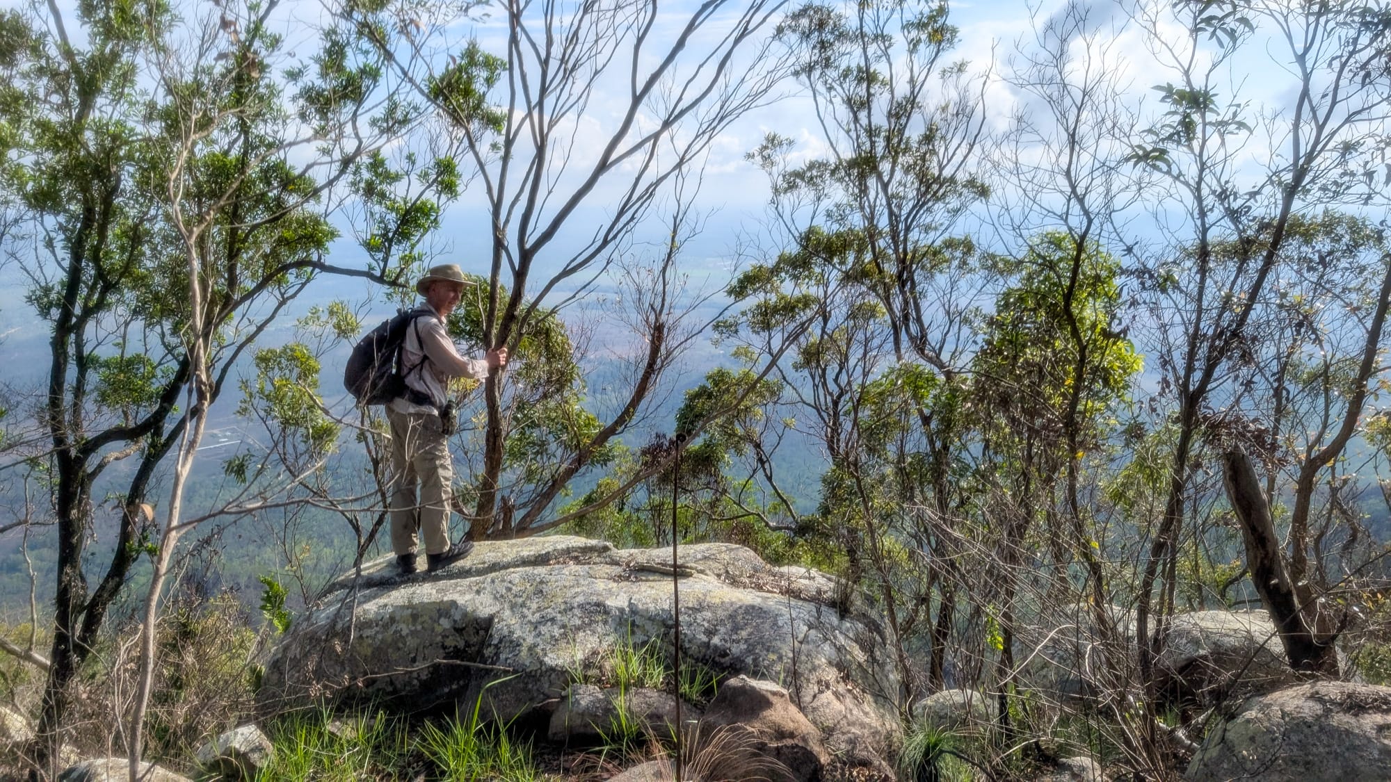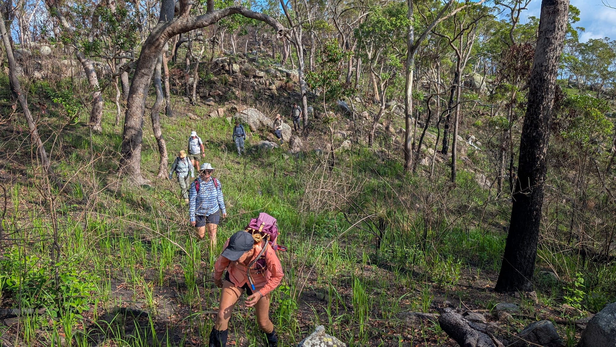 Our farthest point was The Three Brothers, a spectacular trio of colossal boulders perched on the escarpment. The views eastward were worth the effort, with Townsville visible in silhouette only if you squinted - Castle Hill just a faint smudge through the haze. A few of us scrambled onto the middle Brother for a higher vantage point, earning a well-deserved moment of panorama and breeze. We saw some white chalk from the recent boulder's session on Engineered Scare Tactics (V9).