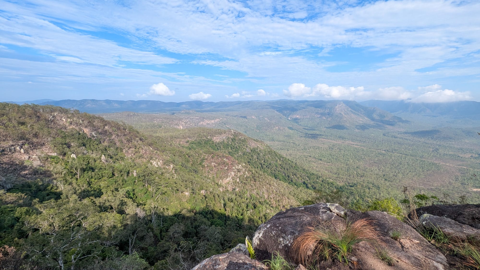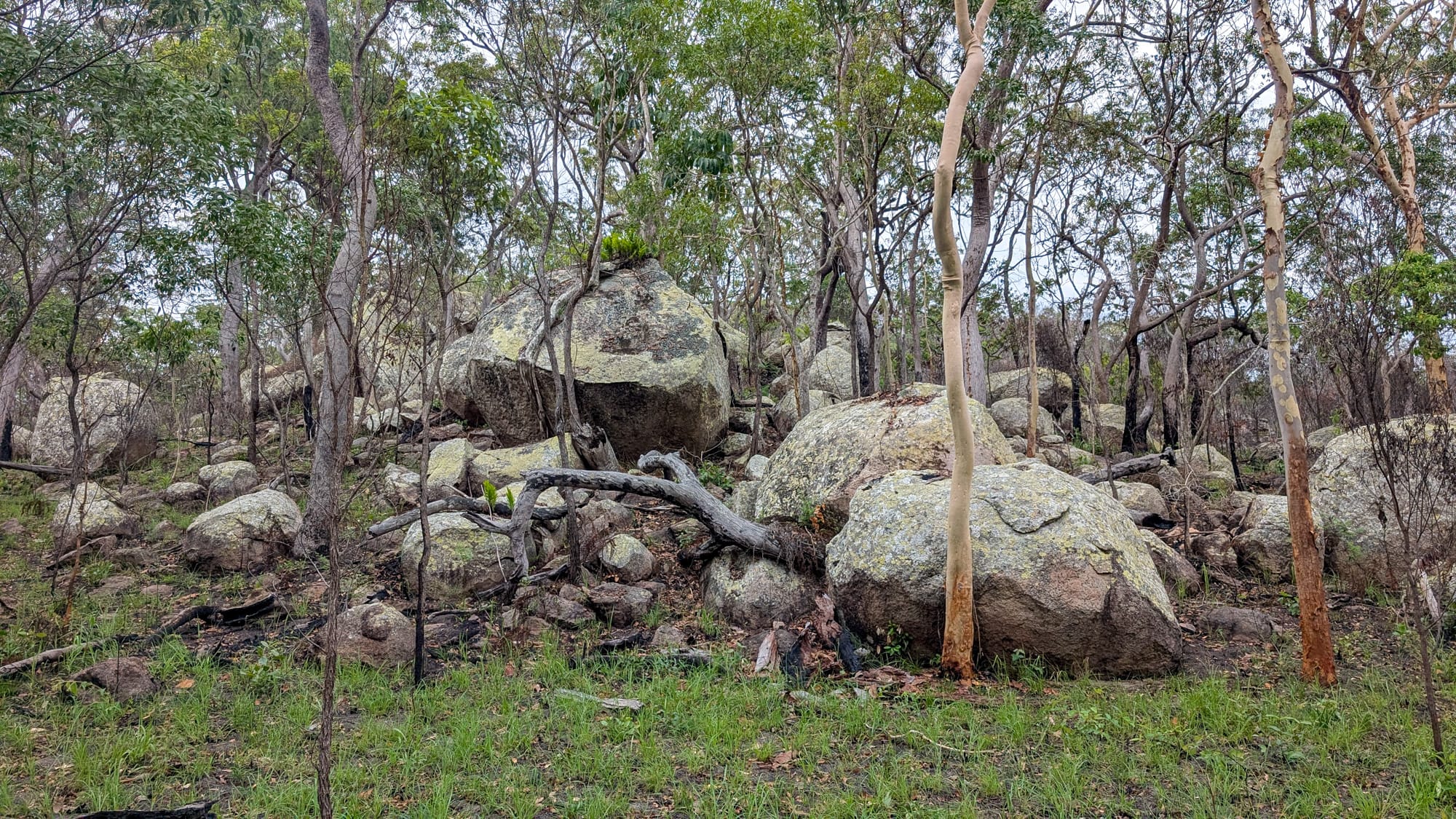 Explore Harvey's Marbles on Hervey Range, Queensland with Townsville Bushwalking Club - a granite plateau of house-sized boulders, dry creek beds, lookouts and regrowth forest. A hot but rewarding circuit hike to The Three Brothers escarpment.
