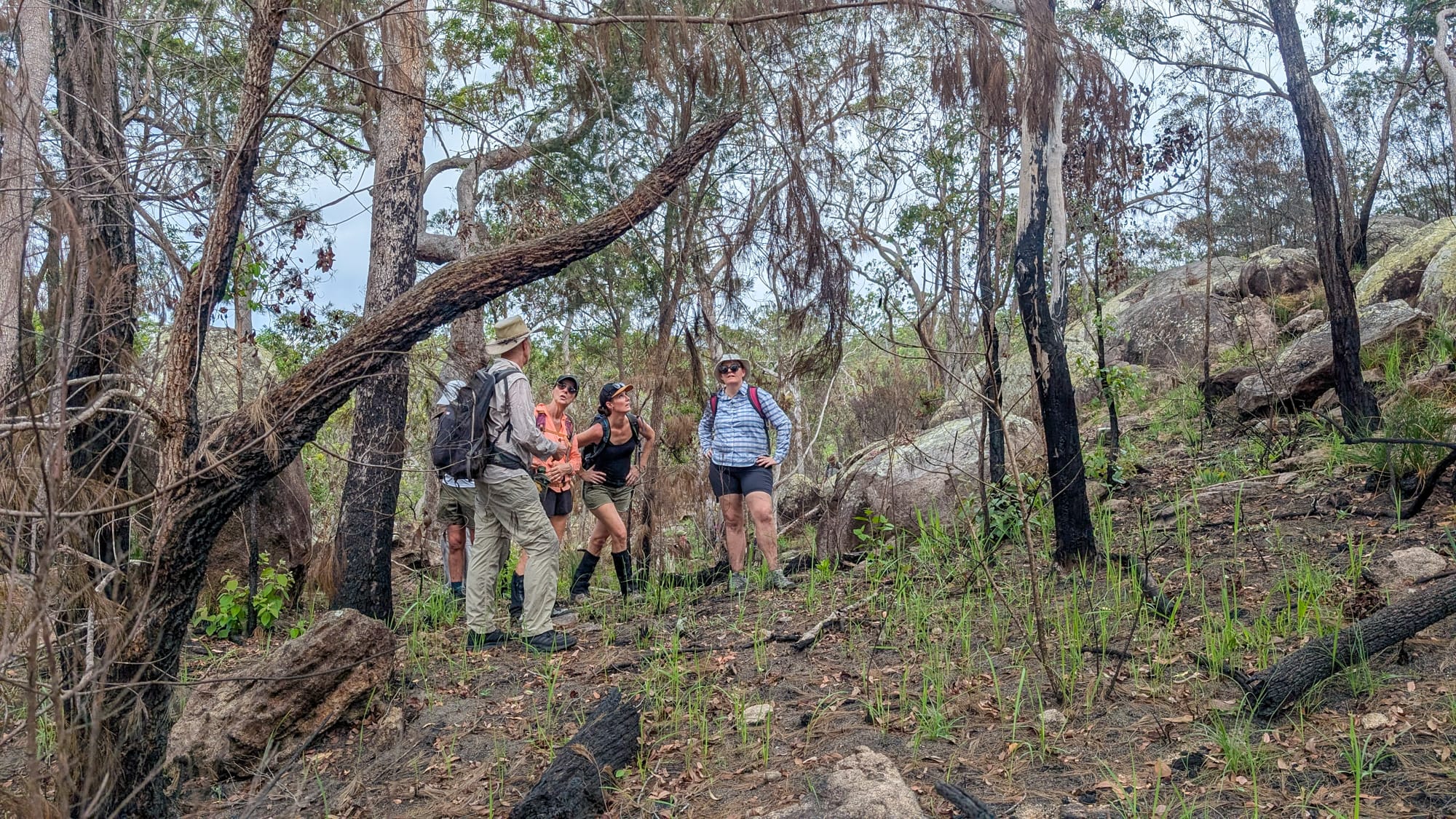 We met up at 6.00 am to make the most of the cooler part of the day, stepping into a freshly burnt Harvey’s Marbles landscape. The recent fire had cleared the understorey right back, leaving soft green regrowth pushing through the ash and making the entire plateau especially easy to walk across. Even so, the warmth was building early, and the overcast sky was doing us a favour.