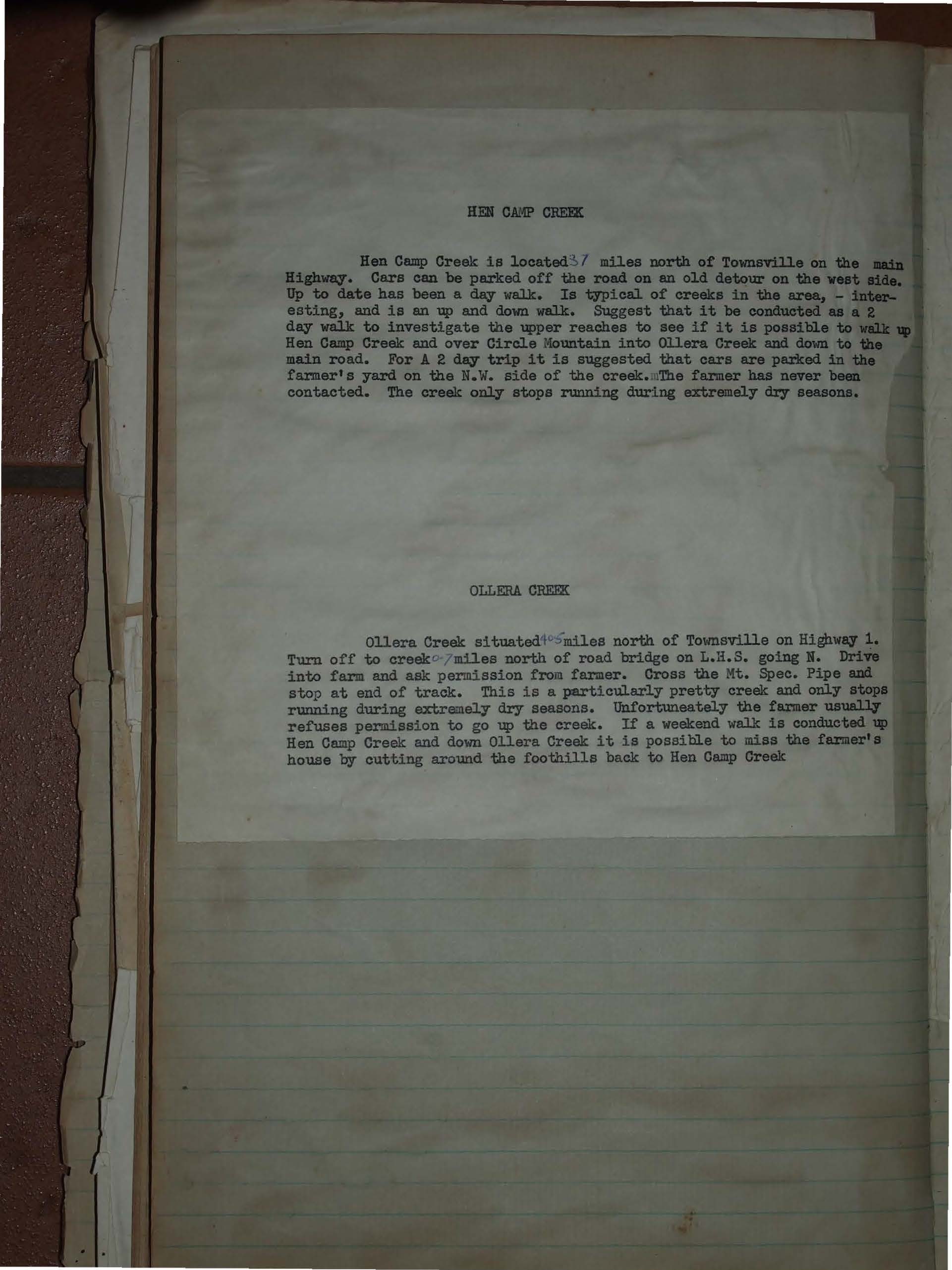 Hen Camp Creek is located 37 miles north of Townsville on the main Highway. Cars can be parked off the road on an old detour on the west side. Up to date has been a day walk. Is typical of creeks in the area, - interesting, and is an up and down walk. Suggest that it be conducted as a 2 day walk to investigate the upper reaches to see if it is possible to walk up Hen Camp Creek and over Circle Mountain into Ollera Creek and down to the main road. For a 2 day trip it is suggested that cars are parked in the farmer's yard on the N.W. side of the creek. The farmer has never been contacted. The creek only stops running during extremely dry seasons.
