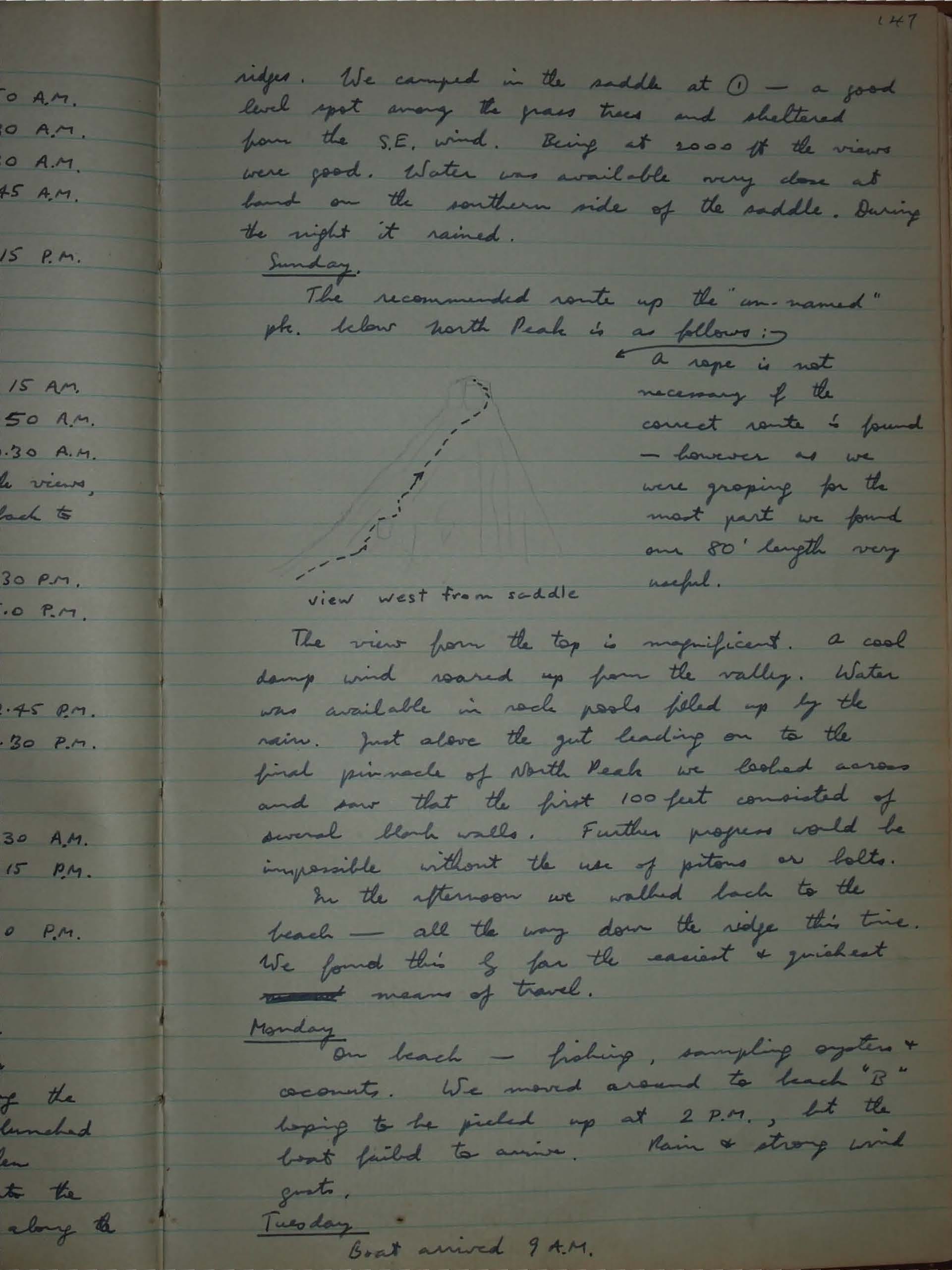 The view from the top is magnificent. a cool damp wind soared up from the valley. Water was available in rock pools filled up by the rain. Just above the gut leading on to the final pinnacle of North Peak we looked across and saw that the first 100 feet consisted of several blank walls. Further progress would be impossible without the use of pitons or bolts. In the afternoon we walked back to the beach — all the way down the ridge this time. We found this by far the easiest & quickest means of travel.