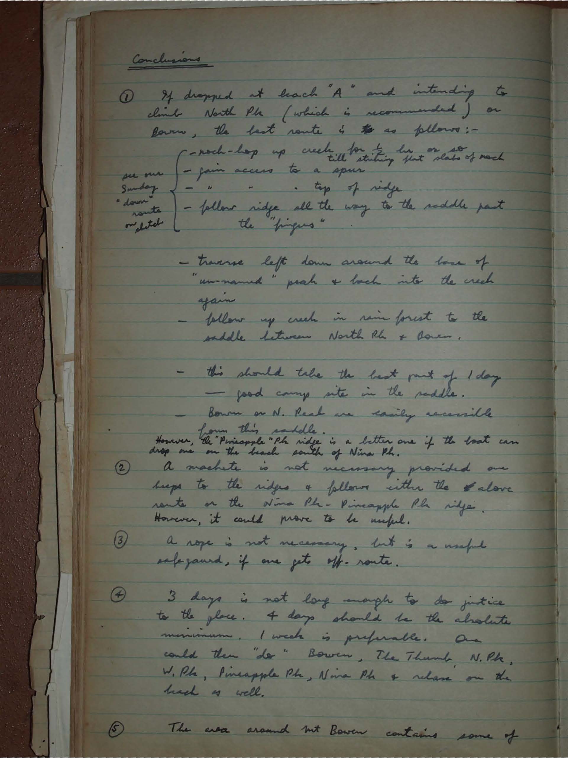 ① If dropped at beach "A" and intending to climb North Pk (which is recommended) or Bowen, the best route is as follows:-