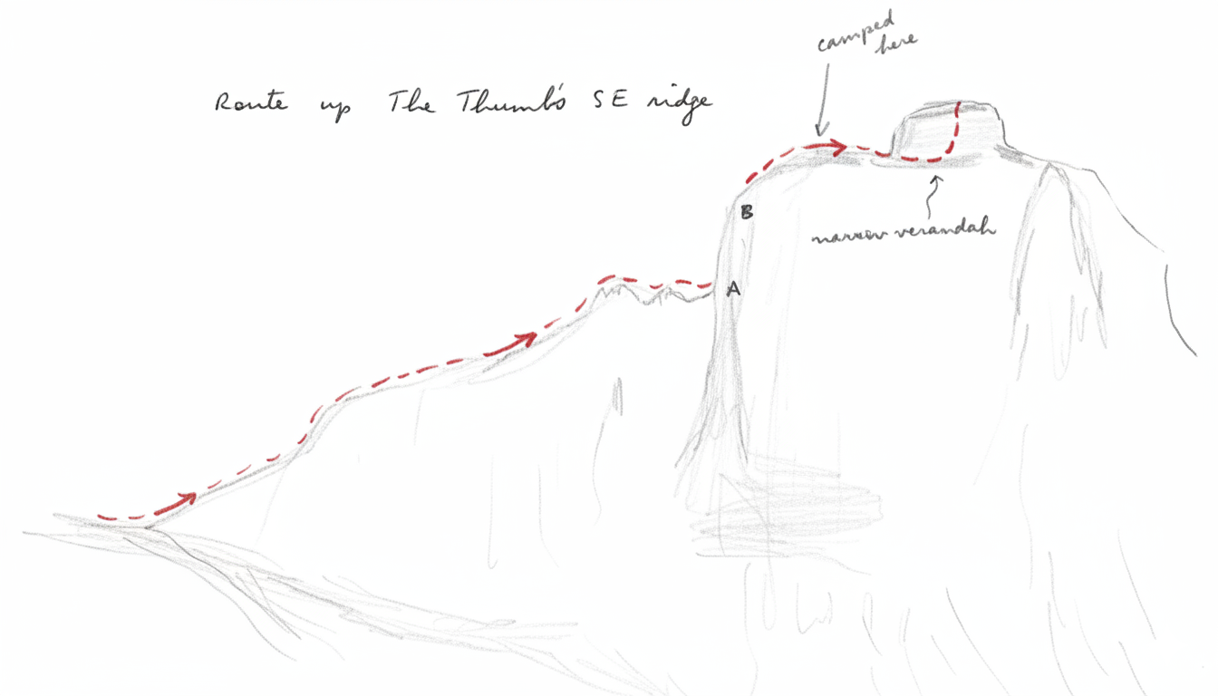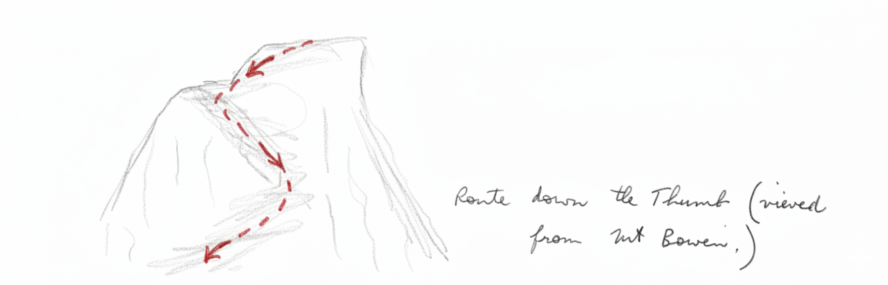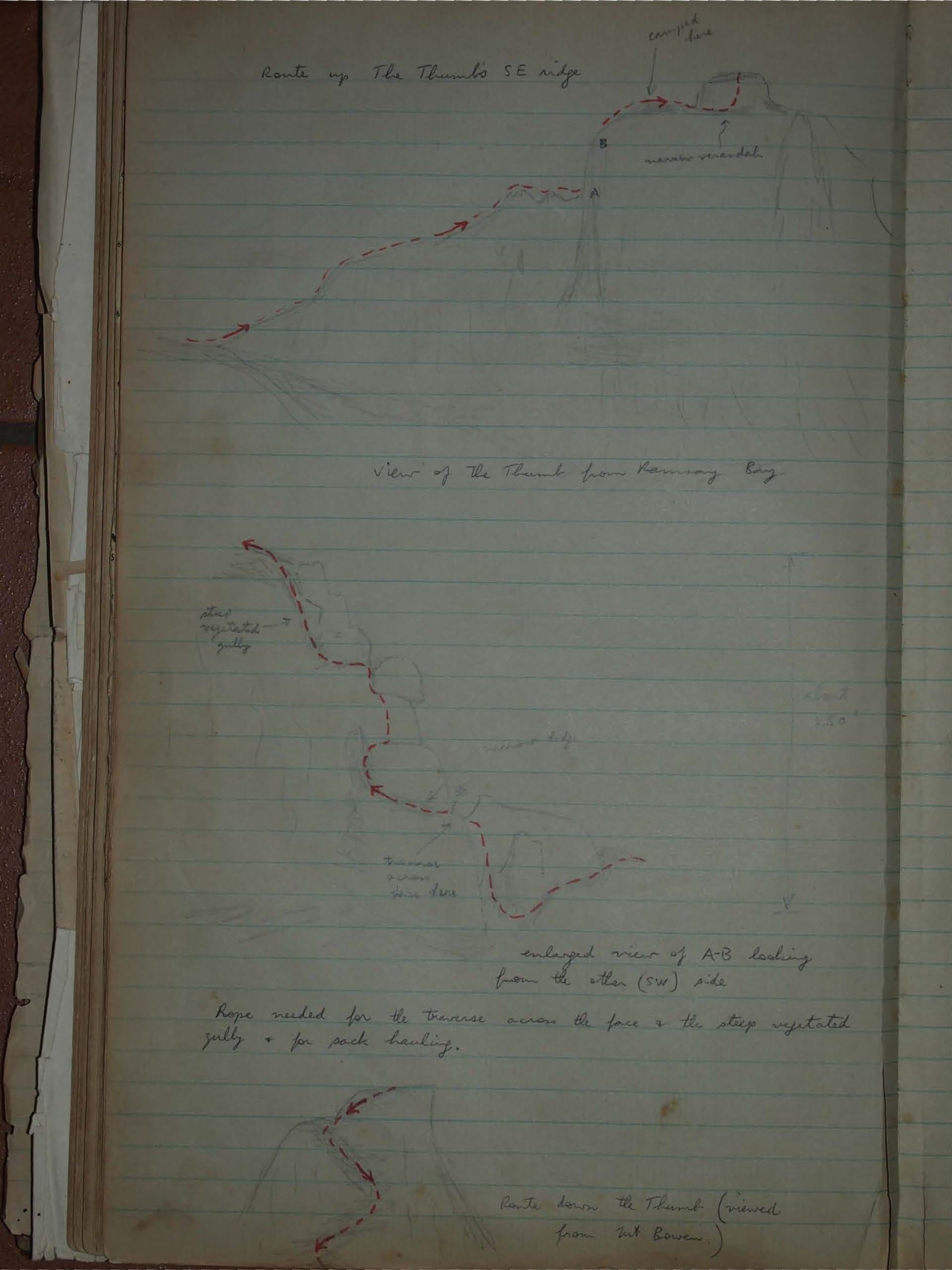 Up creek at south end of beach at Ramsay bay onto ridge — up S.E. ridge of the Thumb — over Mt Bowen then down the North Pk. ridge — see red marking in sketch. a "Classic" Trip.