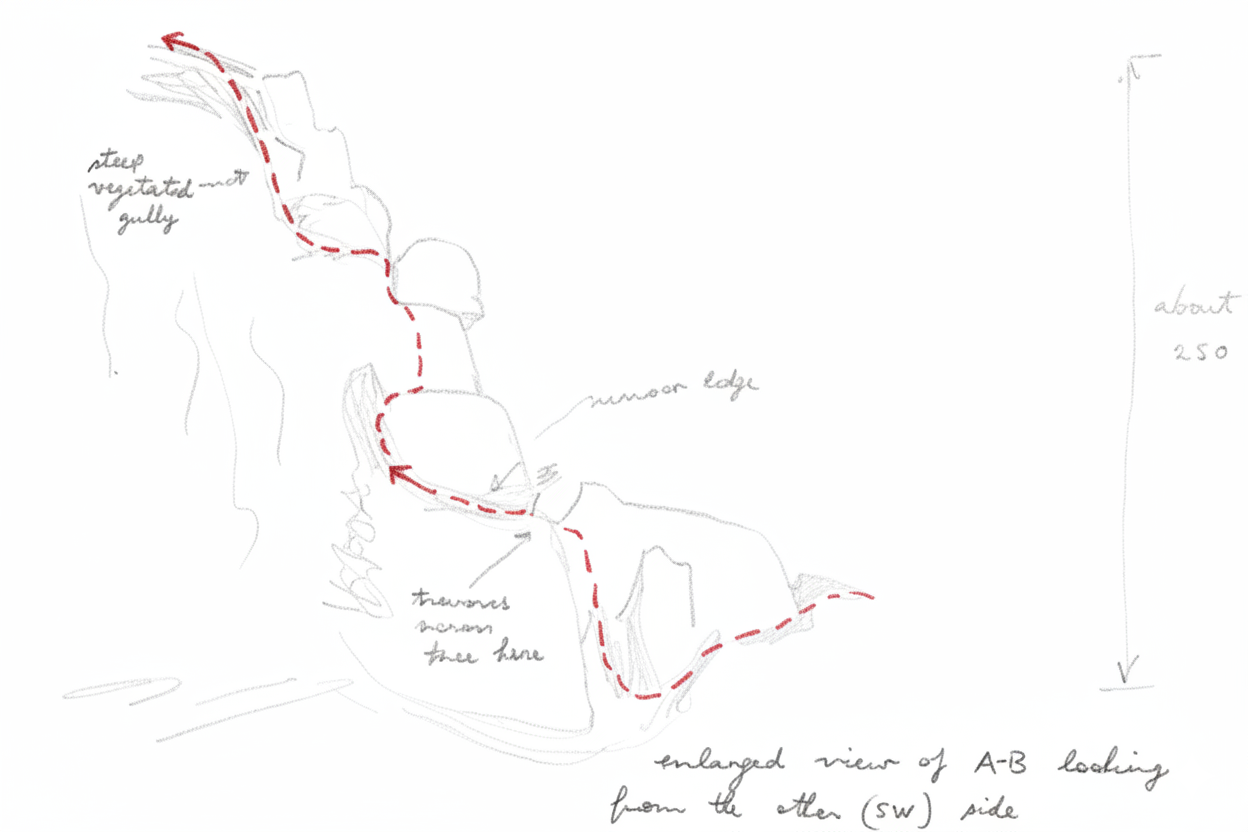 Rope needed for the traverse across the face & the steep vegetated gully & for pack hauling.