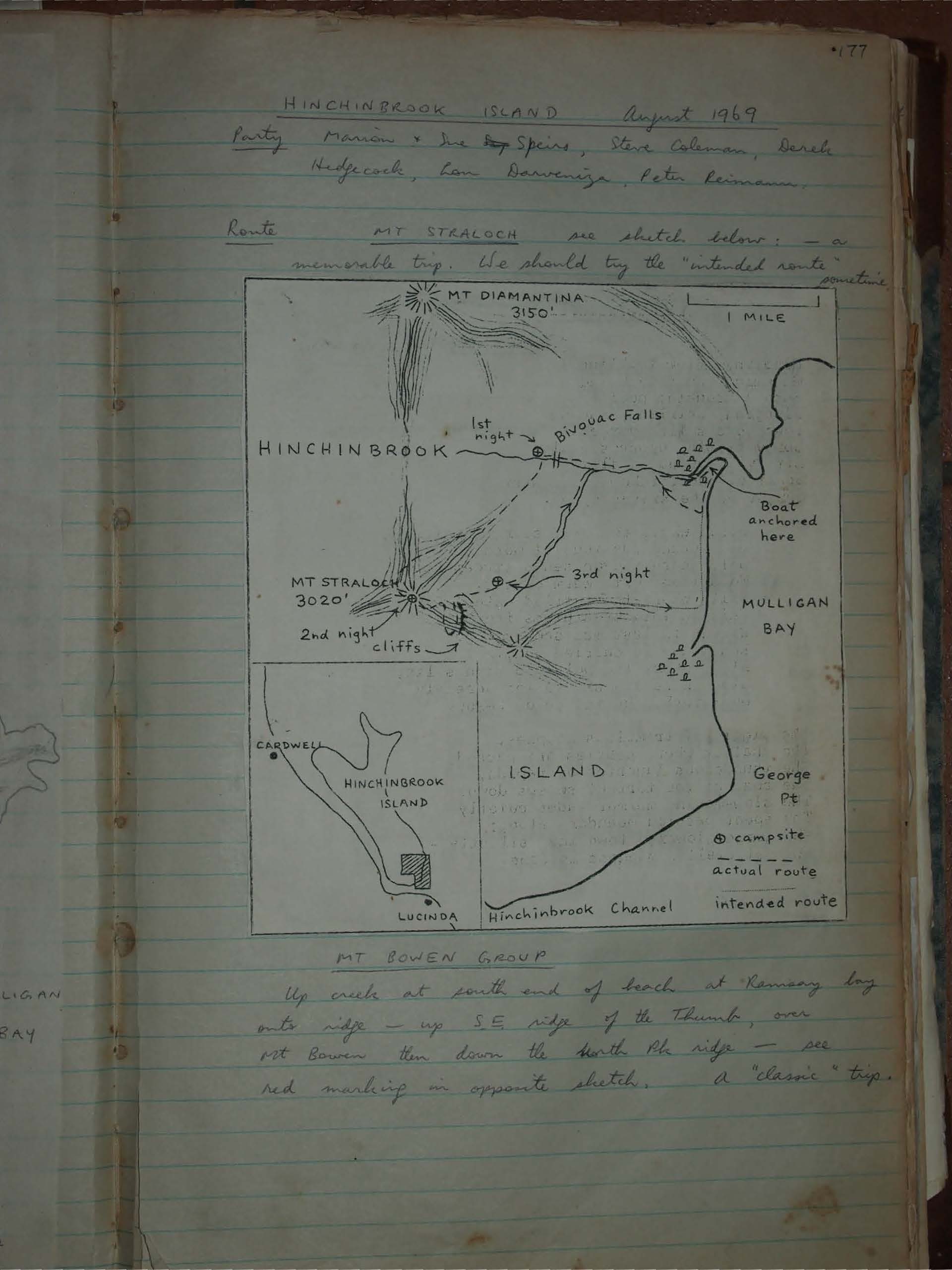 Relive the August 1969 Hinchinbrook Island expedition: a classic trek from Ramsay Bay up the Thumb’s SE ridge, over Mt Bowen, and down North Peak. With rope climbs, rugged gullies, and unforgettable views, this adventurous route through the Bowen group remains a bushwalking highlight.