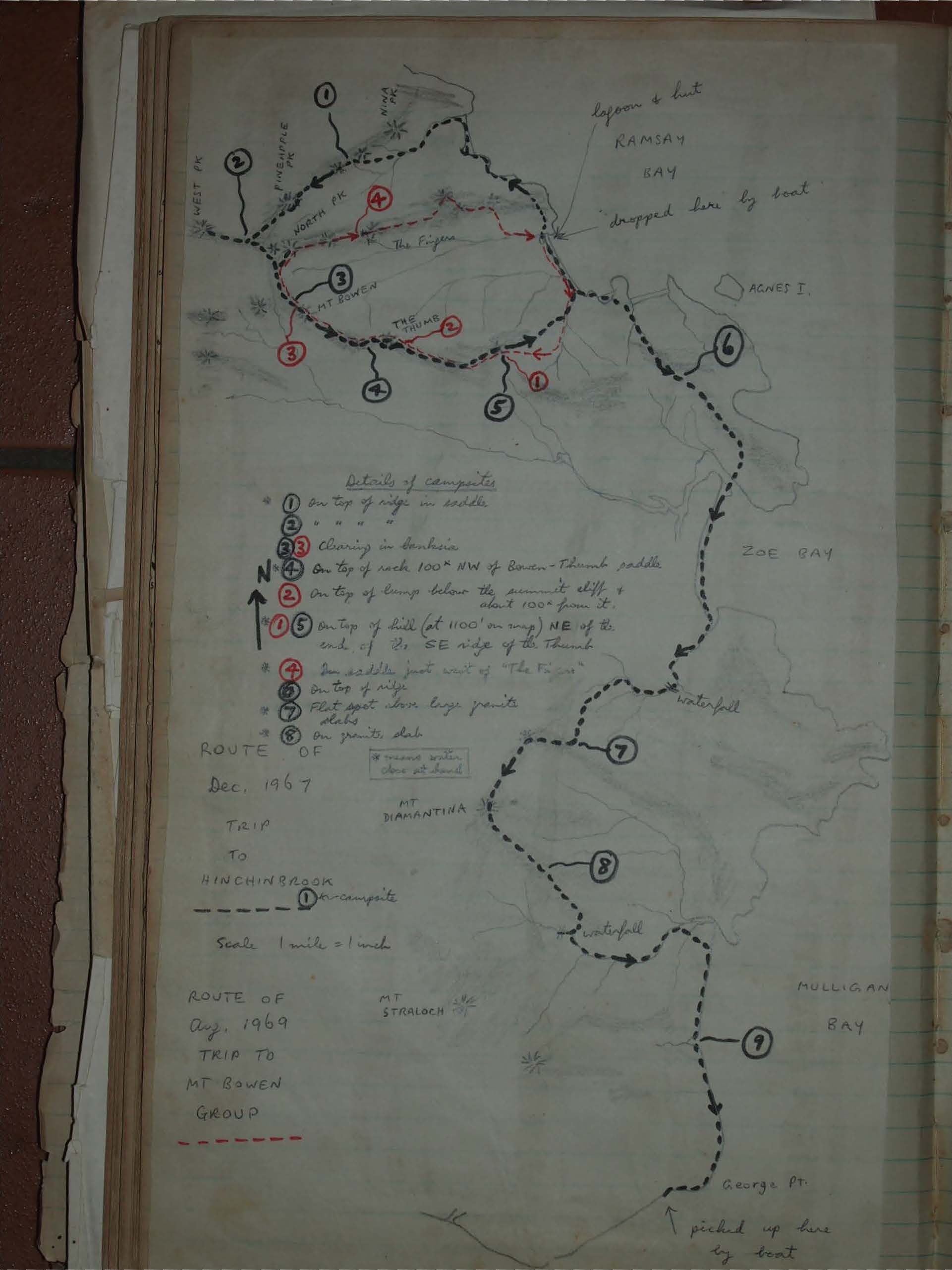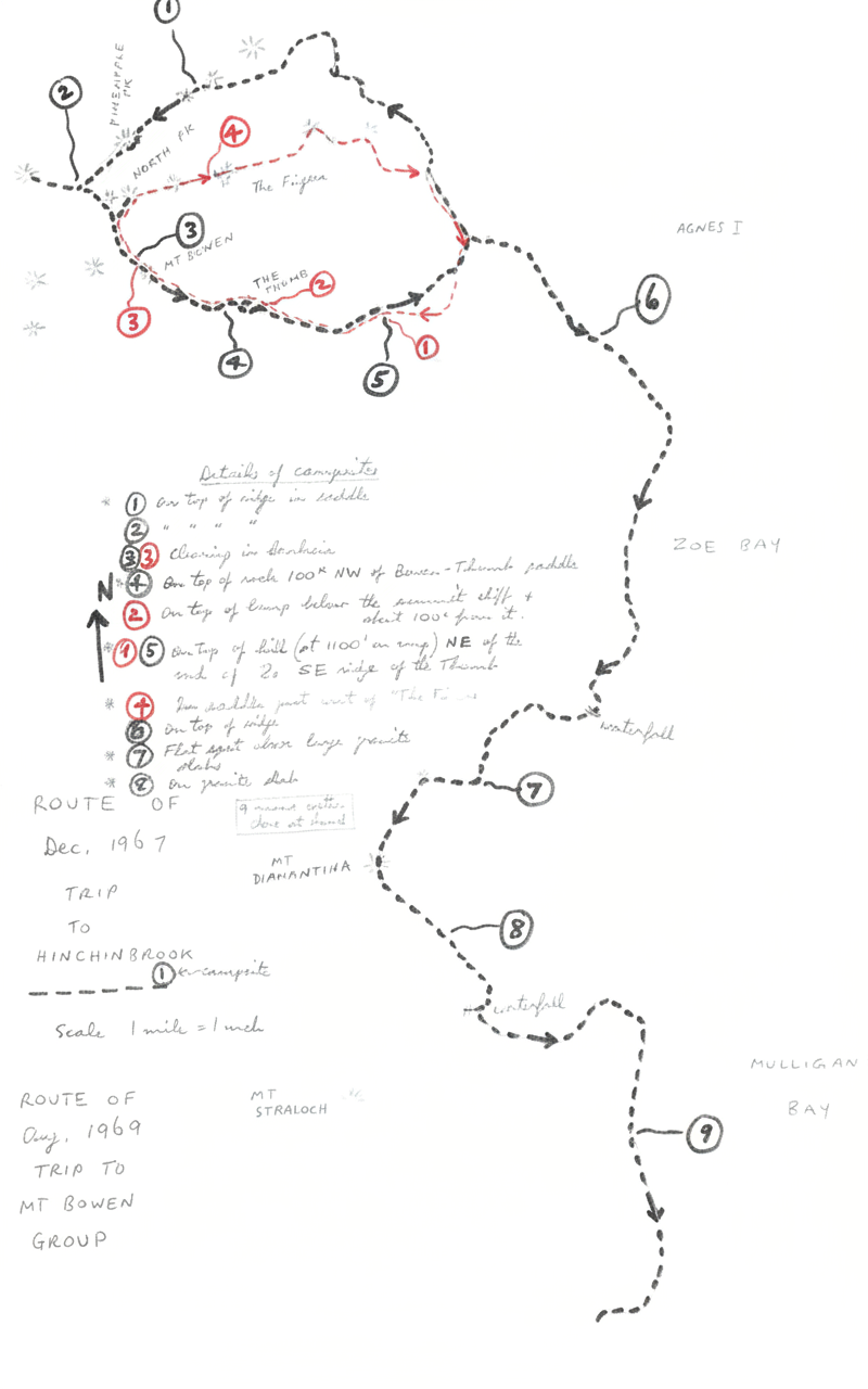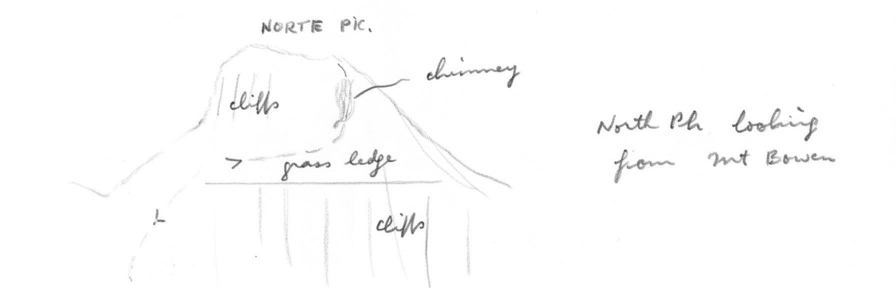 The Pineapple Pk ridge approach to Bowen is fairly clear and very pleasant. Traverse Pineapple Pk on a high ledge to its south. To climb North Peak ascend from the saddle between it & Mt Bowen.