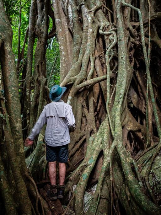 Leader says ‘that is the worst of it done, bit easier from now on’ – can we trust him ? Onto the Bambaroo track proper, climb through rainforest to start of the giant fig trees. Go right to the first one, an amazing giant tree. So we clamber in and up it for photos. Those who have not been here before were amazed. Leader says ’start moving on in a minute’, then delayed a further 30 seconds.