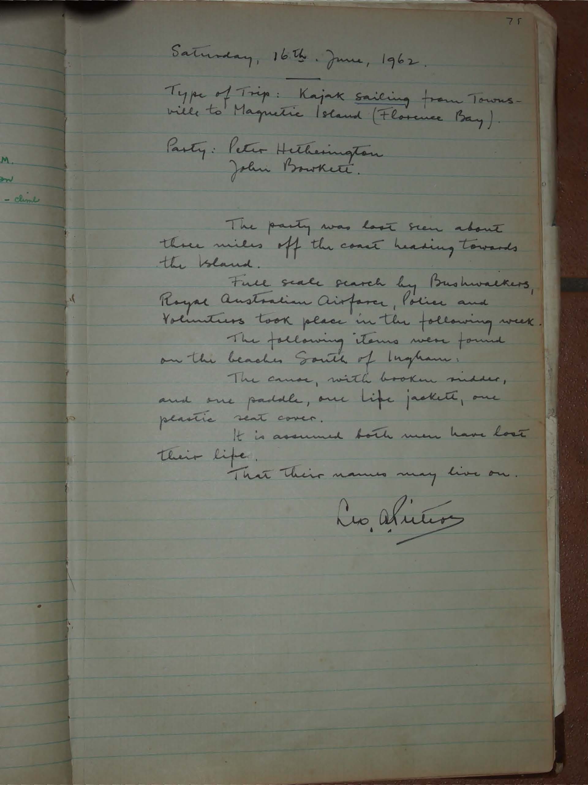 Tragedy struck on 16 June 1962 when Peter Hetherington and John Bourkett vanished while kayak sailing from Townsville to Magnetic Island’s Florence Bay. Despite a week-long search by bushwalkers, RAAF, police, and volunteers, only wreckage was found. Both men are presumed lost at sea.