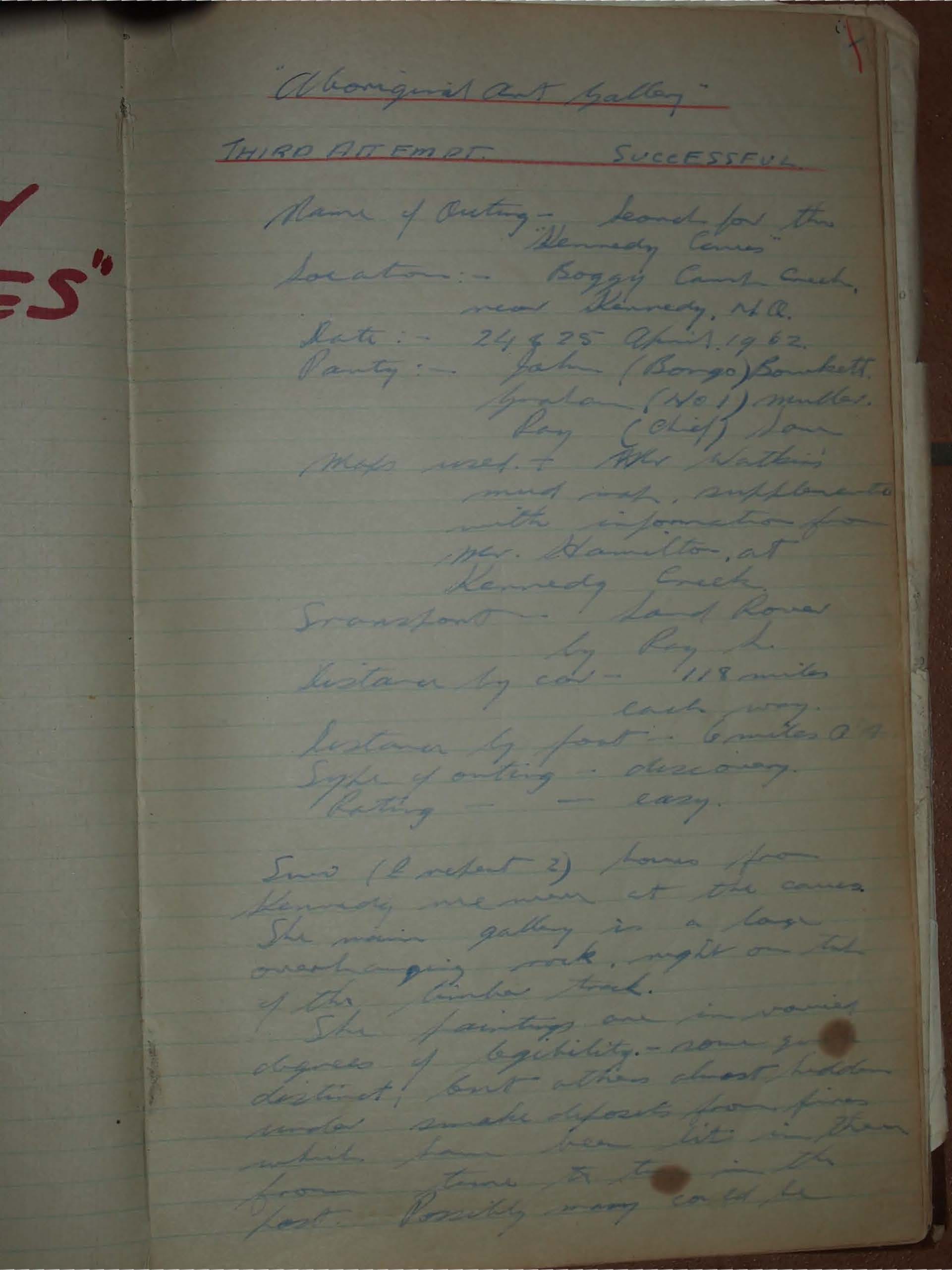 Townsville Bushwalkers’ third attempt to locate the Kennedy Caves near Boggy Camp Creek, Kennedy, NQ, was a success in April 1962. The party discovered Aboriginal rock art galleries, faint cave paintings, and historic timber tracks, making this an easy but rewarding discovery walk.