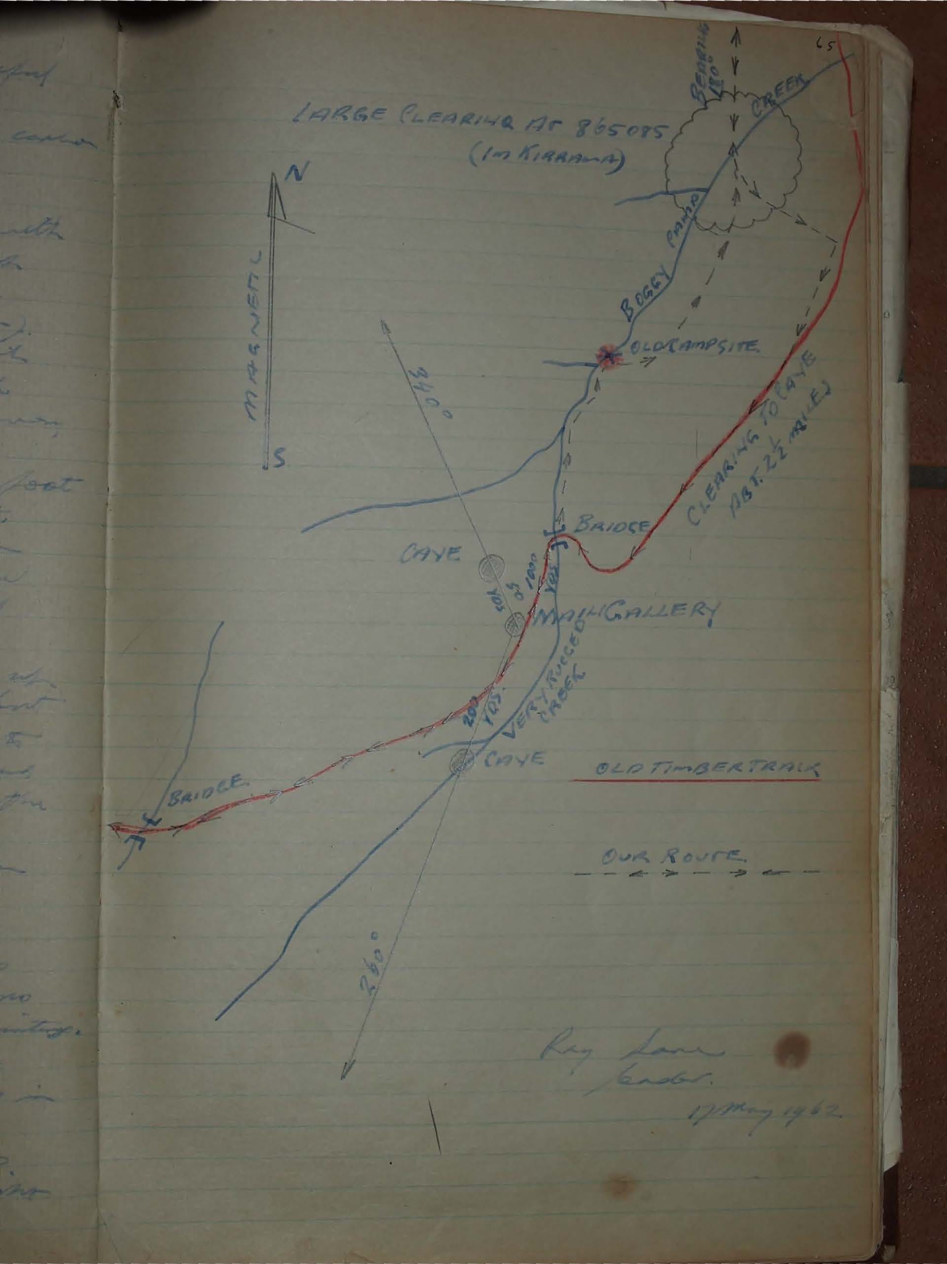 There are also other large caves in the area, but with no definite paintings, though some signs of possibilities (see sketch) and for this location). The timber track, on which one picks up some 3 miles S.E. of the large clearing, is very difficult to follow in places, but as it reaches the foot of the range becomes quite distinct. Both bridges shown on the sketch are in near perfect condition, despite their good age.
