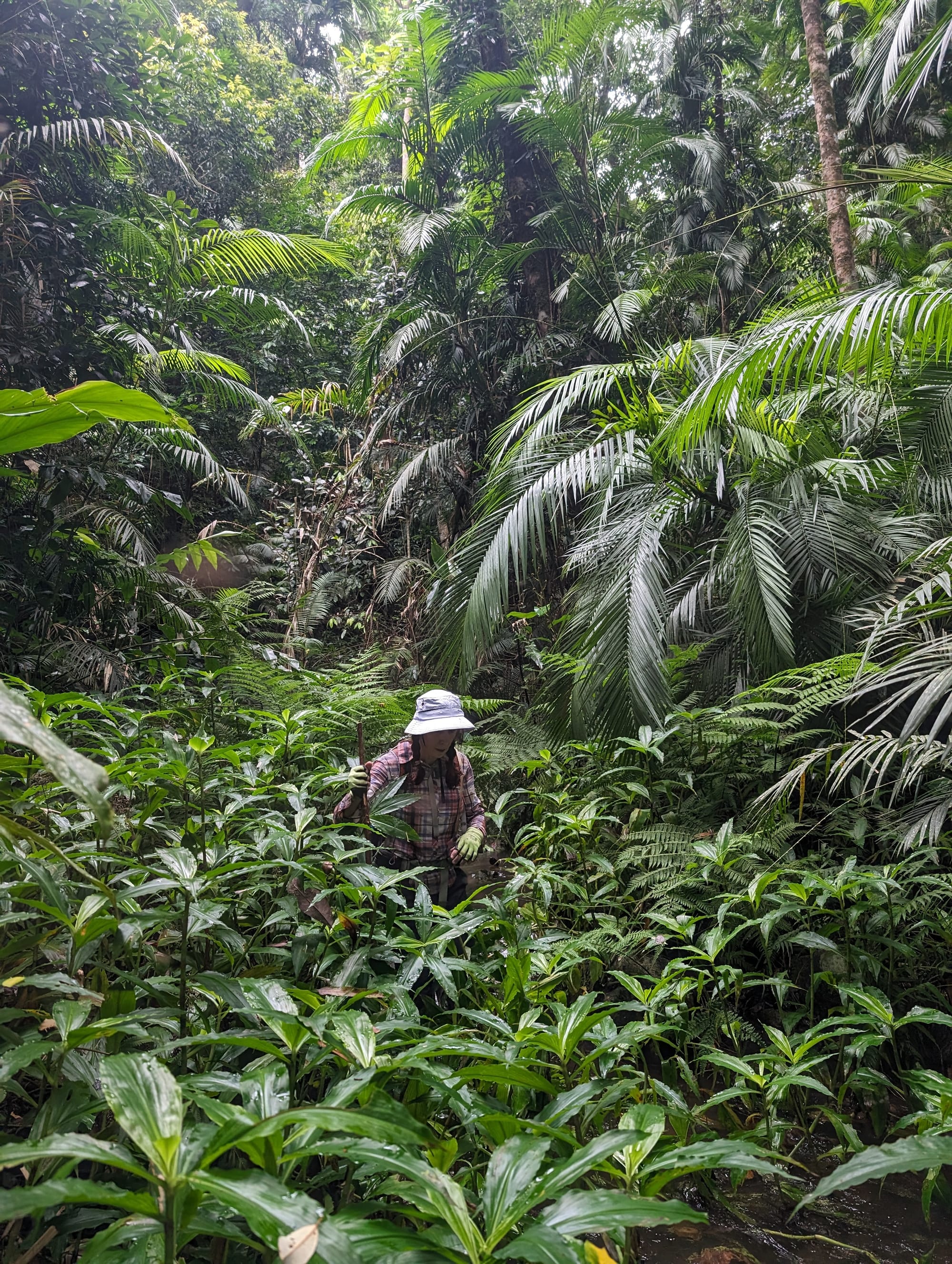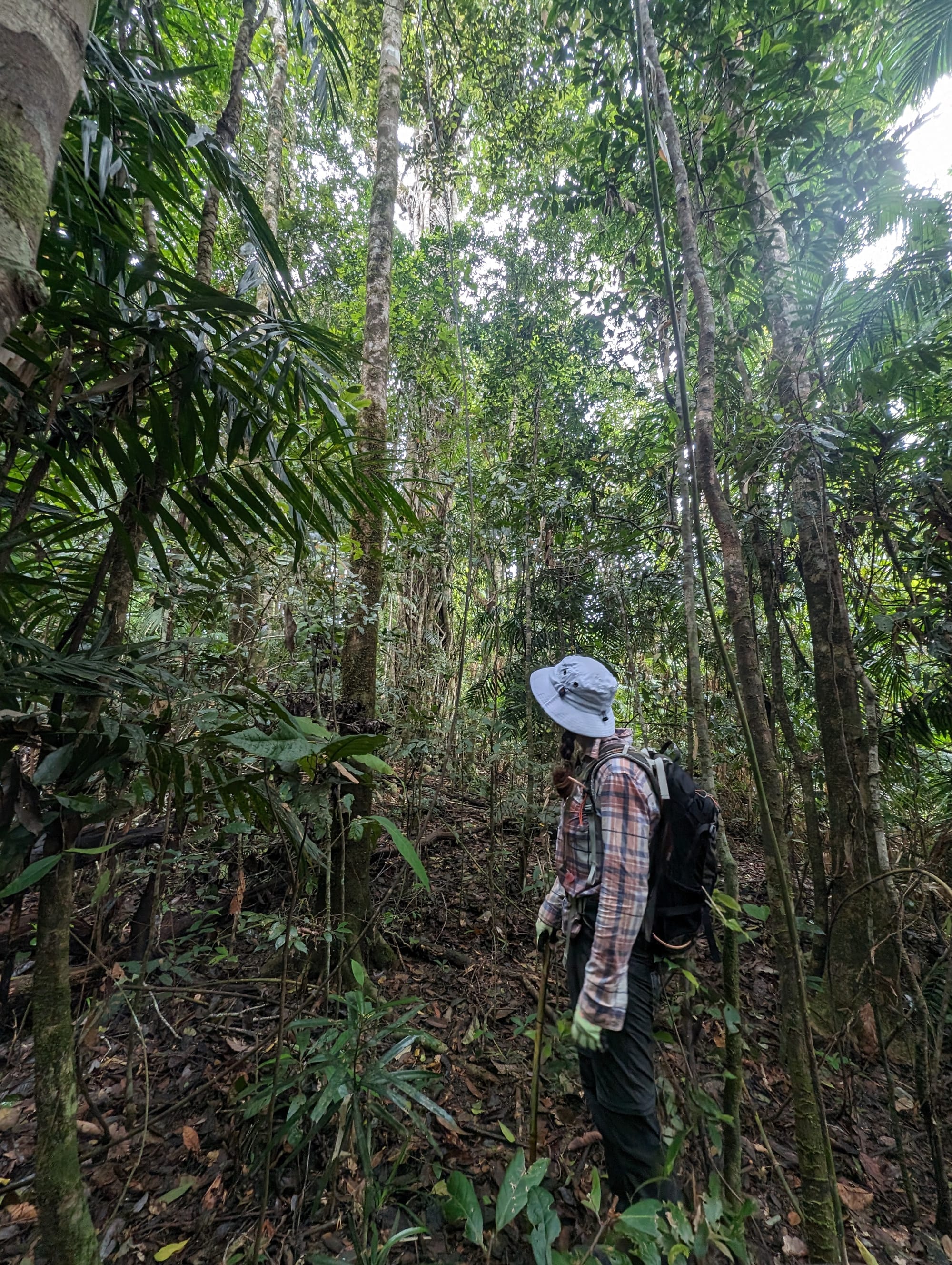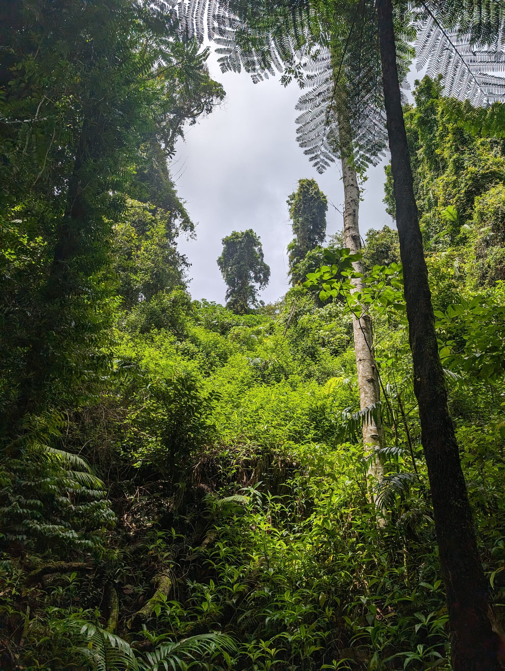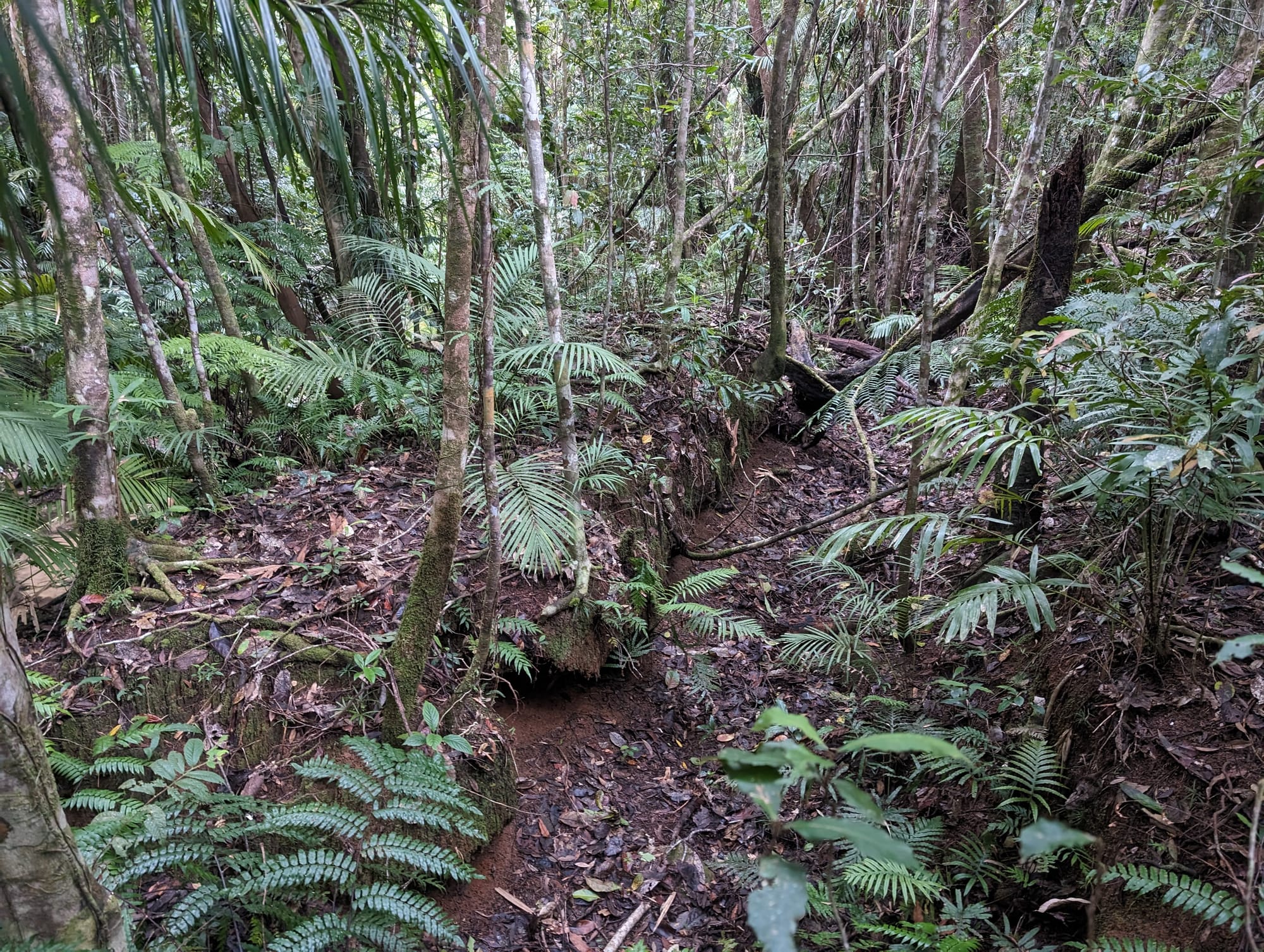 Finally, we made the call to turn around rather than push on. We chose a different exit route and headed straight up a ridgeline, which turned into another tough bash through very thick rainforest. It was slow, steep, and fatiguing work, but eventually we regained the track.