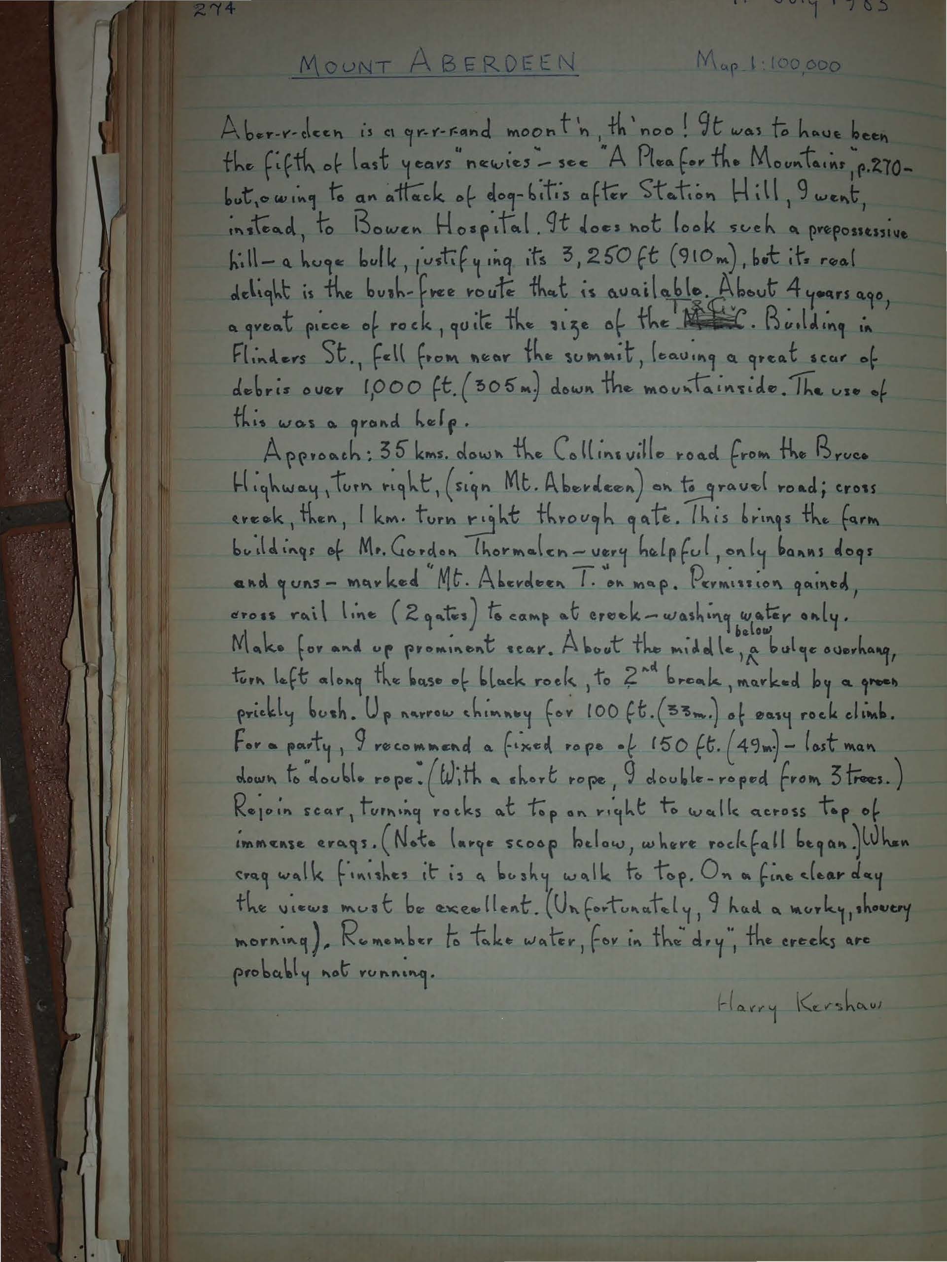 Approach: 35 kms. down the Collinsville road from the Bruce Highway, turn right, (sign Mt. Aberdeen) on to gravel road; cross creek, then, 1 km. turn right through gate. This brings the farm buildings of Mr. Gordon Thormalen - very helpful, only banns dogs and guns - marked "Mt. Aberdeen T." on map. Permission gained, cross rail line (2 gates) to camp at creek - washing water only.