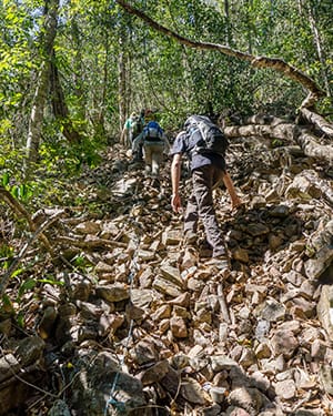 Much of the bushwalk at lower altitudes is in, or alongside, a rocky and boulder-strewn jungle creek. Along the way there are some small gorges, waterfalls and cascades. Note: At present (October 2015) there is no flowing water in the creek.
