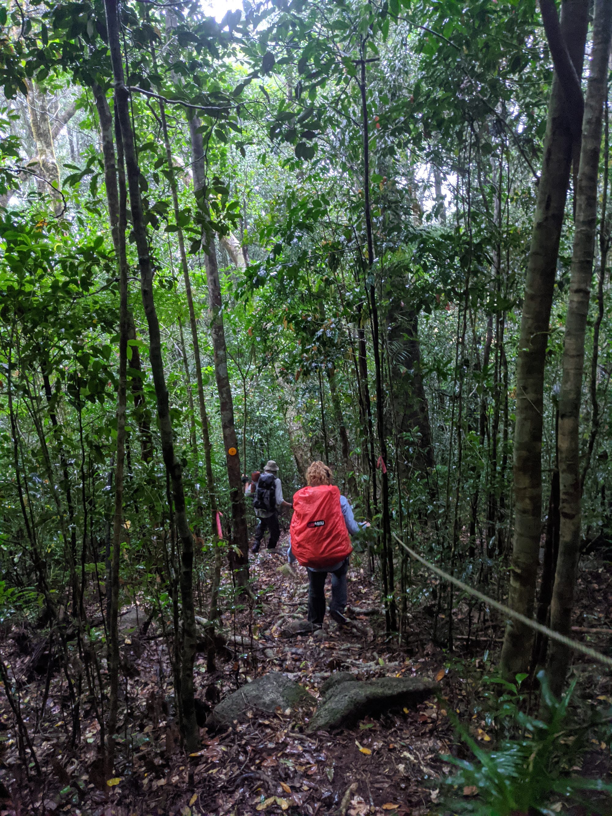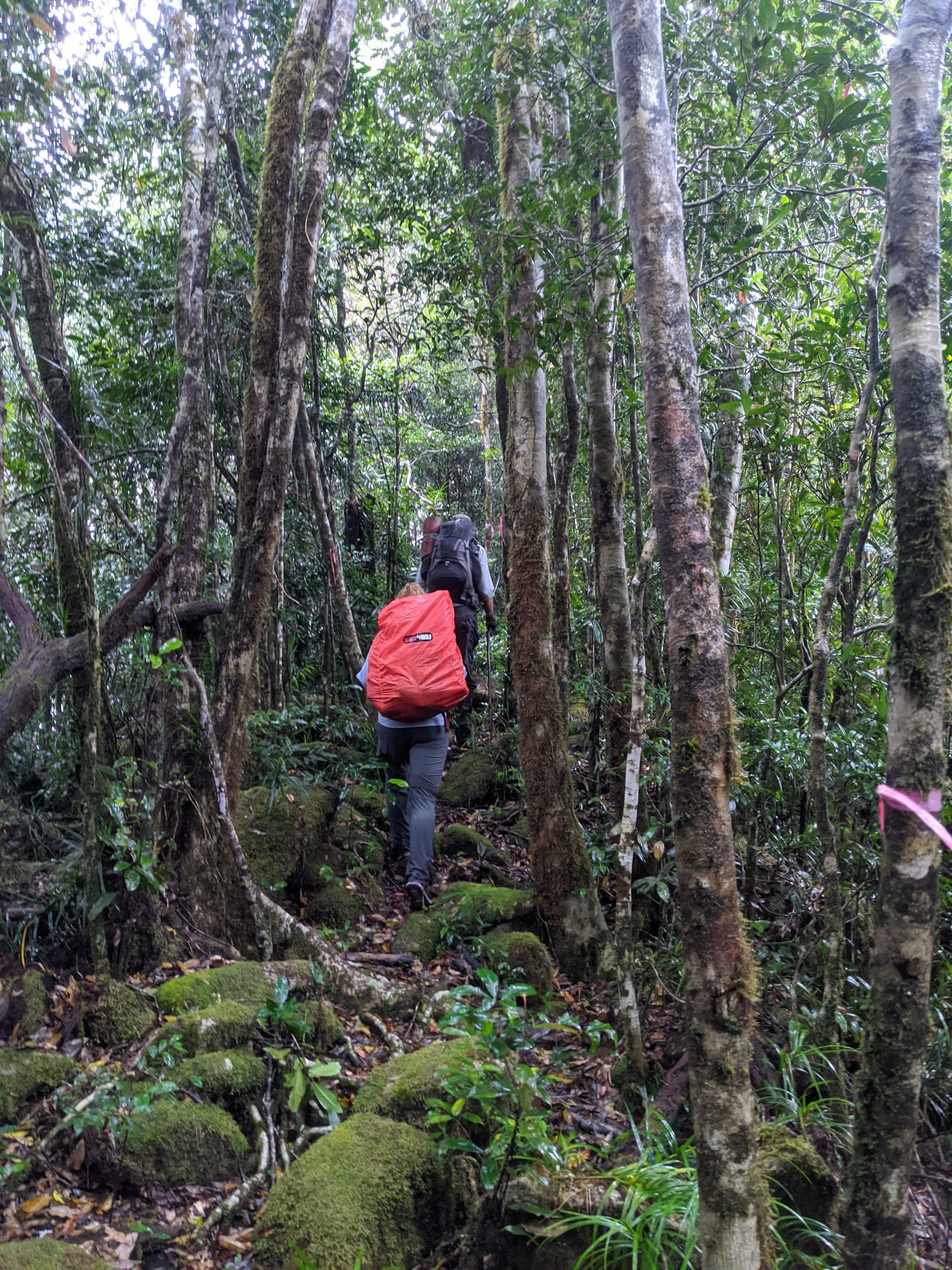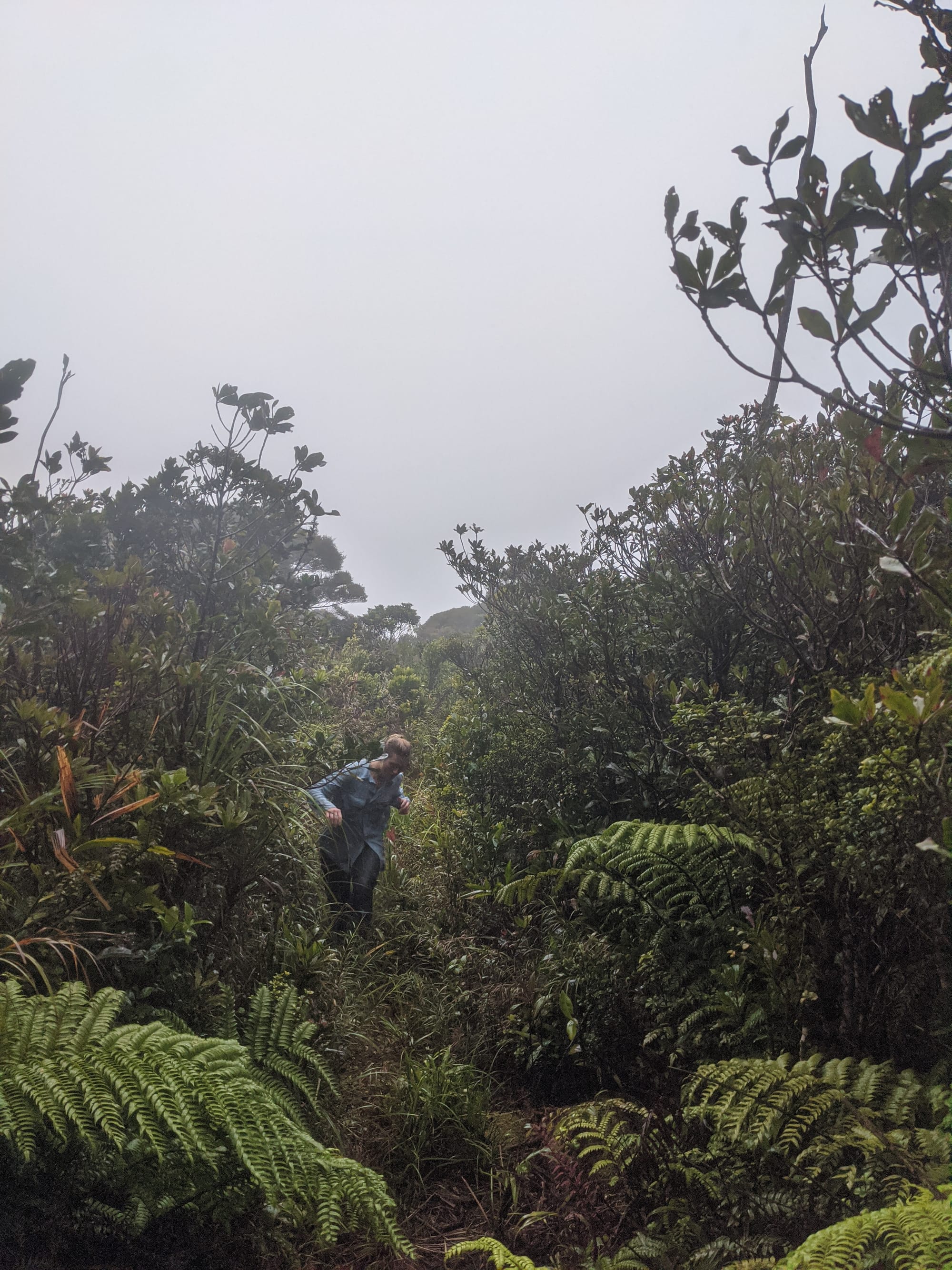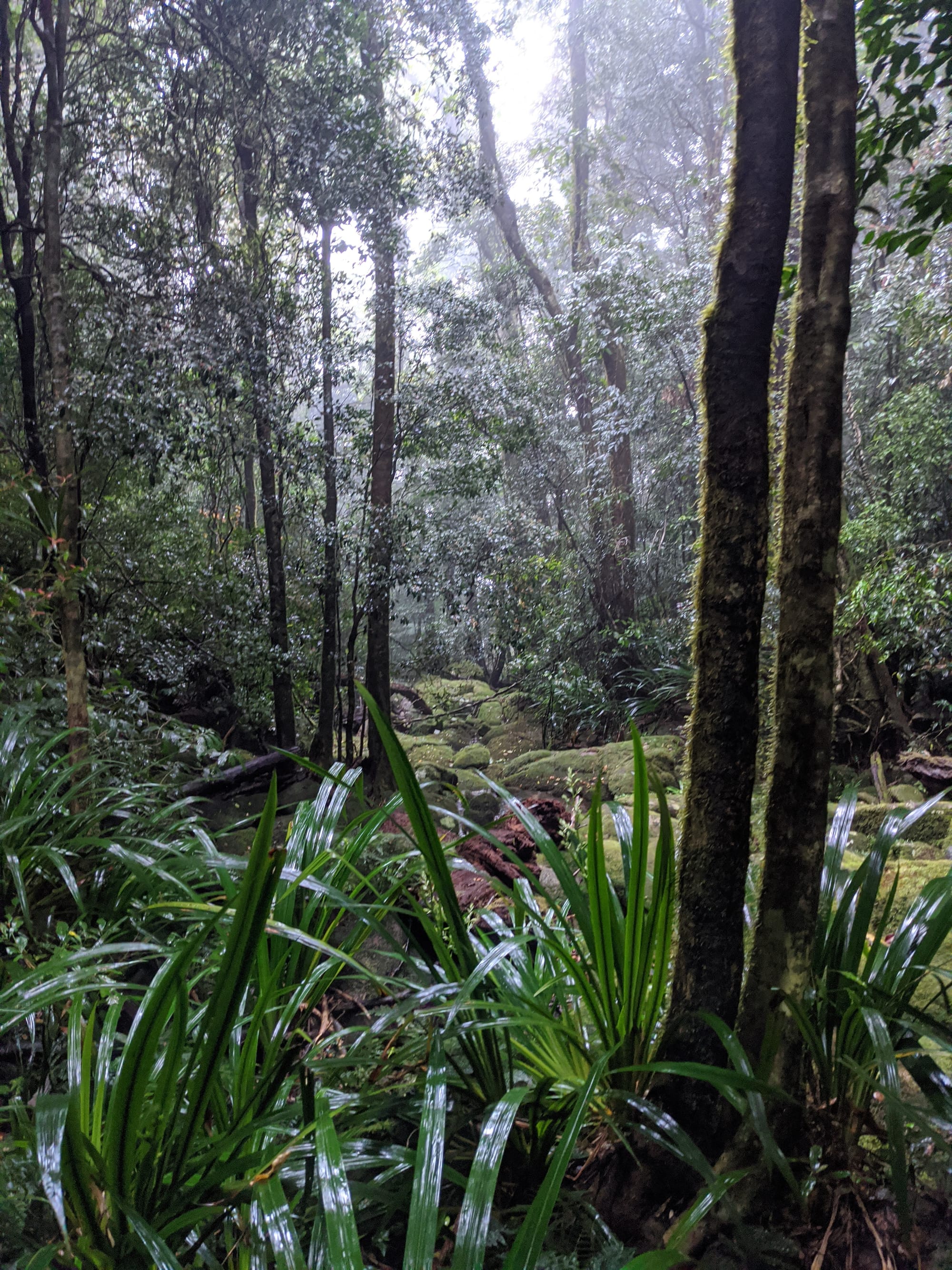 From the outset, this was a wet walk. Rain fell for much of the trip, and the mountain lived up to its reputation for being damp, muddy, and misty. The rainforest was dripping, the track was slippery, and the views were mostly hidden behind clouds. Although we knew there were big landscapes all around us, we only caught brief hints of them through the mist.