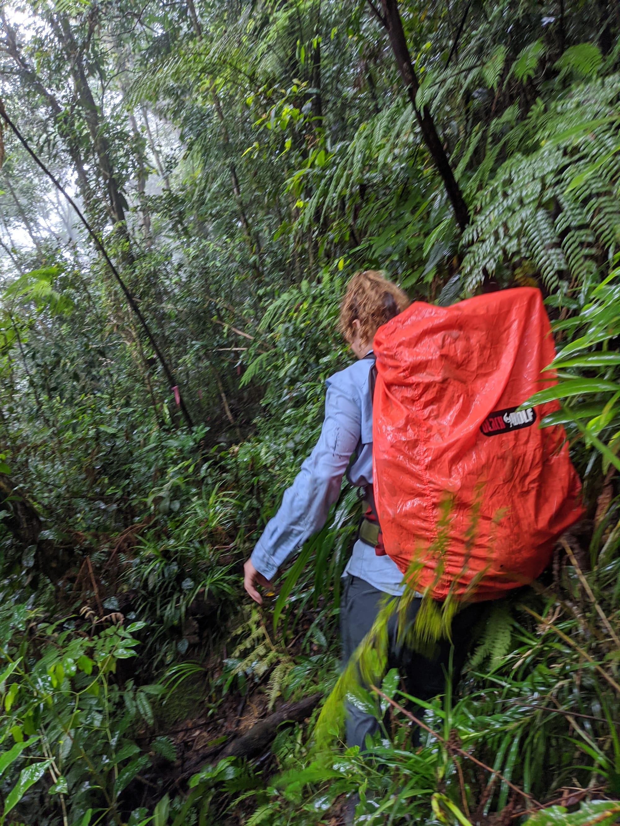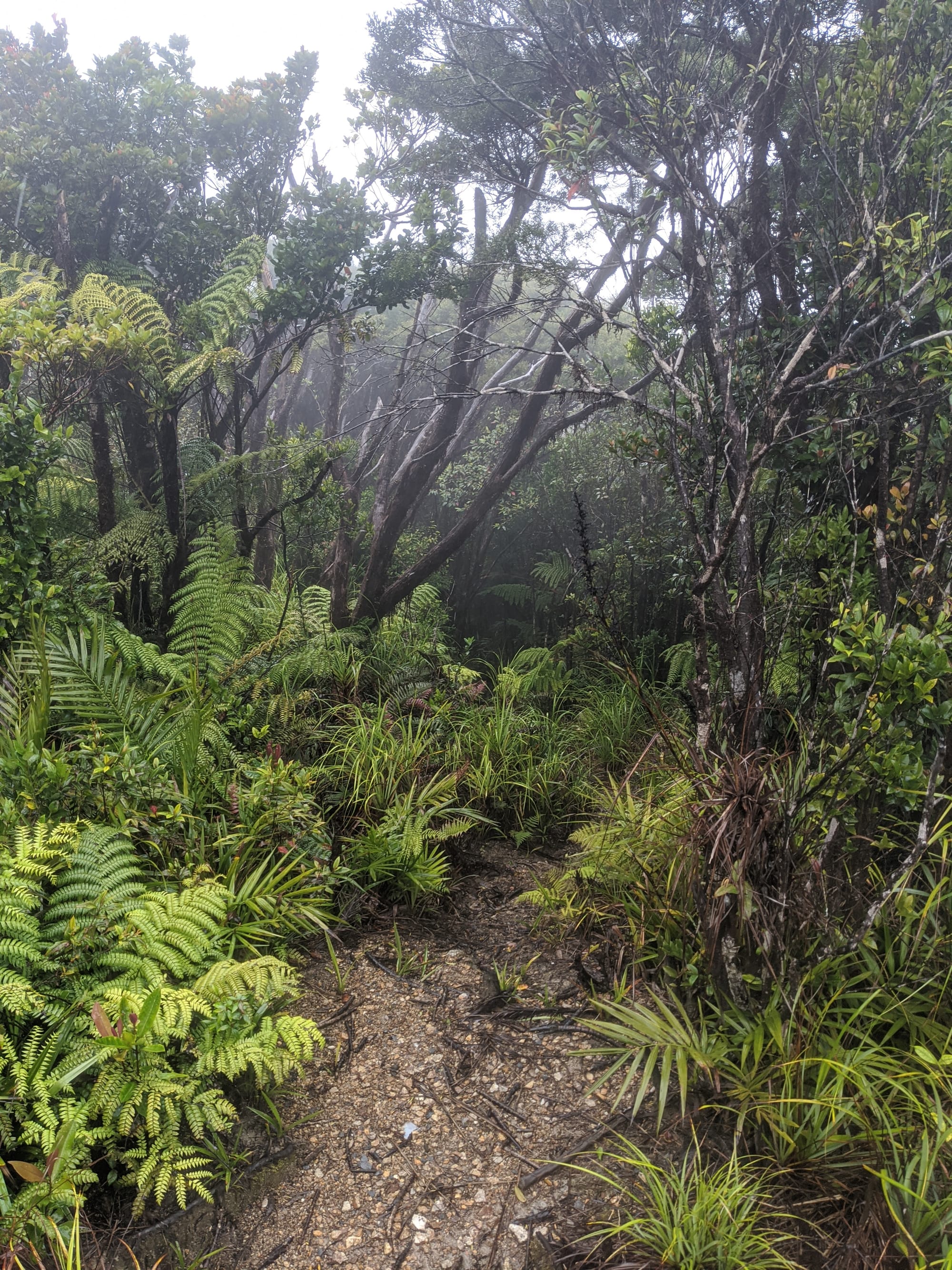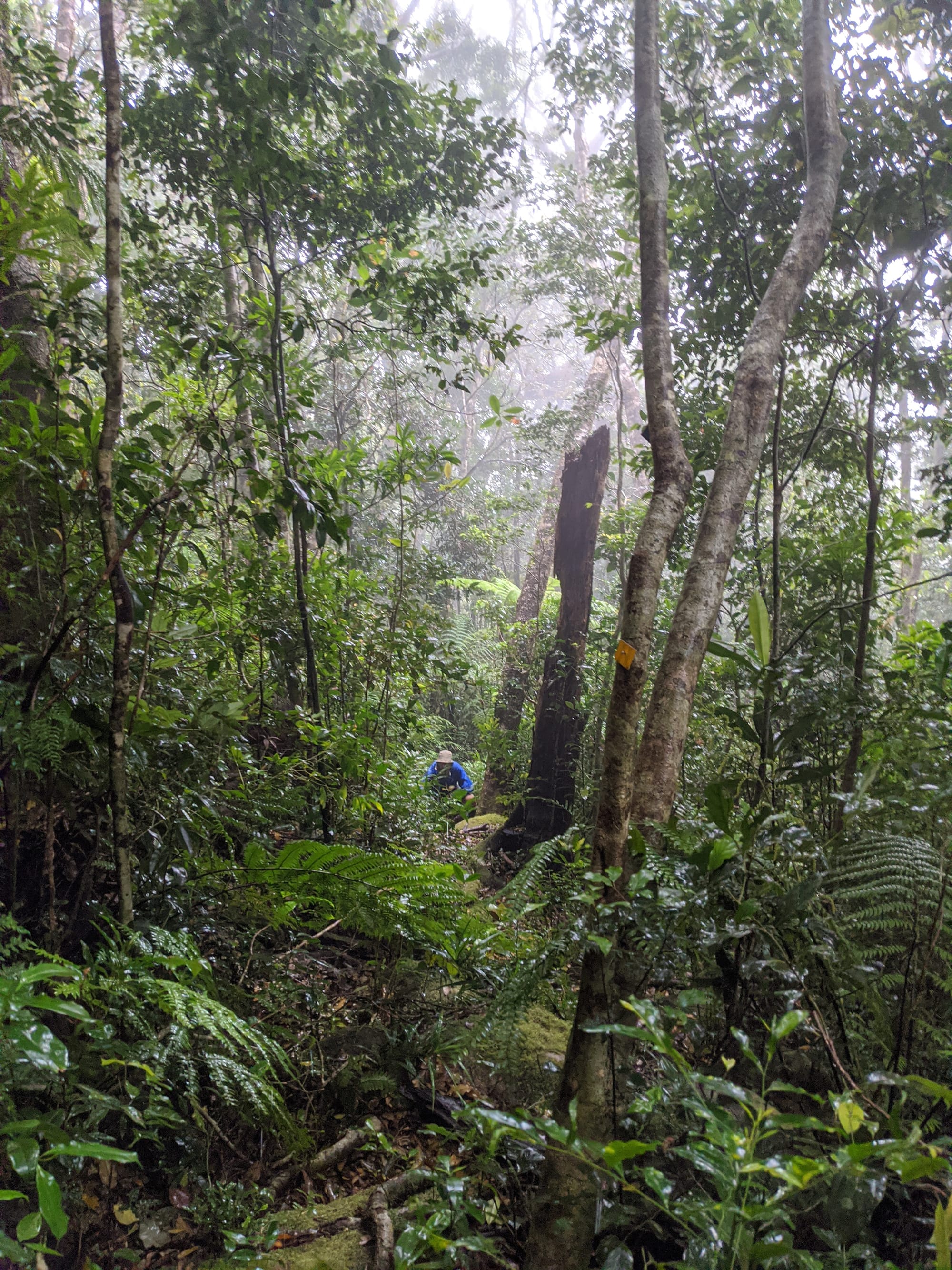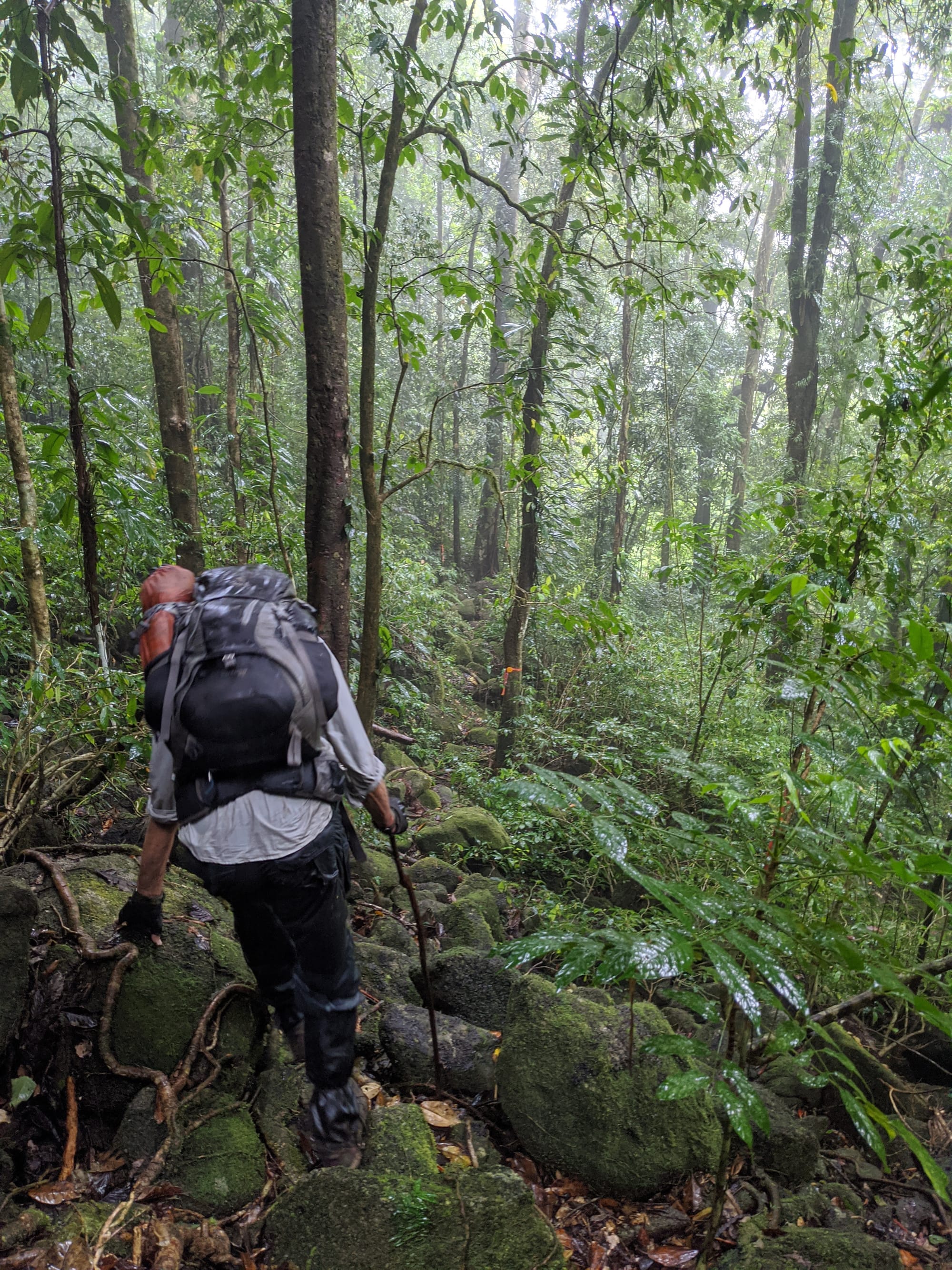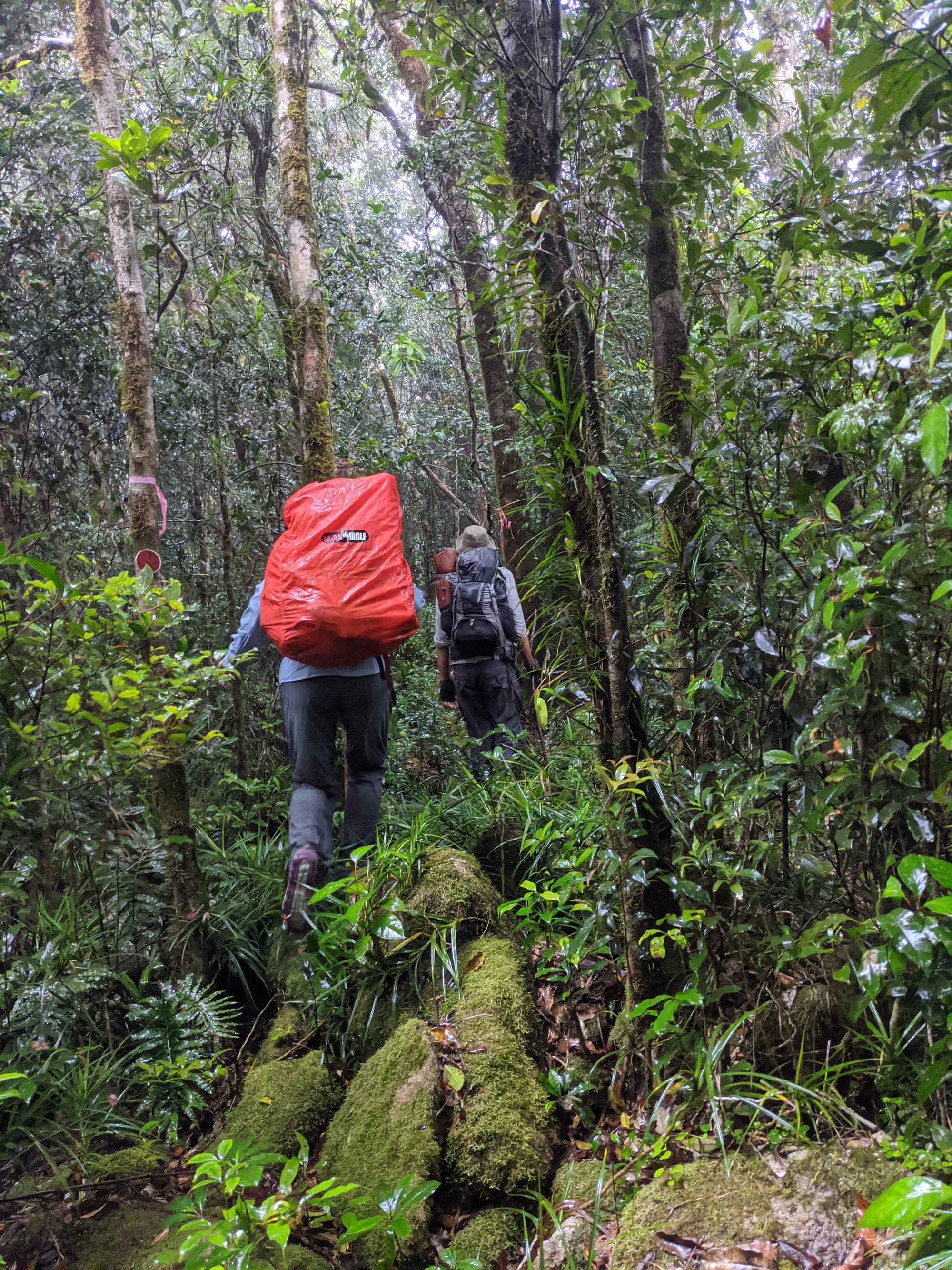 From the outset, this was a wet walk. Rain fell for much of the trip, and the mountain lived up to its reputation for being damp, muddy, and misty. The rainforest was dripping, the track was slippery, and the views were mostly hidden behind clouds. Although we knew there were big landscapes all around us, we only caught brief hints of them through the mist.