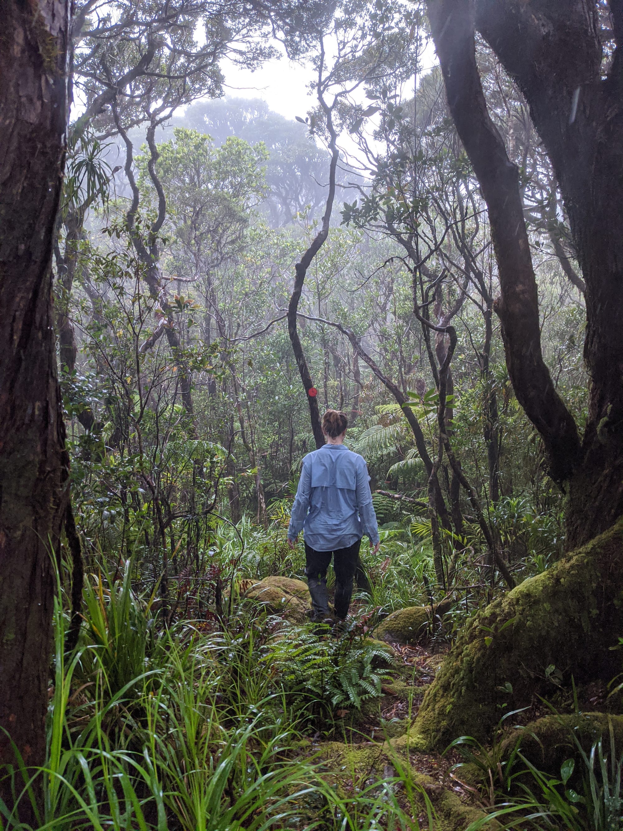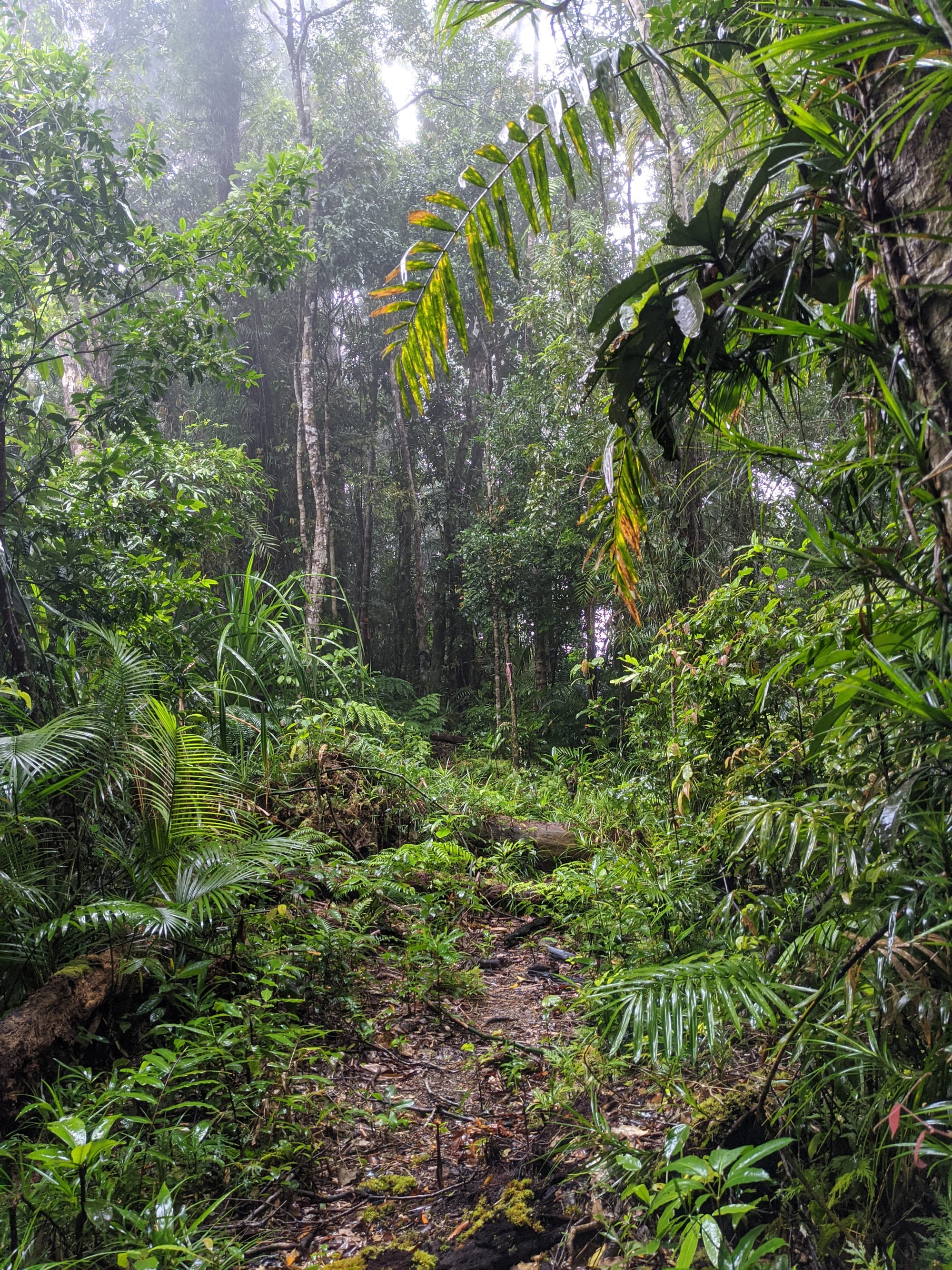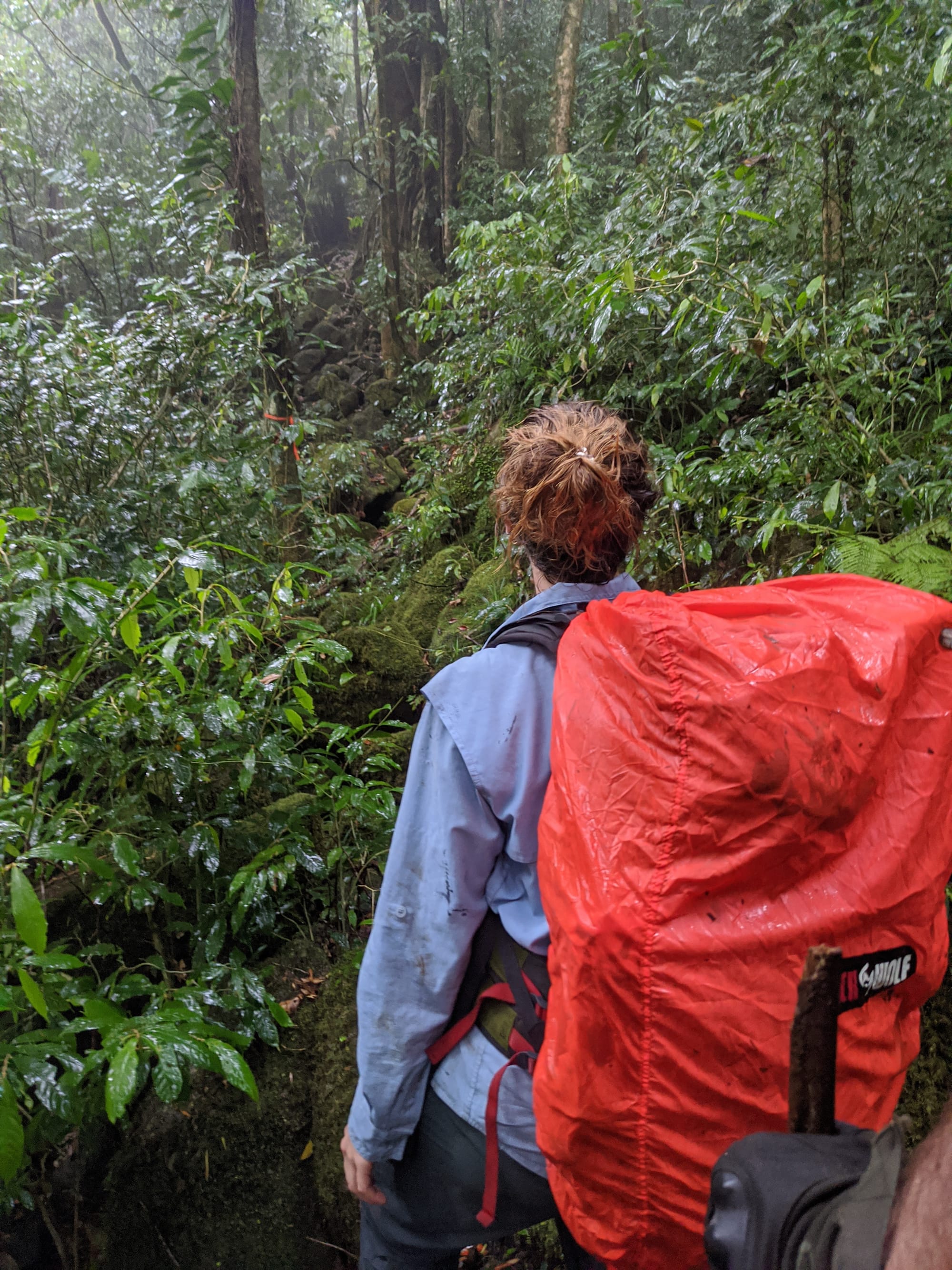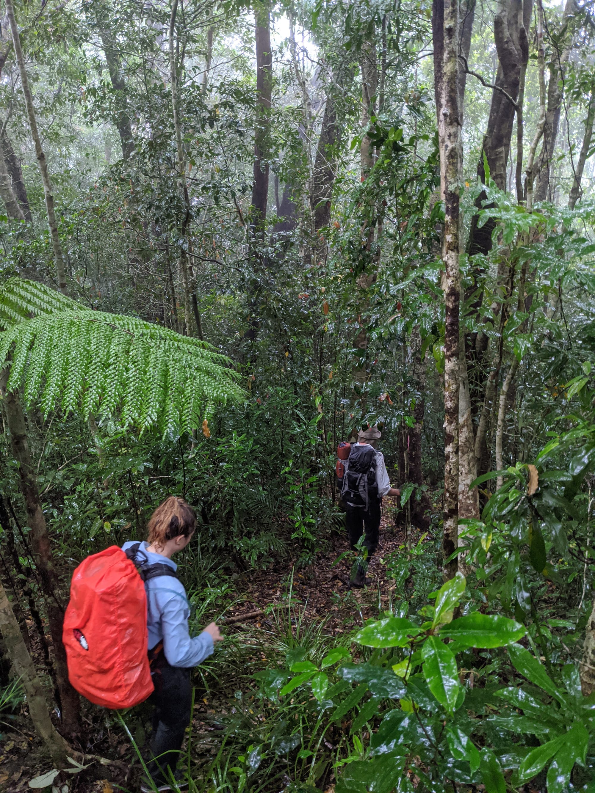From the outset, this was a wet walk. Rain fell for much of the trip, and the mountain lived up to its reputation for being damp, muddy, and misty. The rainforest was dripping, the track was slippery, and the views were mostly hidden behind clouds. Although we knew there were big landscapes all around us, we only caught brief hints of them through the mist.