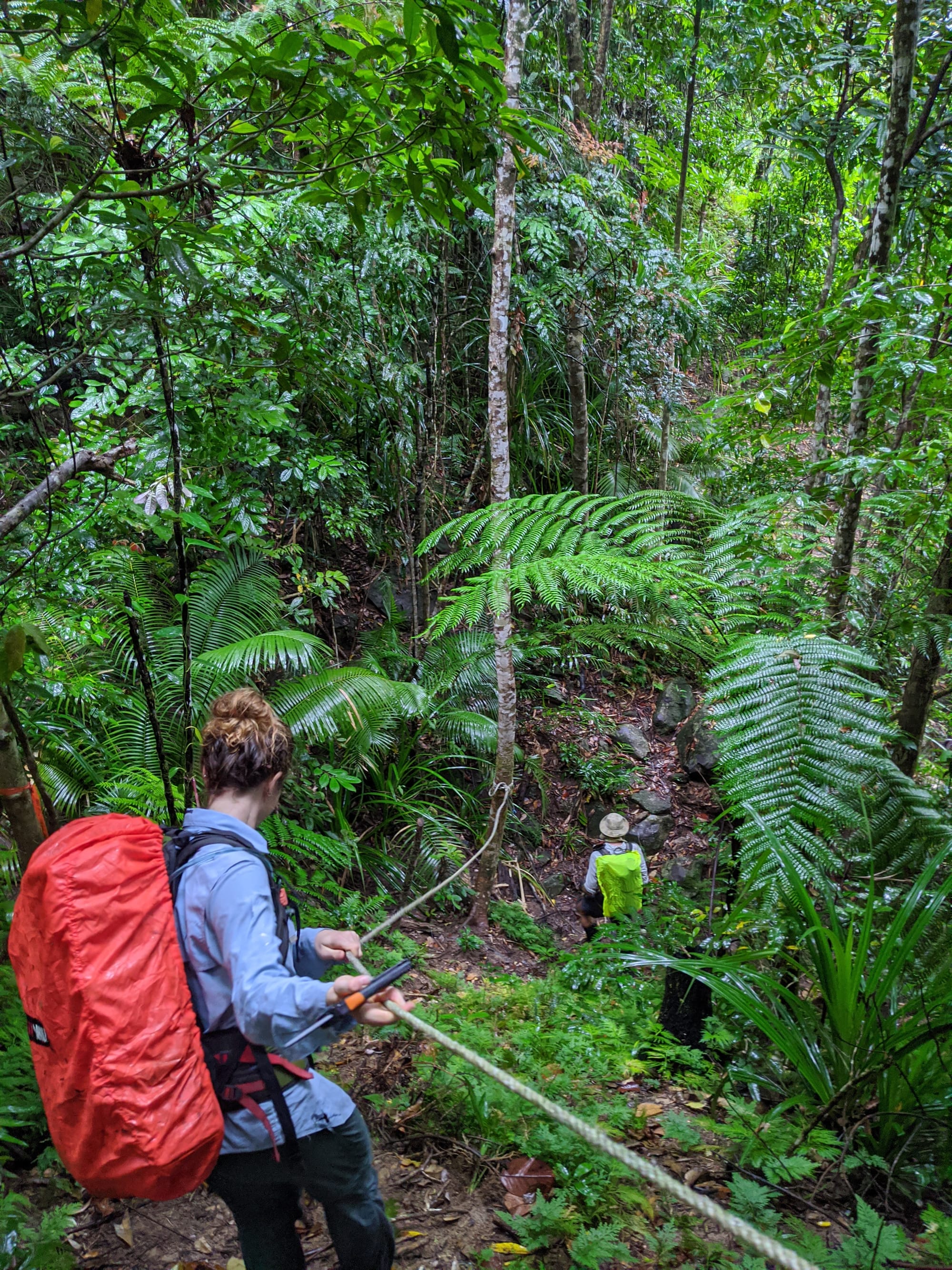 The route climbed steadily and relentlessly through thick Wet Tropics rainforest on a rough, sometimes overgrown track. We stopped at the water refill points on the way up and carried secateurs, cutting back vegetation as we went to help keep the route open. Leeches made occasional appearances, adding to the classic Bellenden Ker experience.