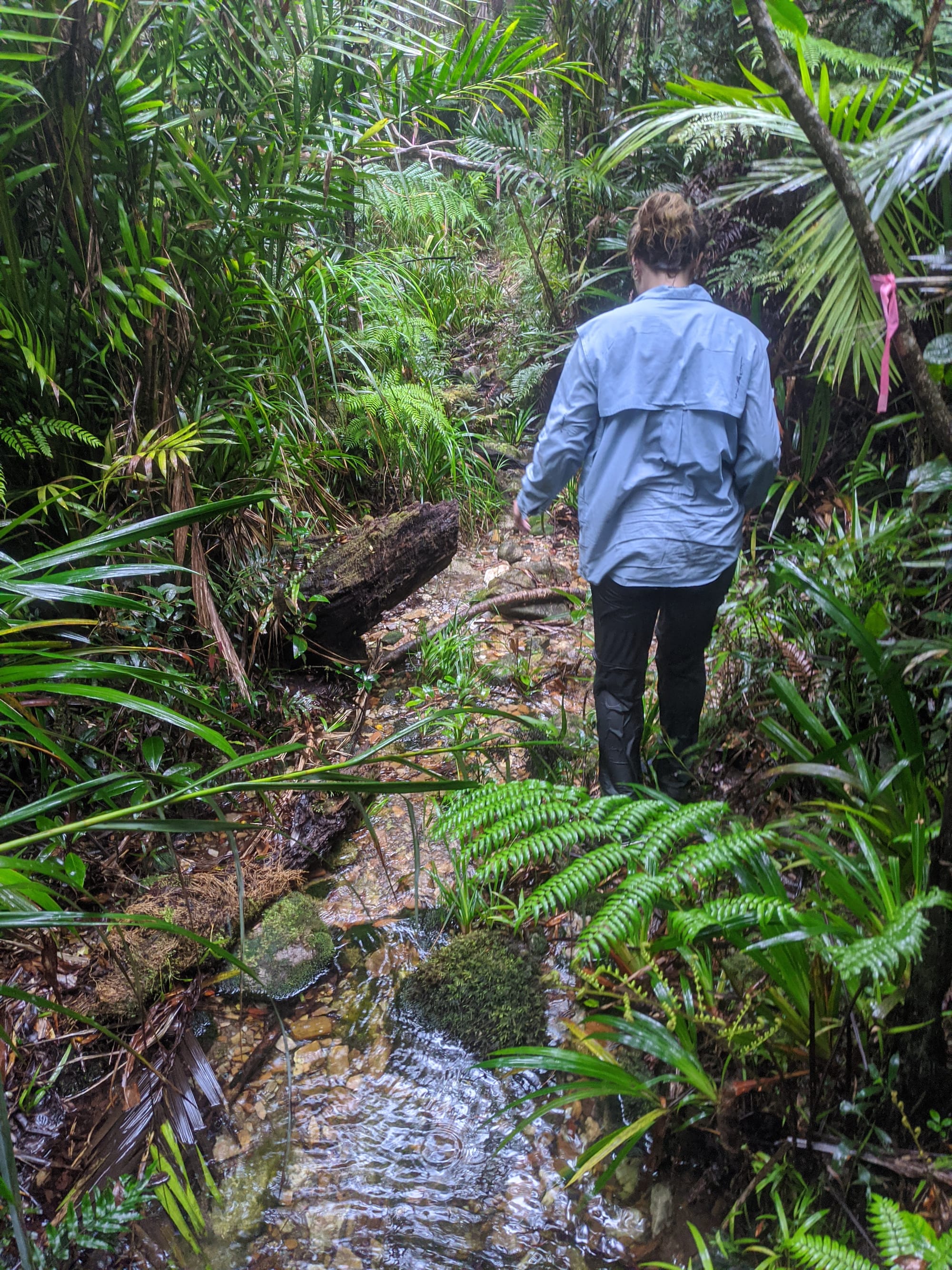 By this point Graeme had had enough of the climb and sensibly decided to turn back and rest, while Luen and Anneliese continued on to the summit. From there, the route followed the summit ridgeline across to the true top, passing small streams that were flowing well thanks to the constant rain. Even right near the summit there was plenty of water about, and the whole ridge had that quiet, soaked, cloud-forest feel that makes this mountain so memorable.