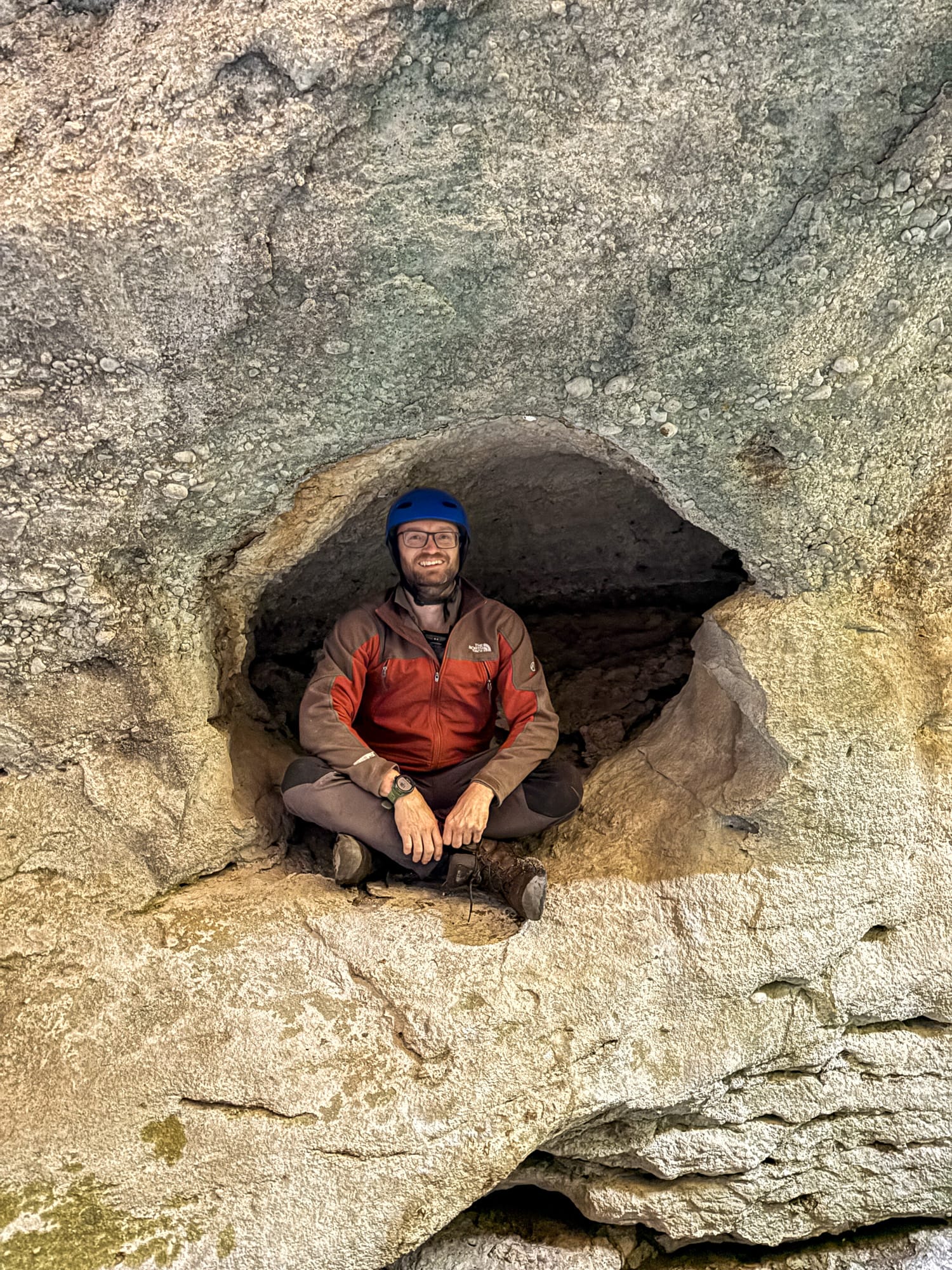 Beyond that, we reached Morning Glory—a beautiful, narrow slot that begs an upstream exploration from below. Helmets on, headlamps lit, we waded in: icy water to the chest/neck for the tall folk, proper gasp-inducing stuff. Polished walls, echoing drips, grins all round.