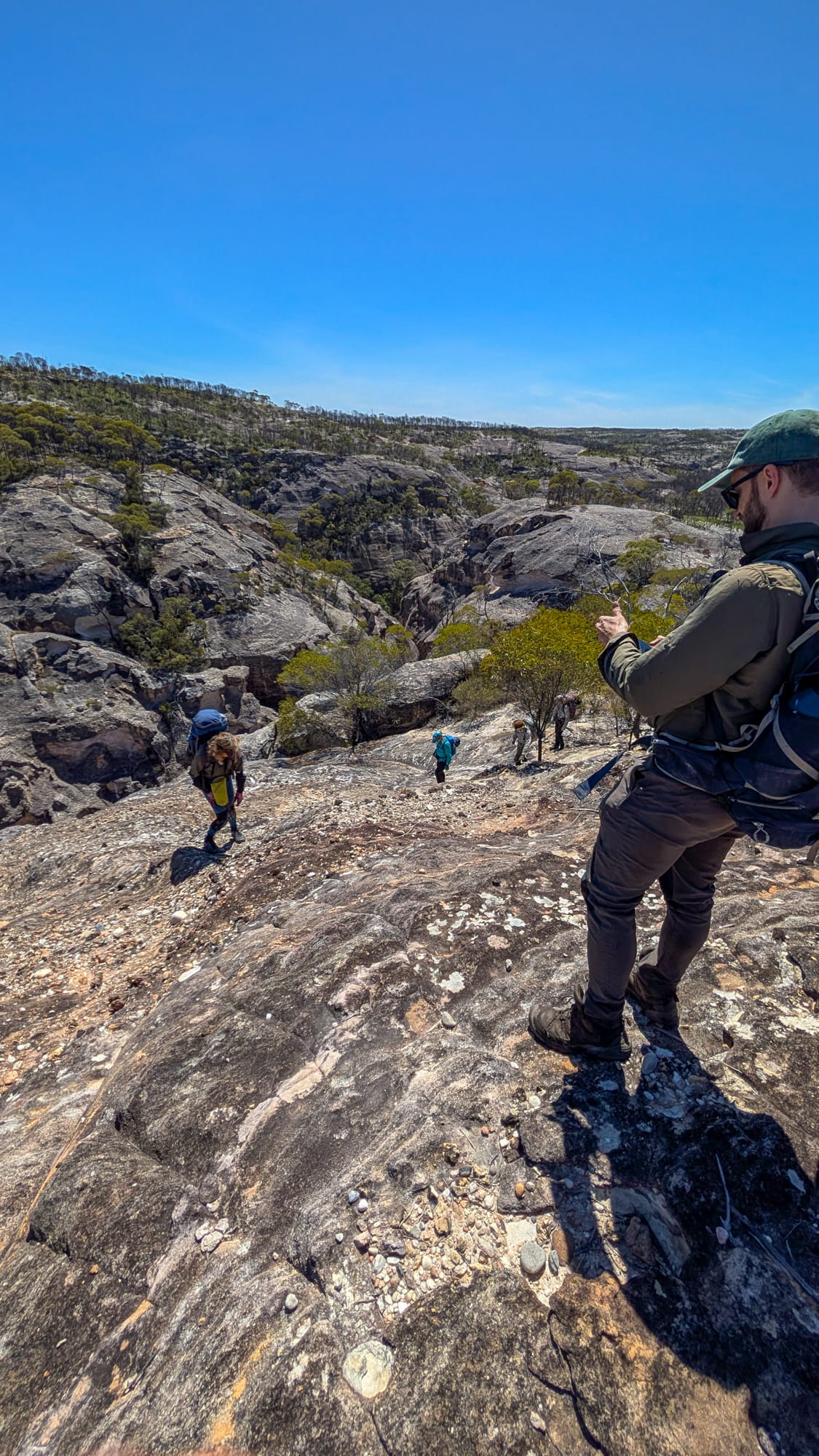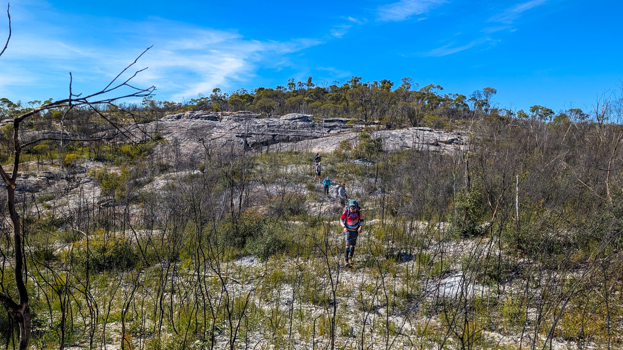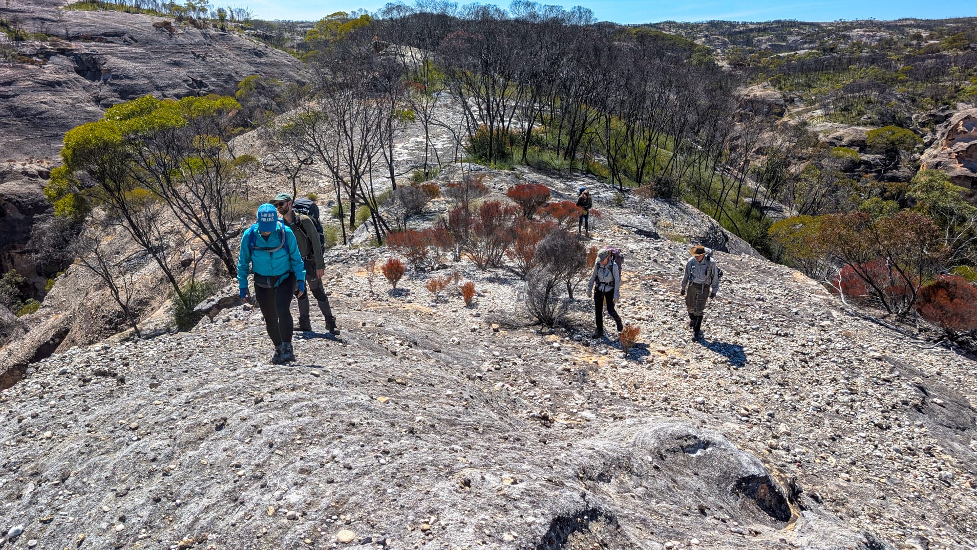 Six of us set off. The plan was simple: off-track through open bush, then along broad sandstone ridges to reach Naga Canyon. The ridges were a joy—pebble-armoured caps with the occasional undercut edge that kept us honest (stay well back). After last September's fierce burn, much of the scrub was thinned, so we strode across pale rock with big skies and bigger views. A light breeze, blue patches, and just-right temps—goldilocks conditions.