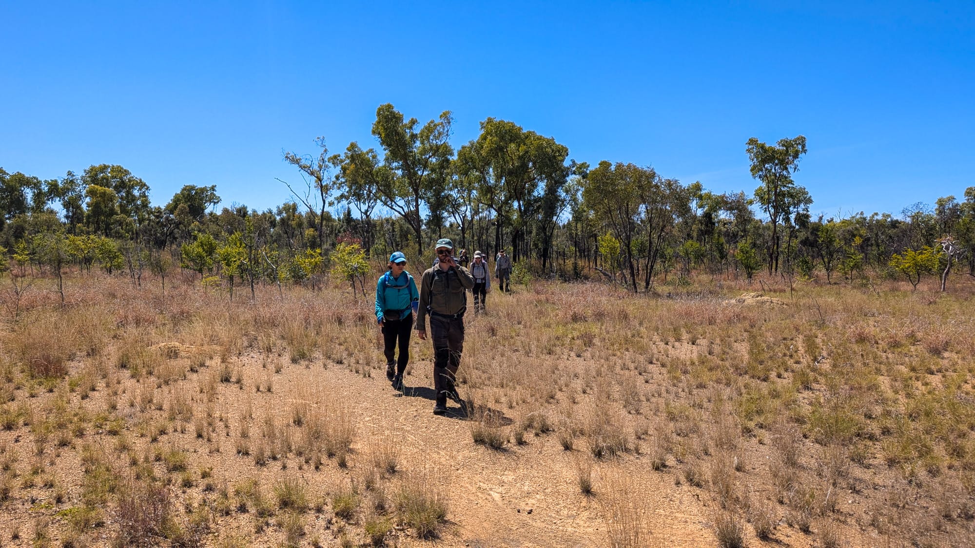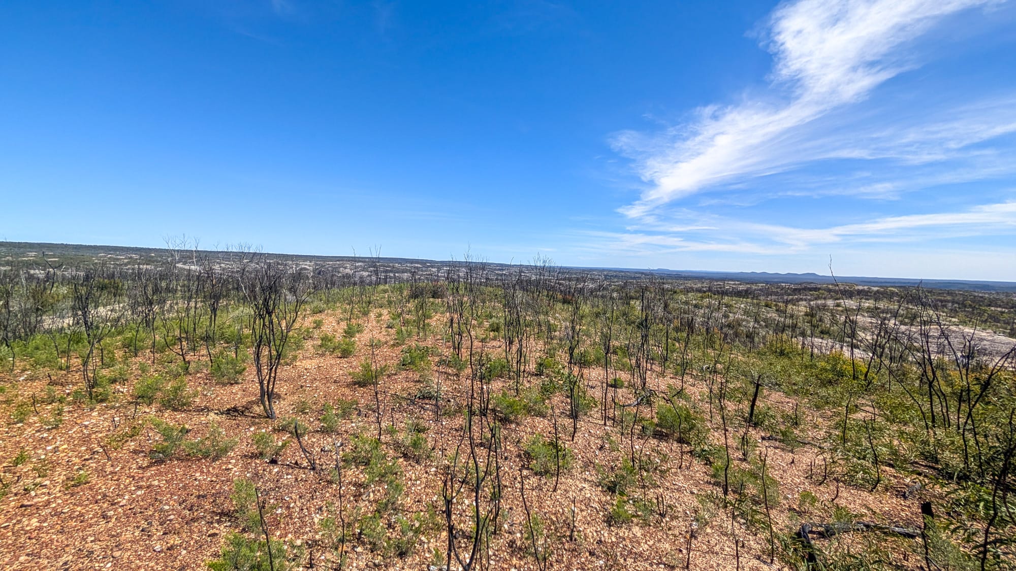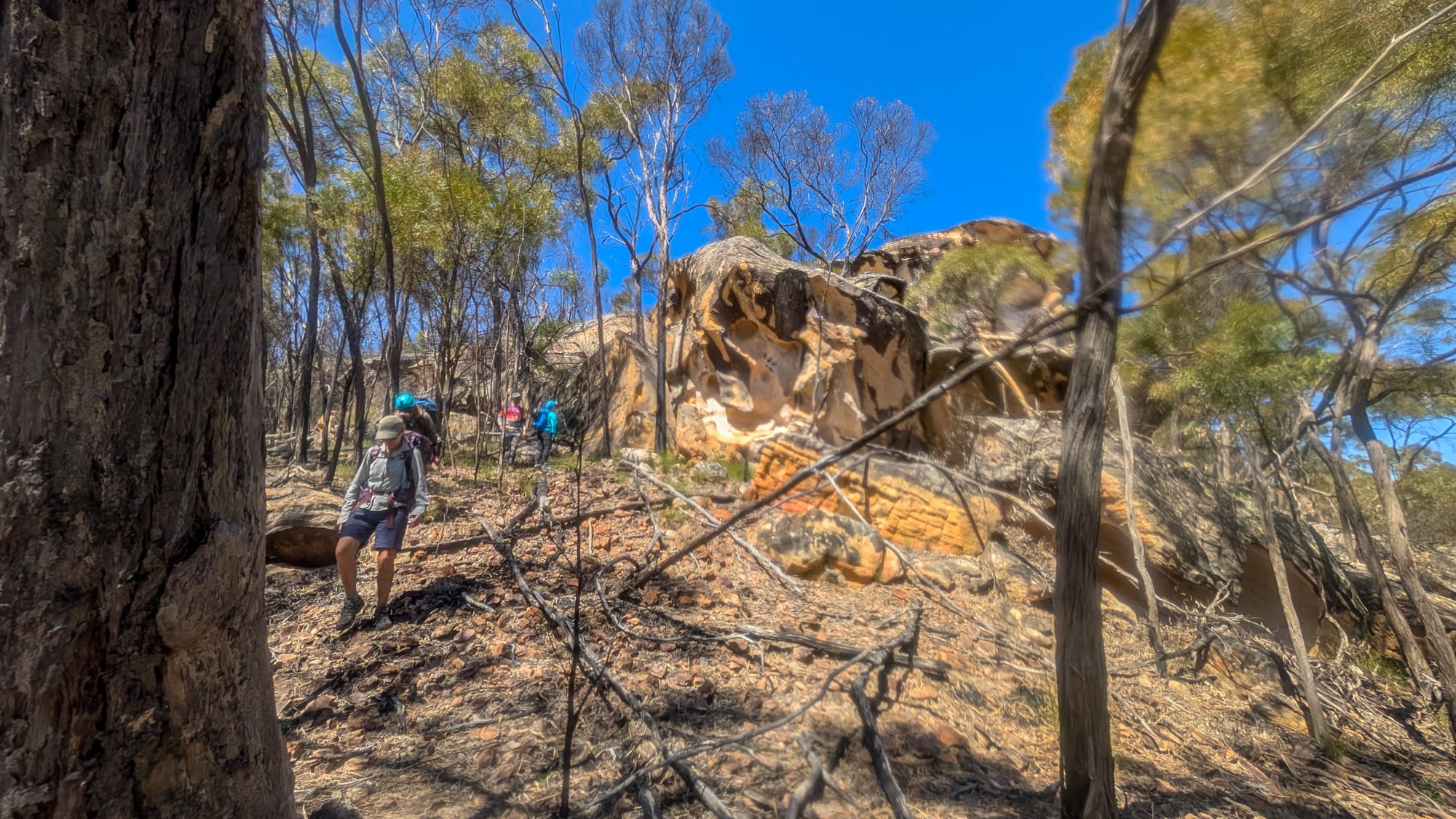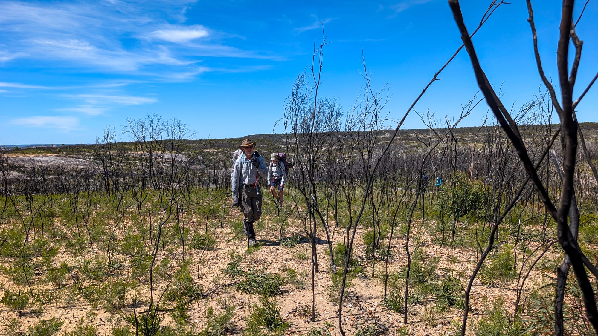 Six of us set off. The plan was simple: off-track through open bush, then along broad sandstone ridges to reach Naga Canyon. The ridges were a joy—pebble-armoured caps with the occasional undercut edge that kept us honest (stay well back). After last September's fierce burn, much of the scrub was thinned, so we strode across pale rock with big skies and bigger views. A light breeze, blue patches, and just-right temps—goldilocks conditions.