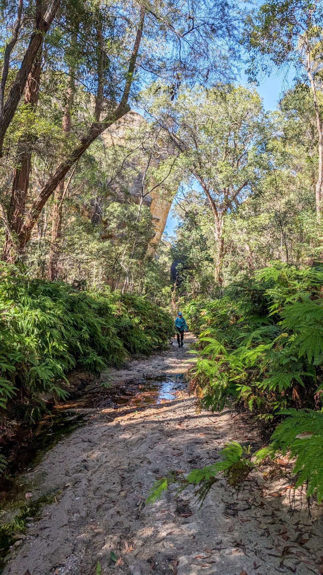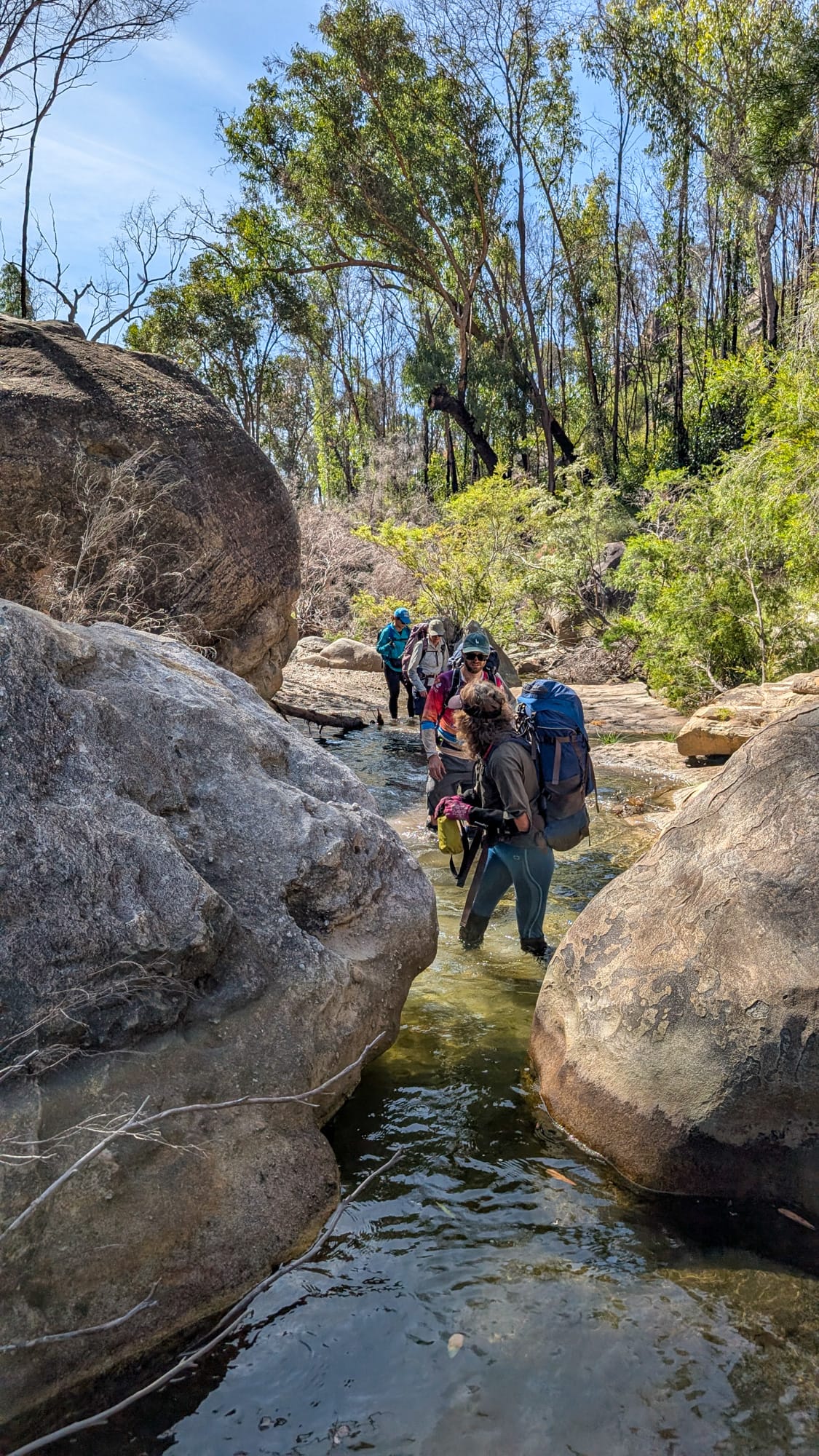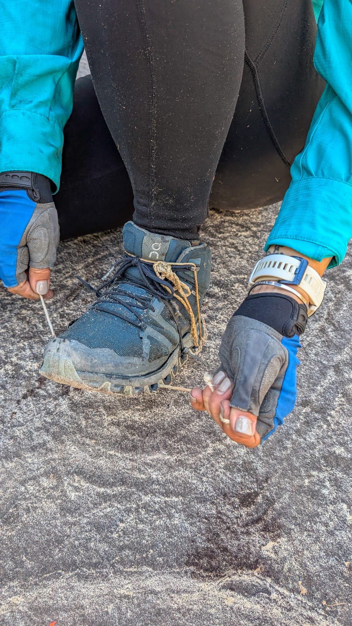 Somewhere in there, Jodie’s shoes began to fall apart. Two zip ties helped, then Luen trimmed a metre off the end of his static rope and teased out the core strands—instant cordage. Bushwalking couture, held together with prusik guts. It lasted… long enough.