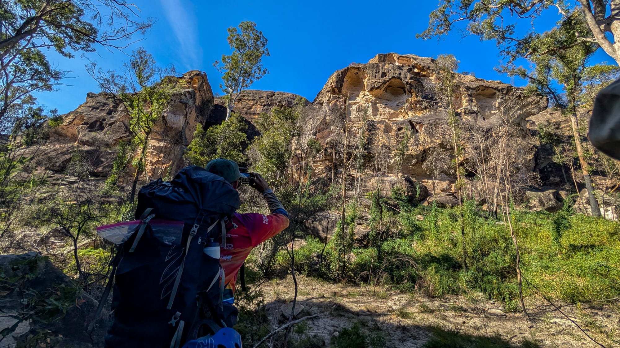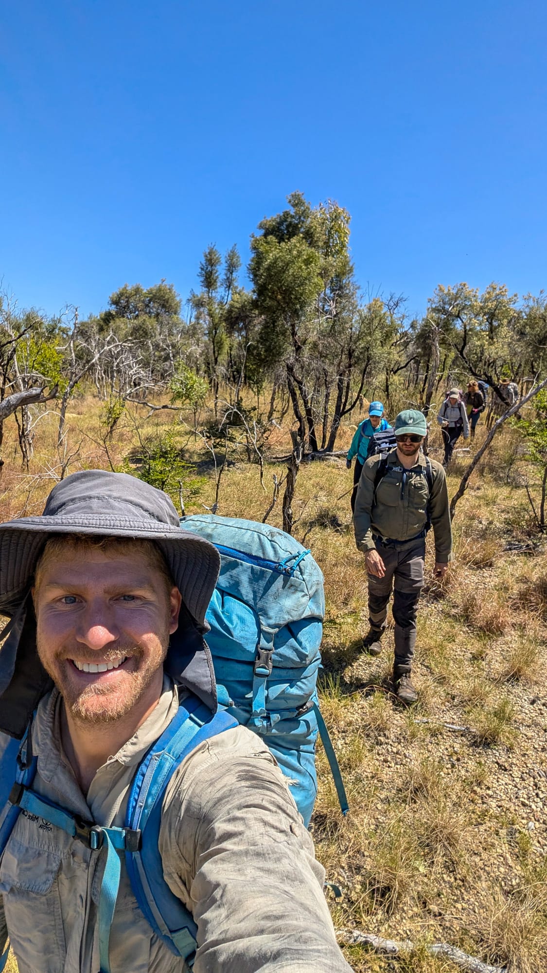 Up top, we were rewarded with sweeping views into the gorges and across a quilt of pale rock and burnt country. We followed the ridge, brushed through low shrubby heath, skirted a big orange knoll, and made the final push across open bush to meet the dirt road. A dirt trudge later, the cars appeared like mirages that actually work.