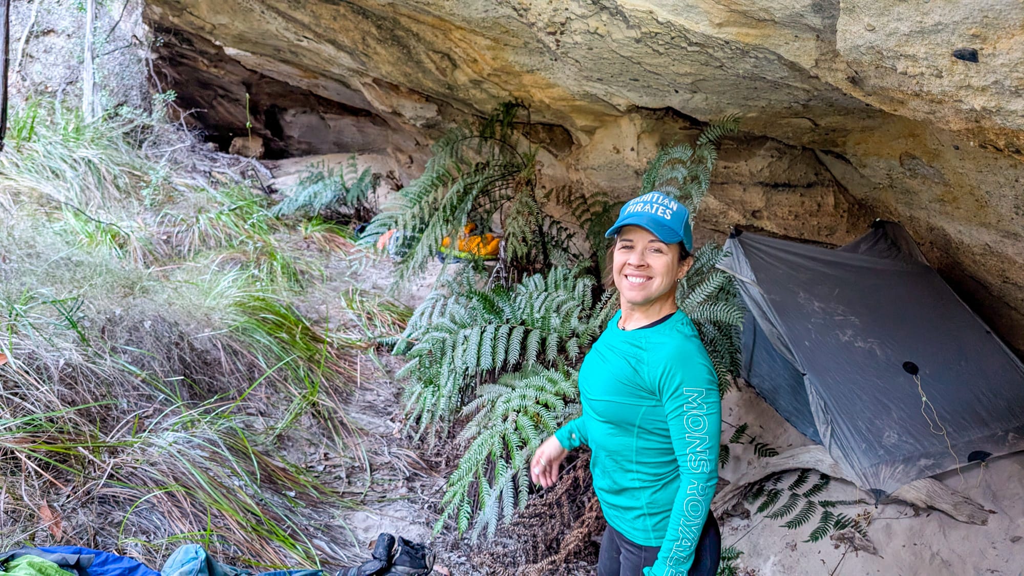After the exploration, we returned to the bags and pushed on to camp at a creek confluence. We cruised past a few superb sandy beaches (filed mentally as “next time”) to reach Luen’s marked spot… which turned out to be a small overhang with hard, dusty sand and thick scrub nearby. A couple of tents squeezed in after some gentle gardening; others bivvied under the lip with thin dusty powder. Someone even produced a camp chair, which tried its best on the lumpy ground. Stars were excellent; sleep, patchy but content.