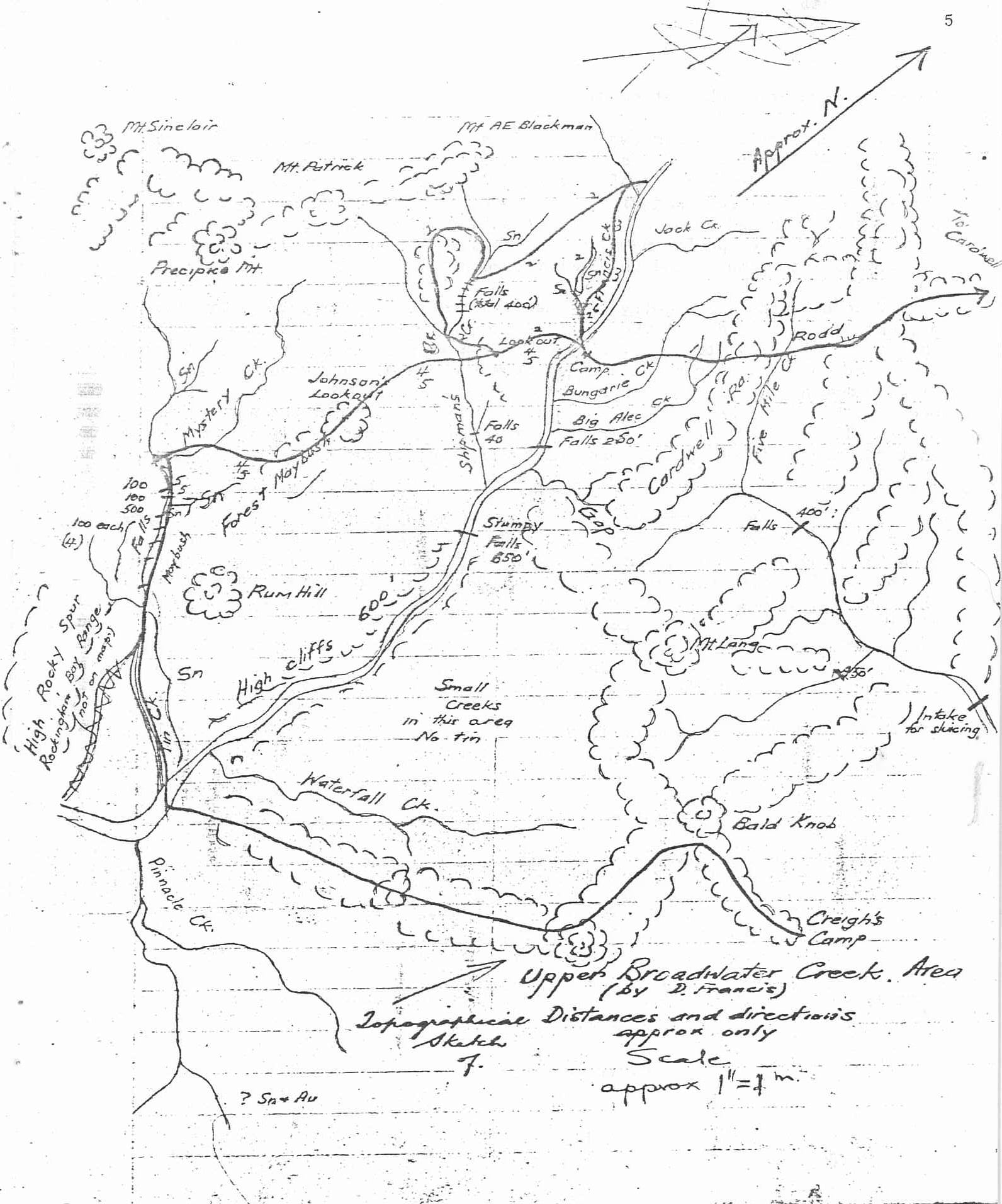 I doubt that this country has been explored in any detail even to the present time. Some idea of the ruggedness of the terrain can be imagined from the following description: " Tin Creek is the largest tributary of Broadwater Creek and runs S.E. for about 4 miles from the claim. In its upper reaches it is comparatively flat, then a series of seven falls totalling some 1100 ft occur within a further mile, below which the creek runs through a gorge with steep walls for approximately one mile to join the Broadwater Creek". Note that the modern topographical maps mark the original Tin Creek as Shipman's Creek.